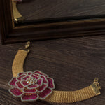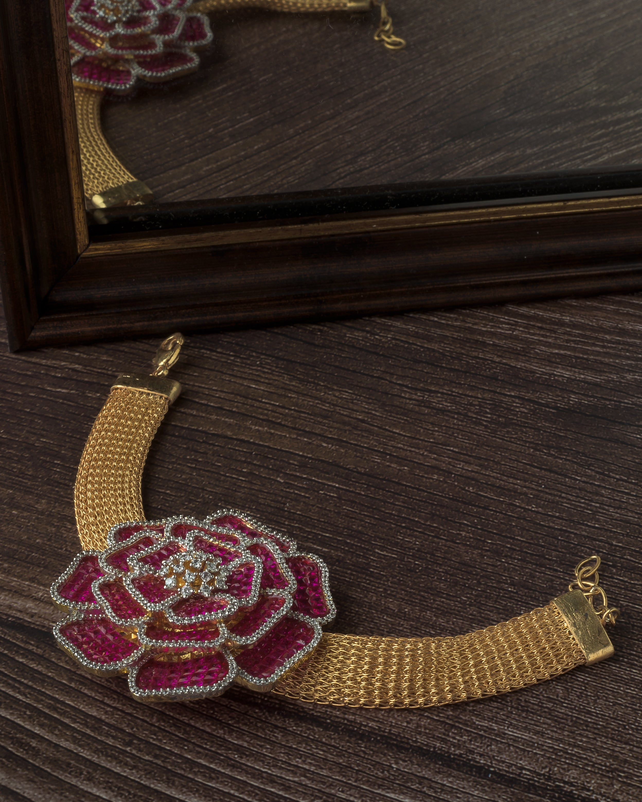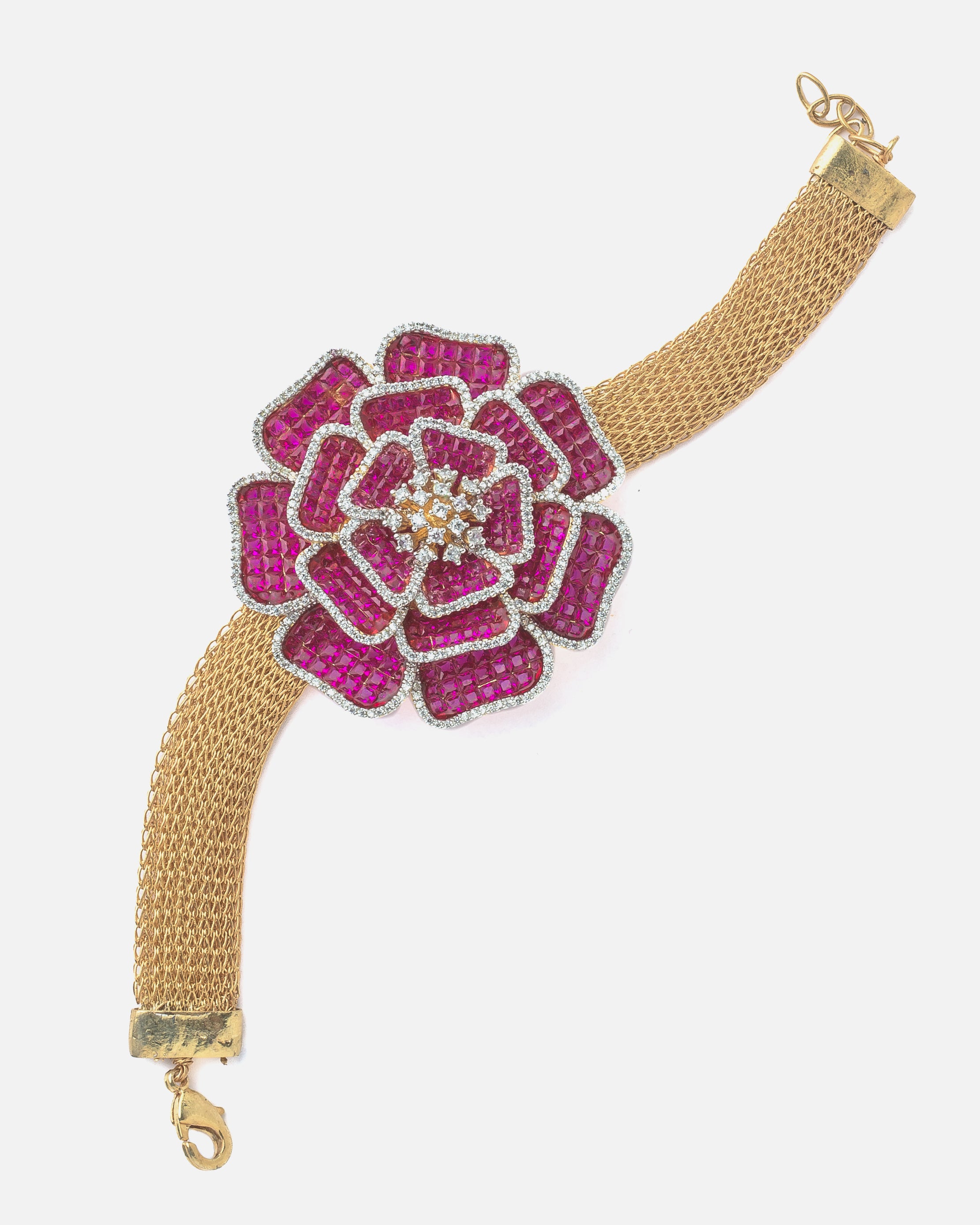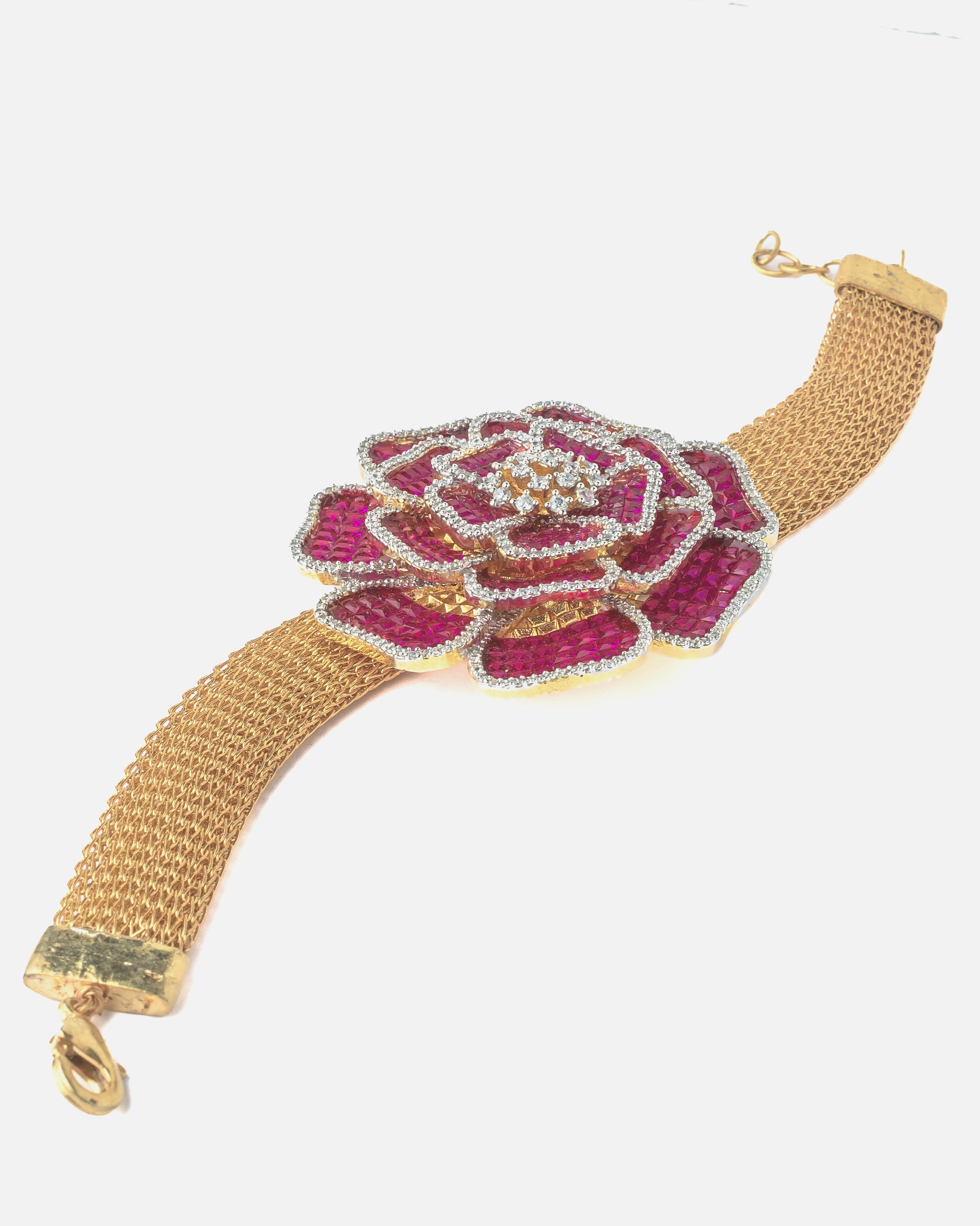Elegant gold bracelet featuring a stunning rose-shaped centerpiece adorned with vibrant pink stones and shimmering white accents. Paired with a sleek mesh band, perfect for festive or formal occasions.