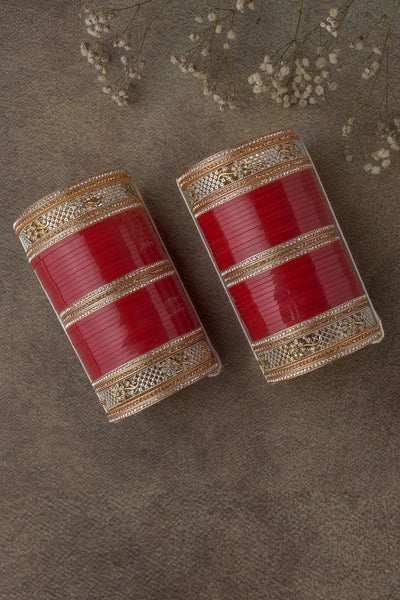 Traditional bridal Chuda bangles featuring a rich red hue with intricate gold detailing. A symbol of love and prosperity, perfect for weddings and special occasions, adding elegance and cultural charm.