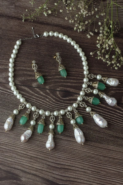 Elegant pearl necklace set featuring green gemstone and baroque pearl drops, paired with matching earrings. Perfect for weddings or festive occasions, this set blends traditional charm with modern flair.
