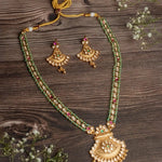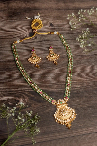 A stunning traditional jewellery set featuring a gold-tone necklace with intricate detailing, green and pink beads, and an ornate pendant, paired with matching jhumka-style earrings, ideal for festive occasions.