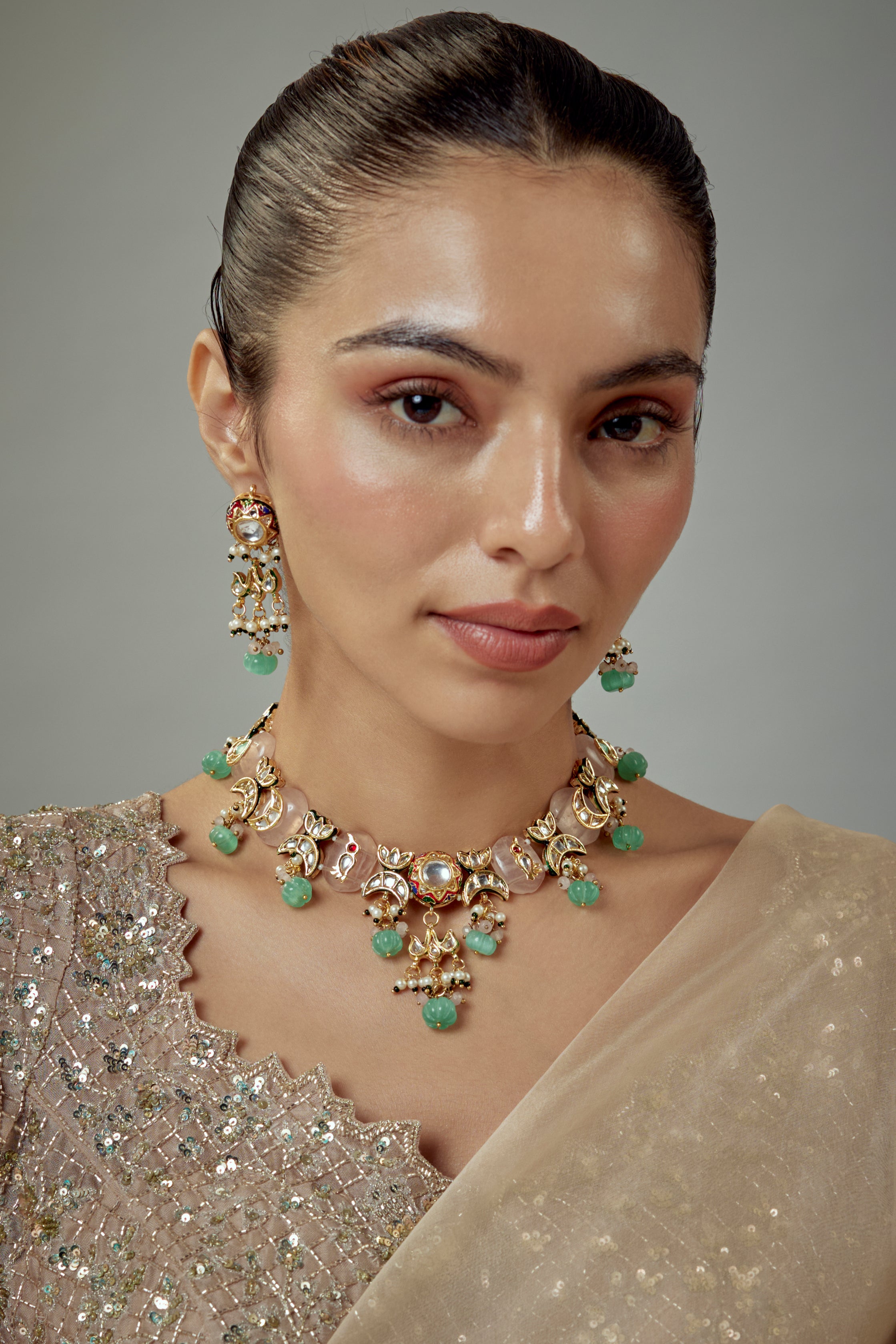 Saadgi Gold Plated Green Womens Temple Choker Necklace Set with 2 Pair of Earrings
