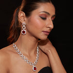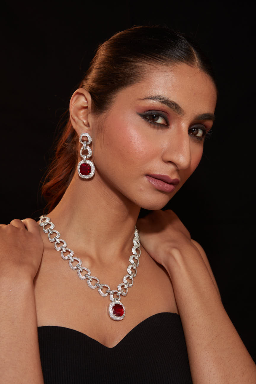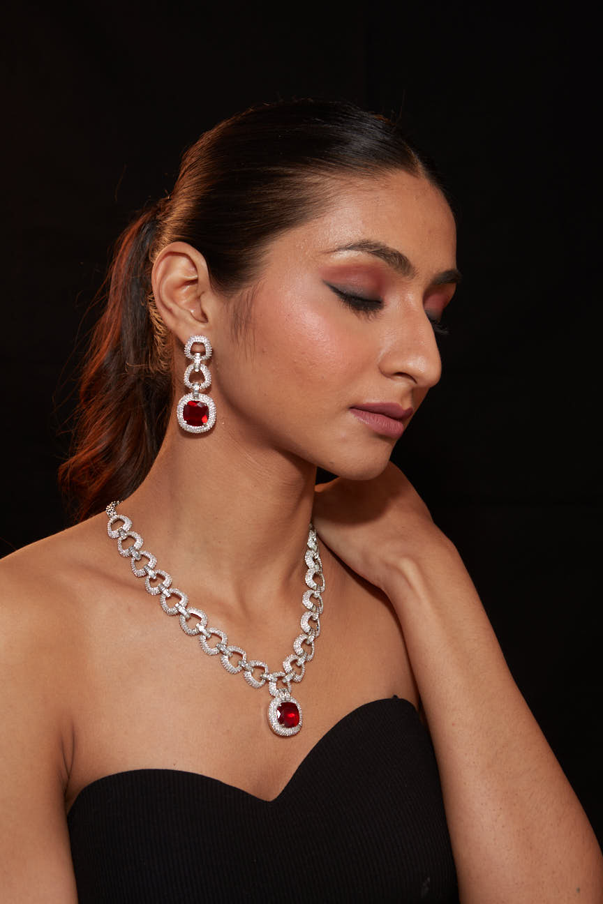 Sophisticated ruby-red and silver-tone necklace set with a sleek design and matching drop earrings. Perfect for enhancing your elegance at weddings, parties, or formal events with timeless charm.