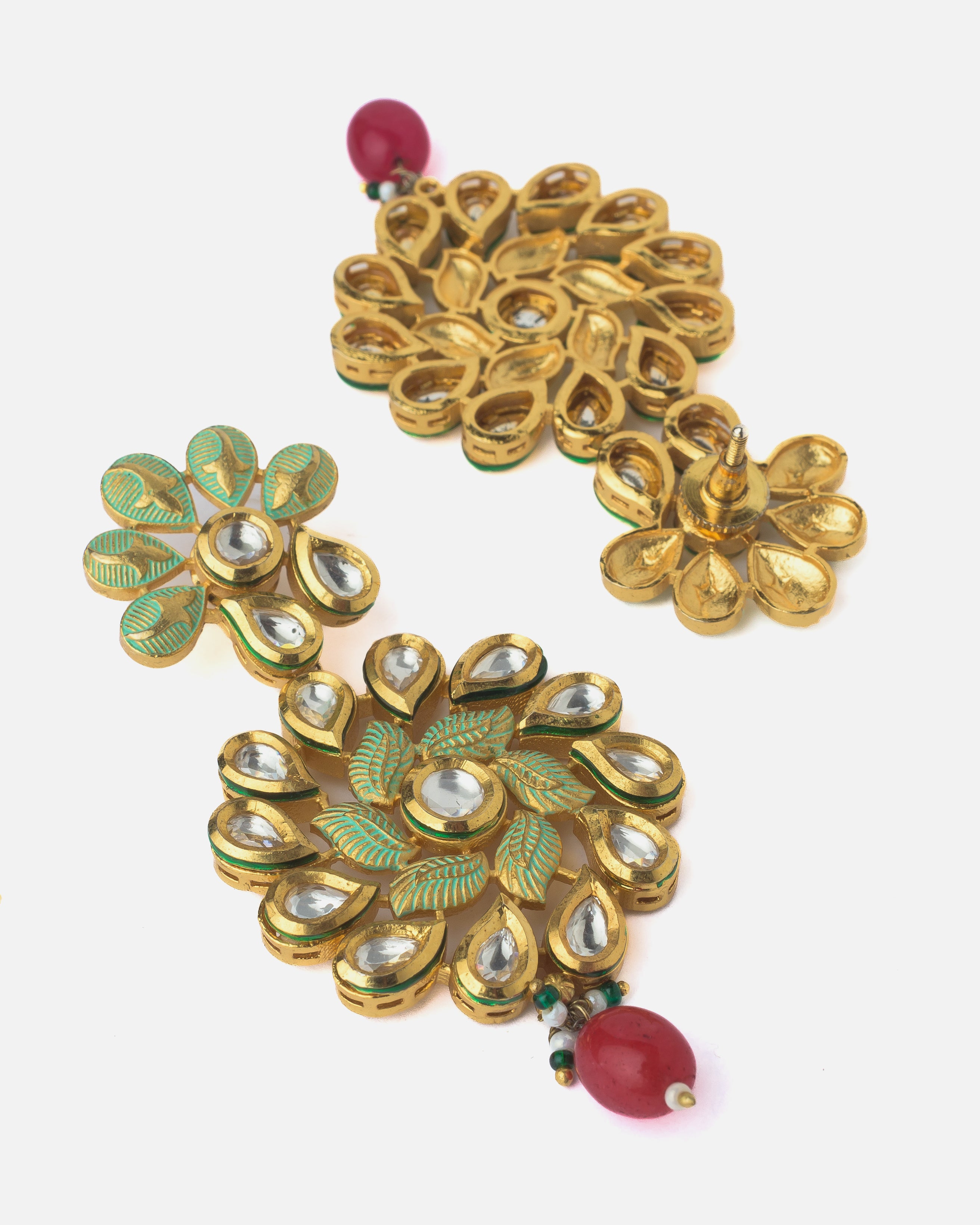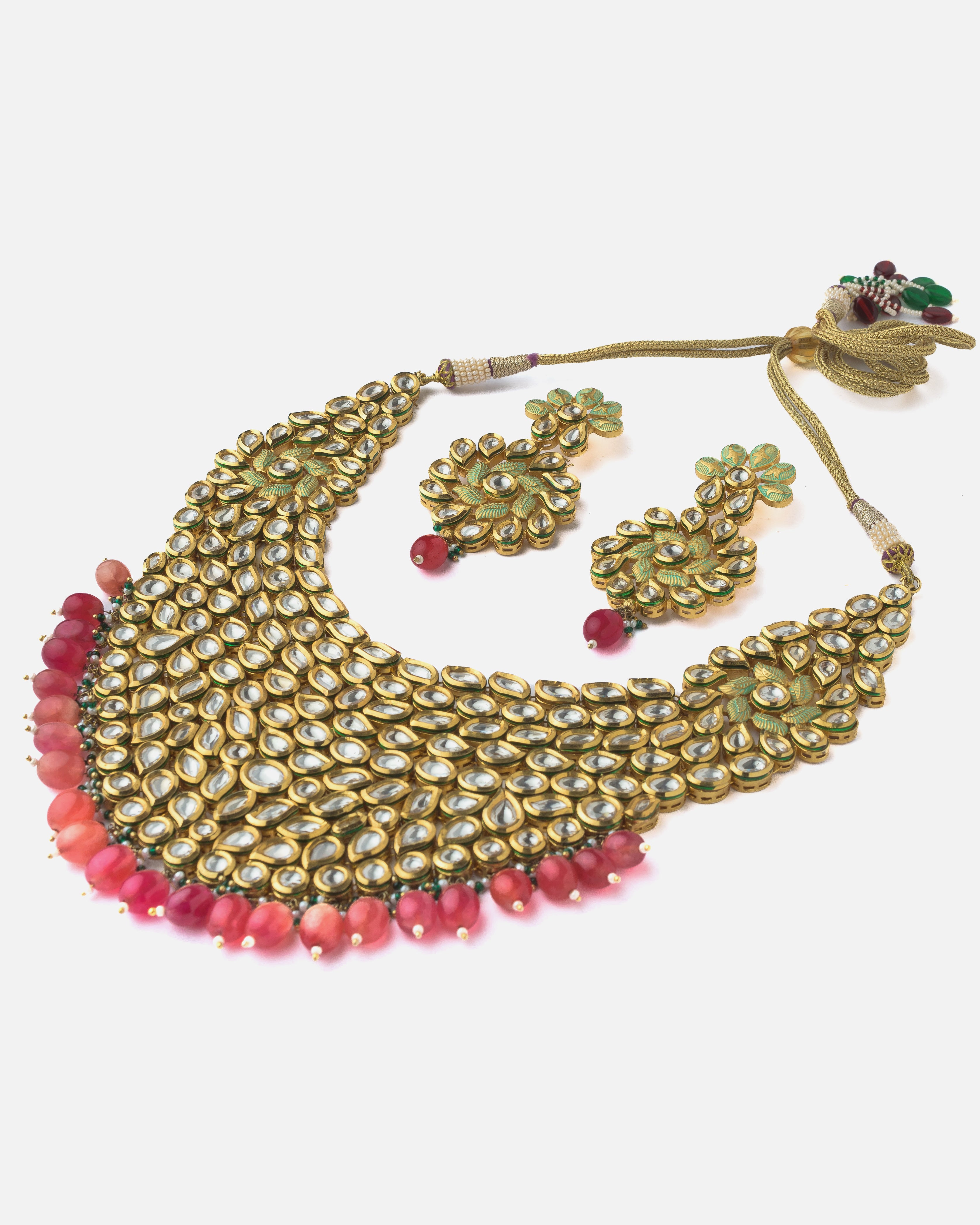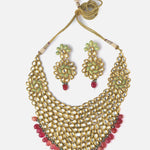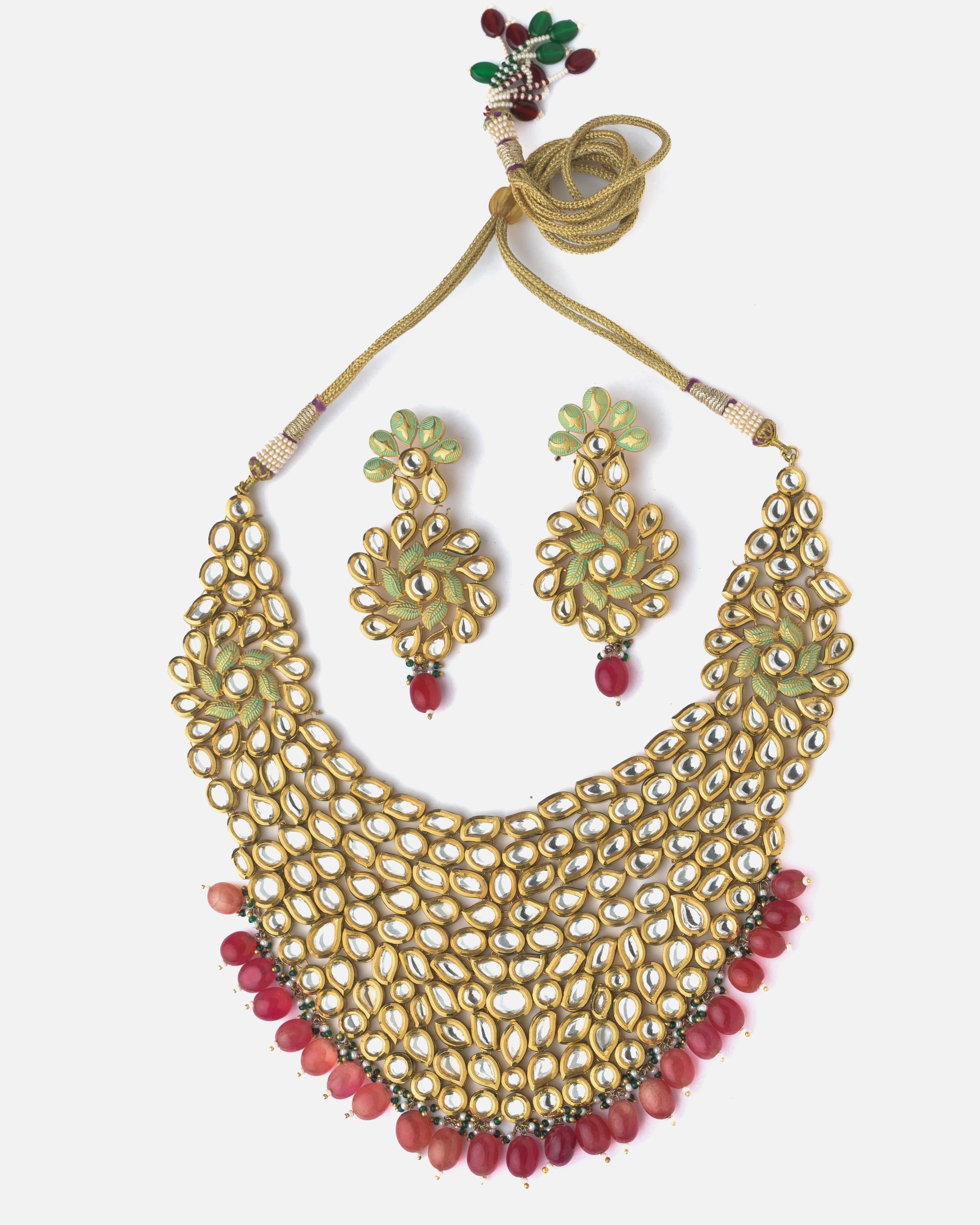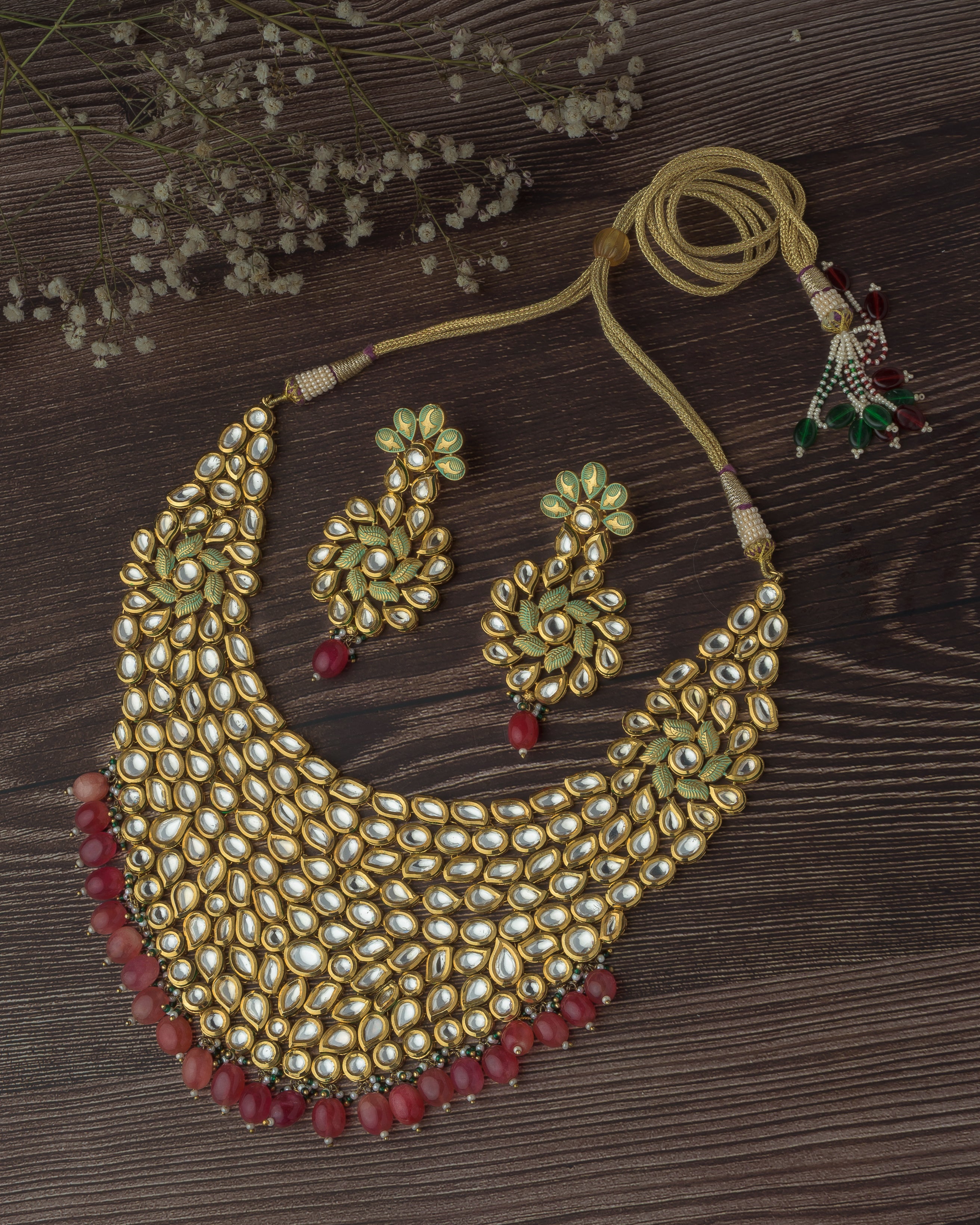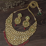 Elegant Kundan necklace set with matching earrings, adorned with red bead drops and intricate floral design. Perfect for weddings, festivals, or traditional events. Adjustable fit for all sizes.