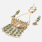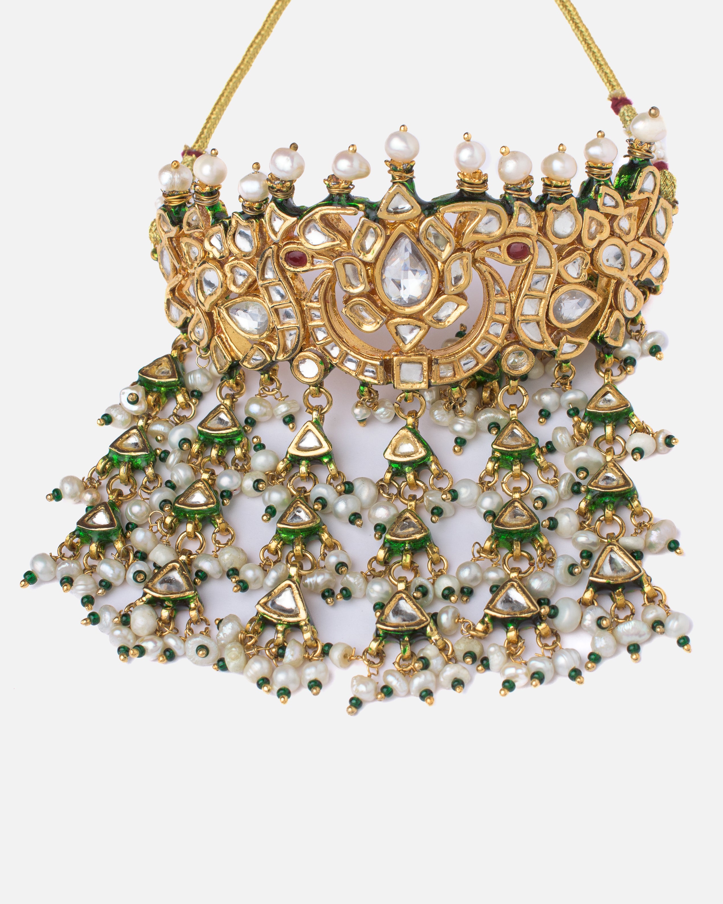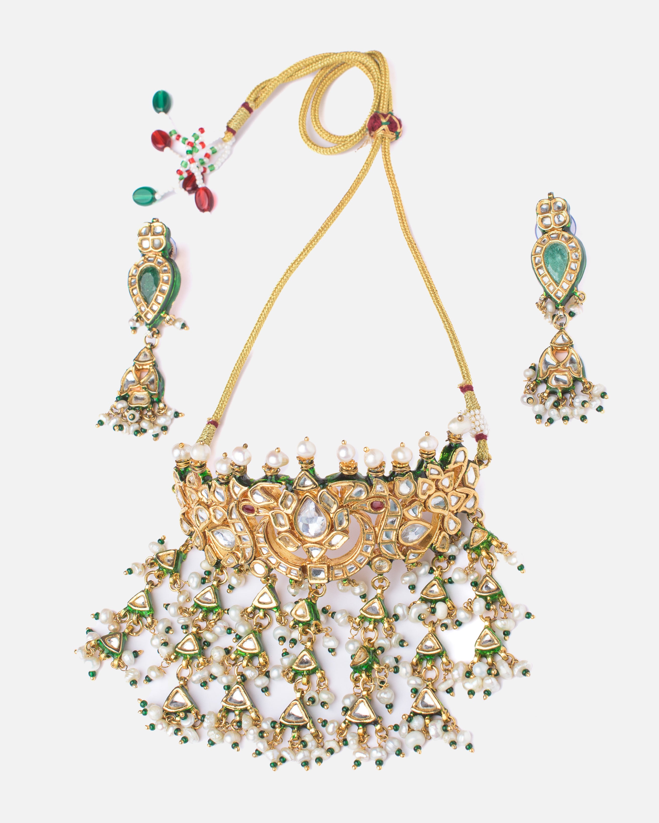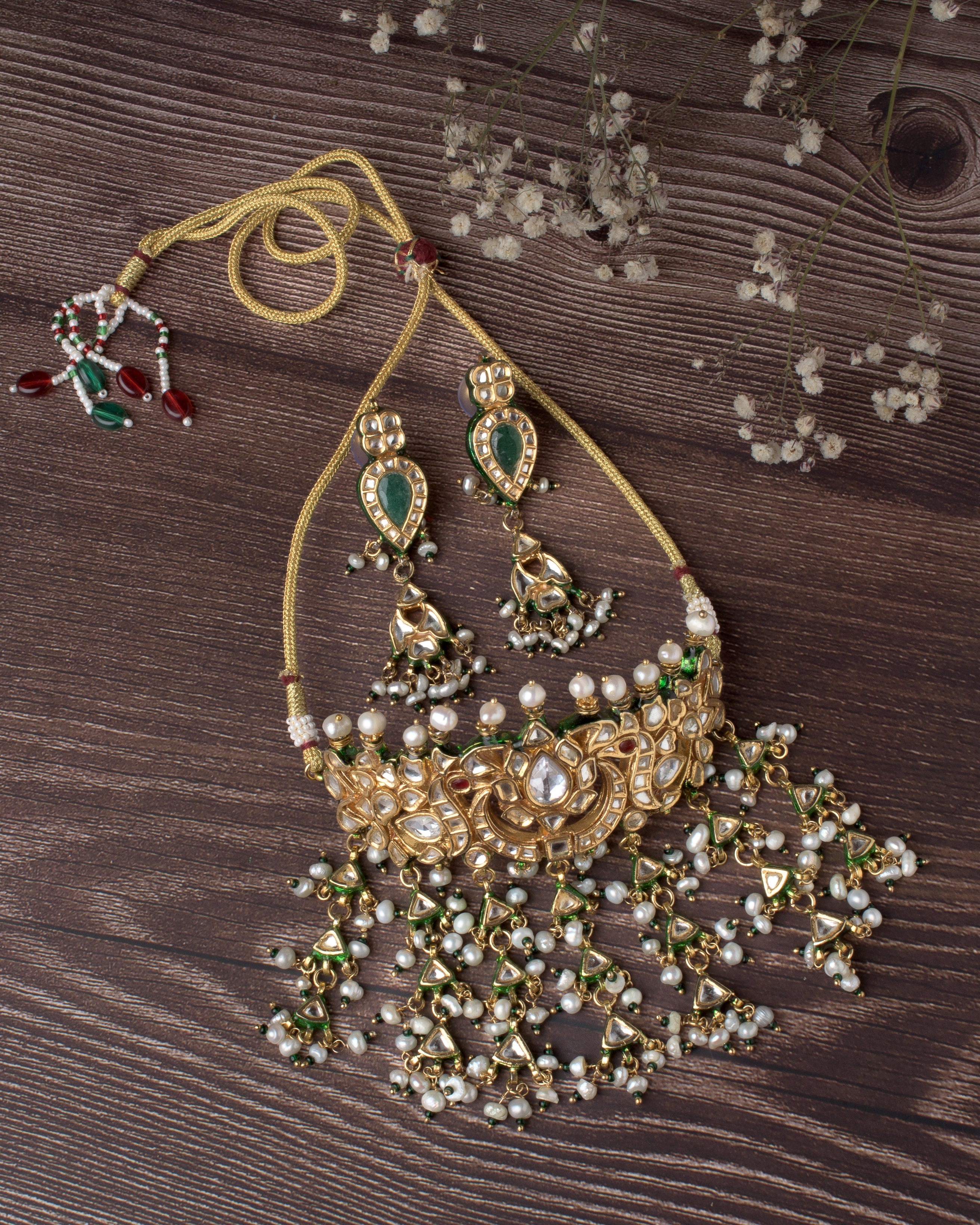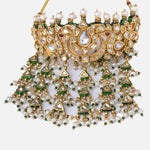 This exquisite necklace set features intricate gold detailing with shimmering stones and pearl tassels. Paired with matching earrings, it brings elegance and charm—perfect for weddings and festive events.
