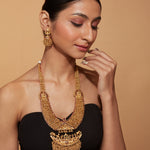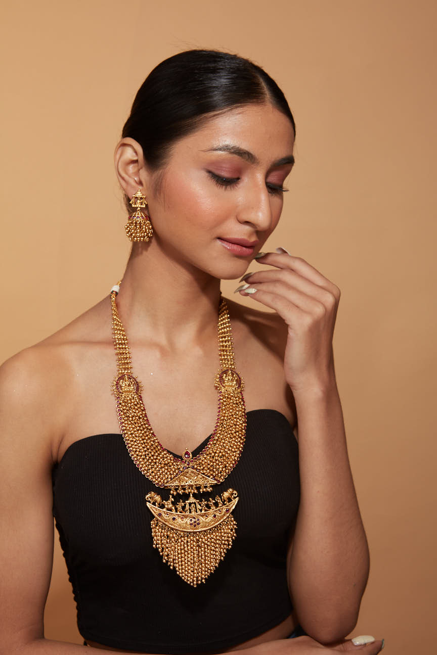 A regal gold-tone temple necklace with intricate detailing and cascading beadwork. Paired with matching earrings, this statement piece is perfect for weddings and festive occasions, adding elegance to any ethnic look.