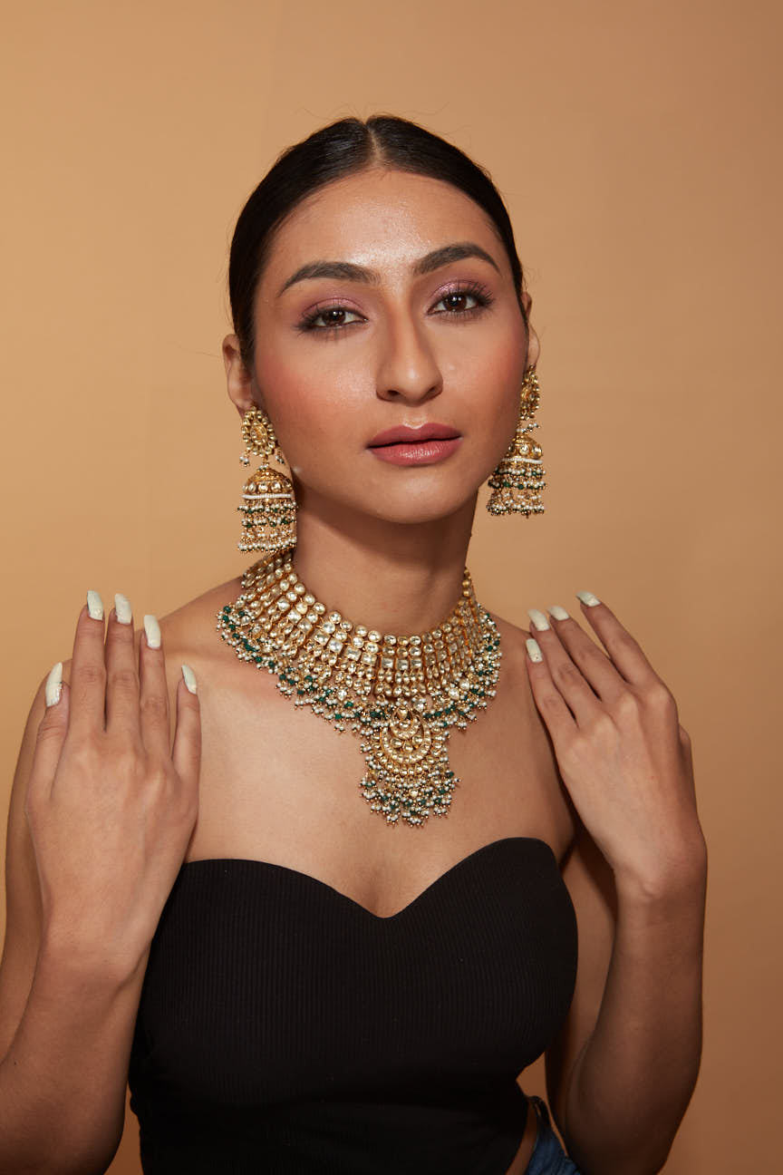 Gold Plated Kundan Polki Green Beads Bridal Choker Necklace & Jhumka Earrings Set