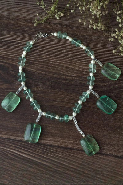 Make a bold statement with this elegant green crystal necklace. Featuring pearl beads and five large rectangular pendants, it’s perfect for contemporary ethnic and Indo-western looks.