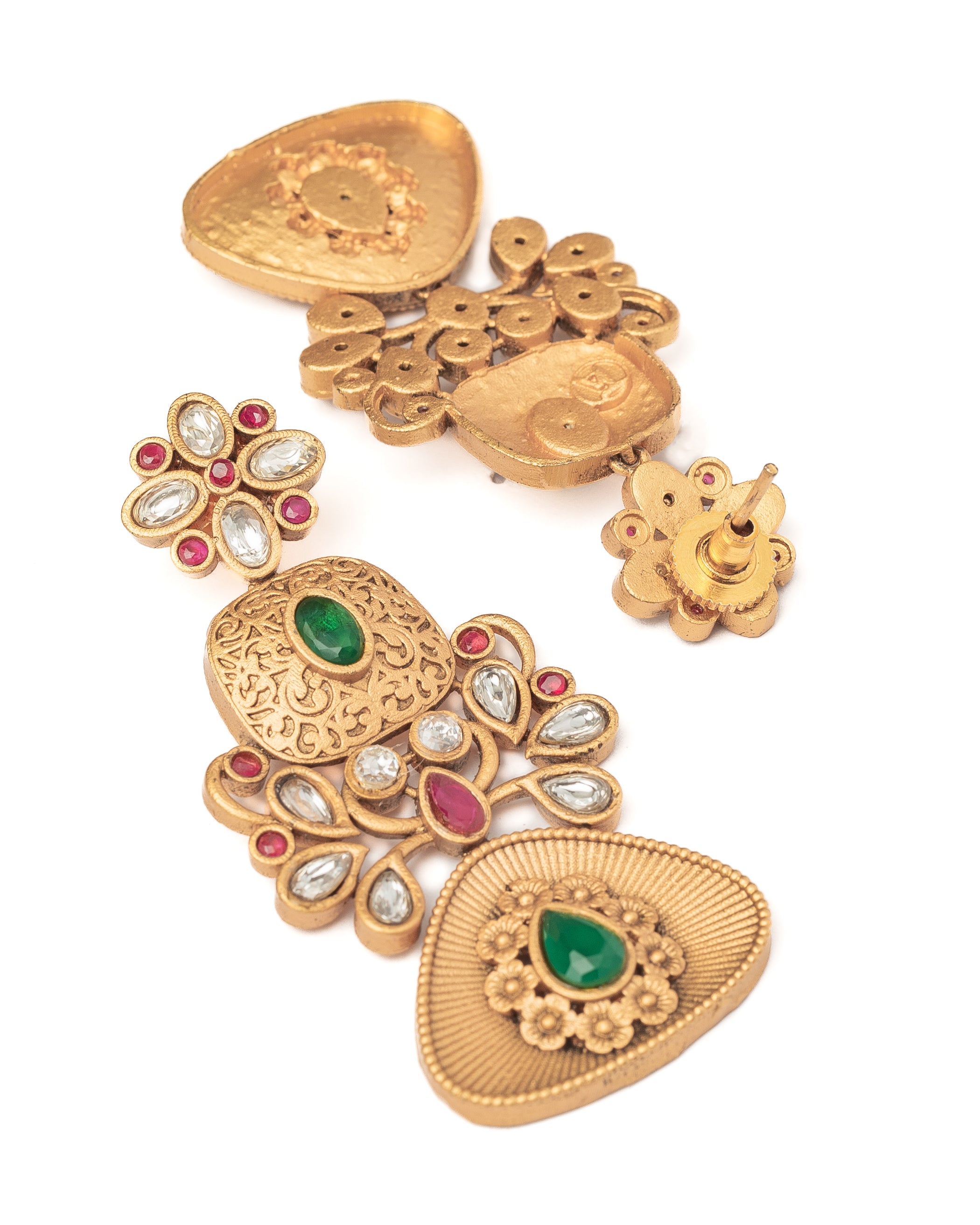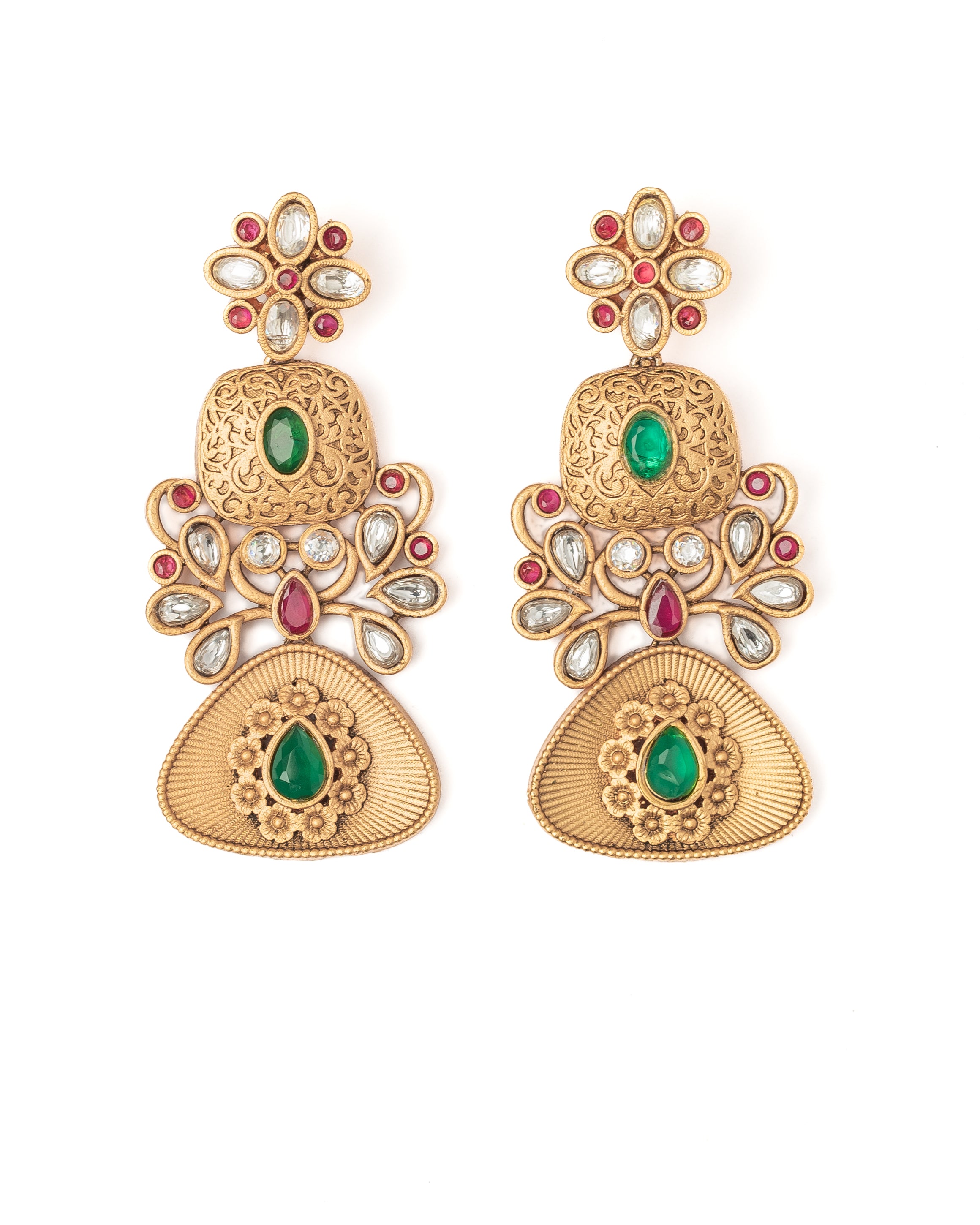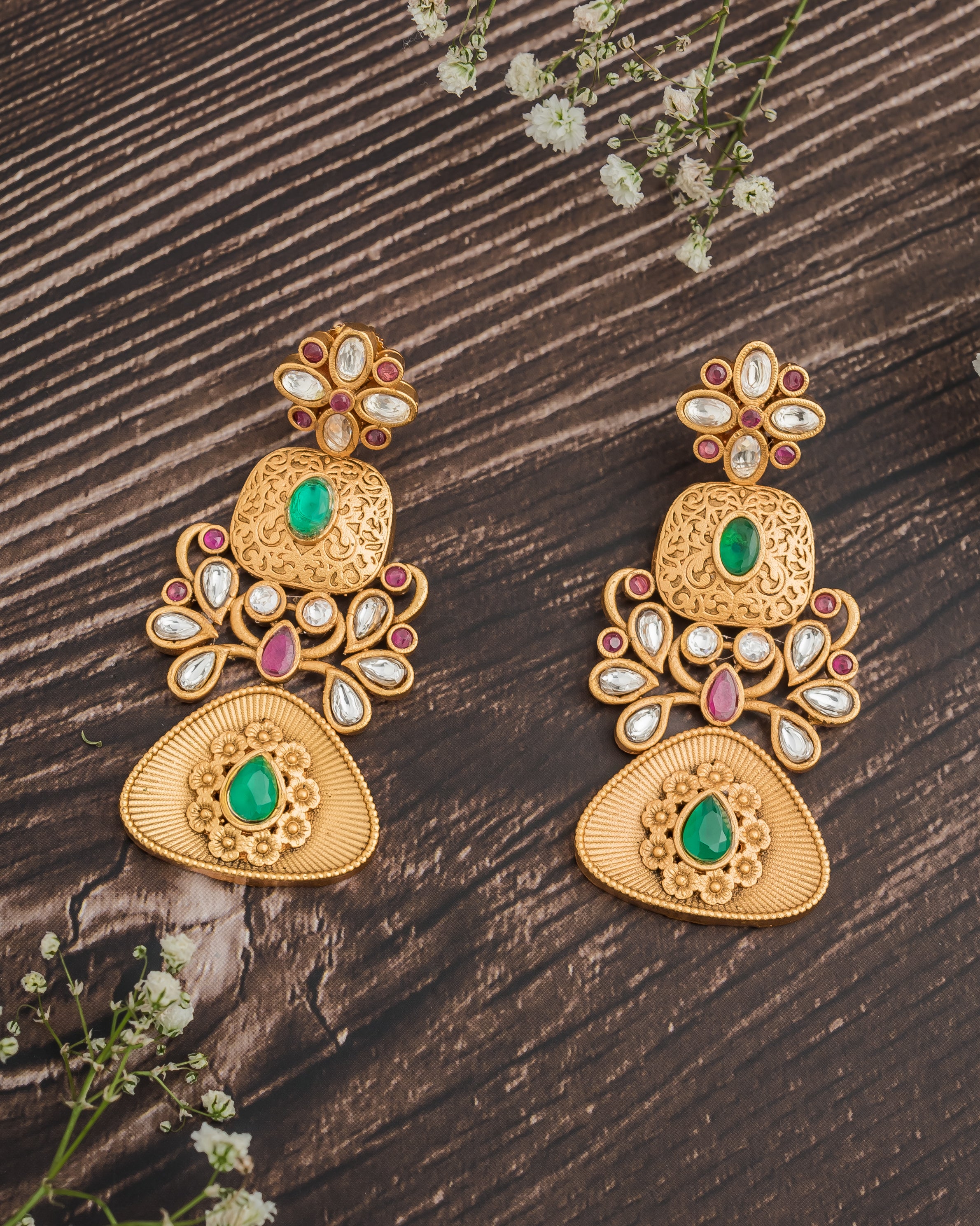 A pair of intricately designed gold-toned earrings featuring floral motifs, green & pink gemstone accents, & detailed filigree work, laid on a wooden textured surface with decorative floral sprigs.