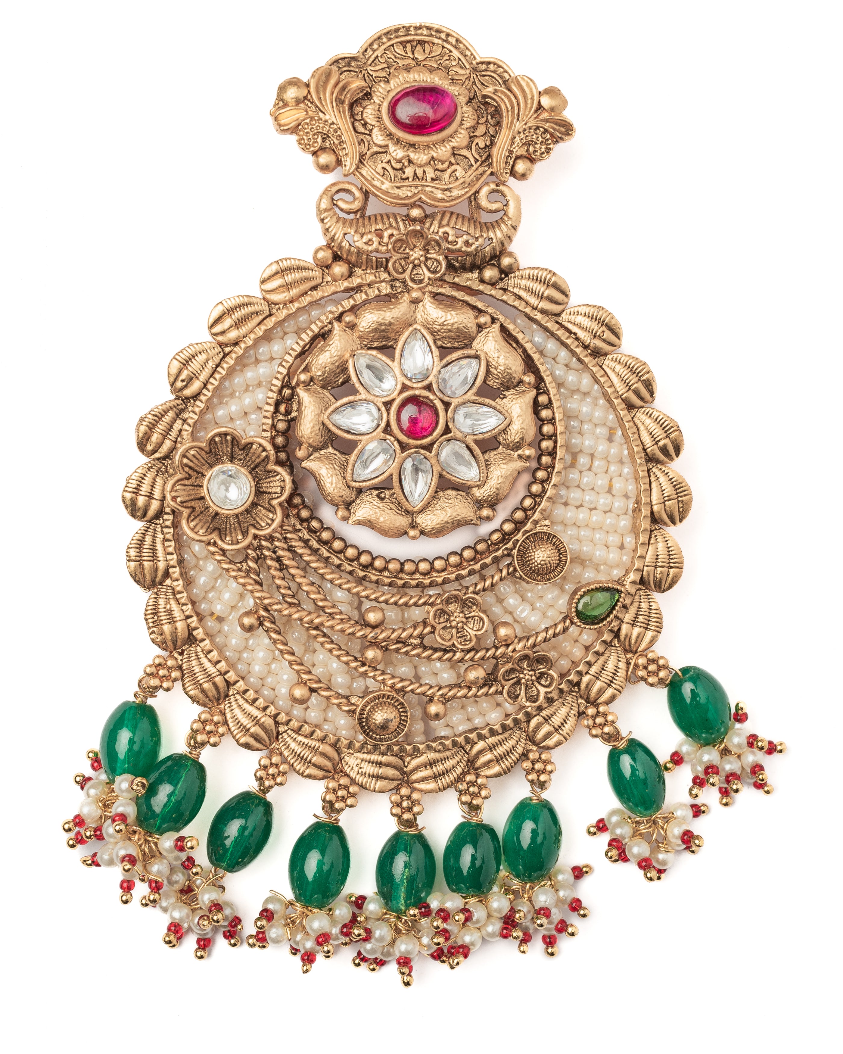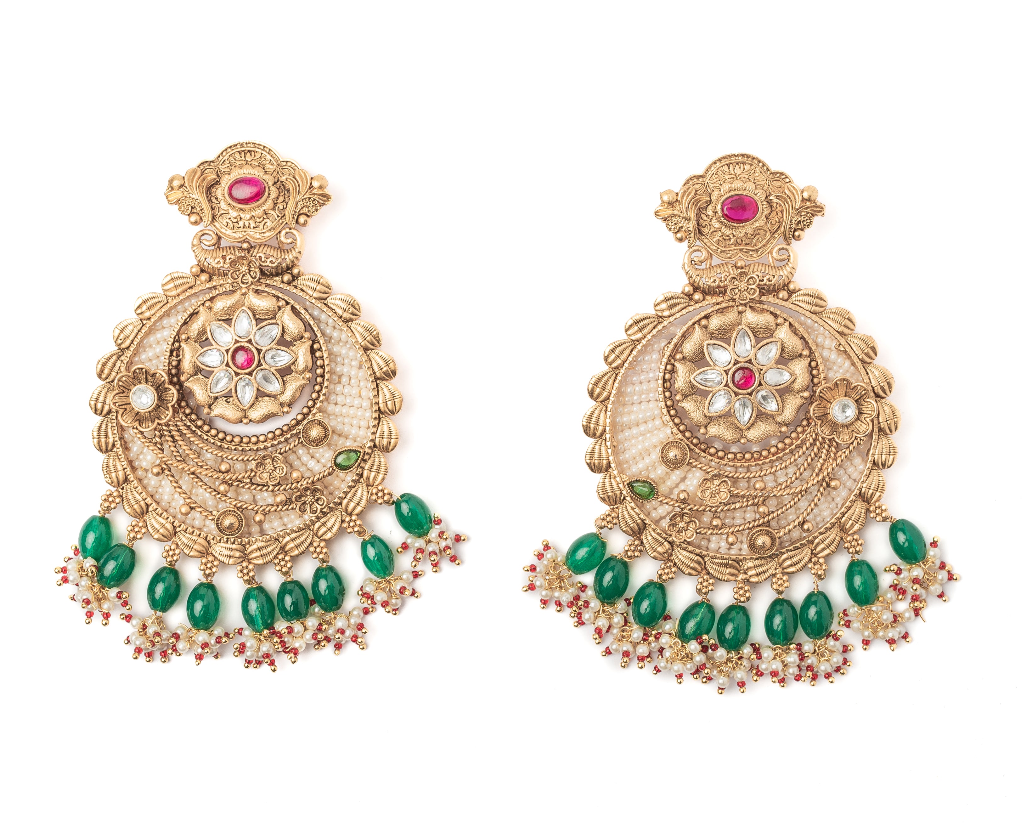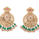 Elegant gold-tone chandbali earrings adorned with intricate floral patterns, sparkling white stones, and vibrant green bead danglers. Perfect for weddings and festive celebrations.