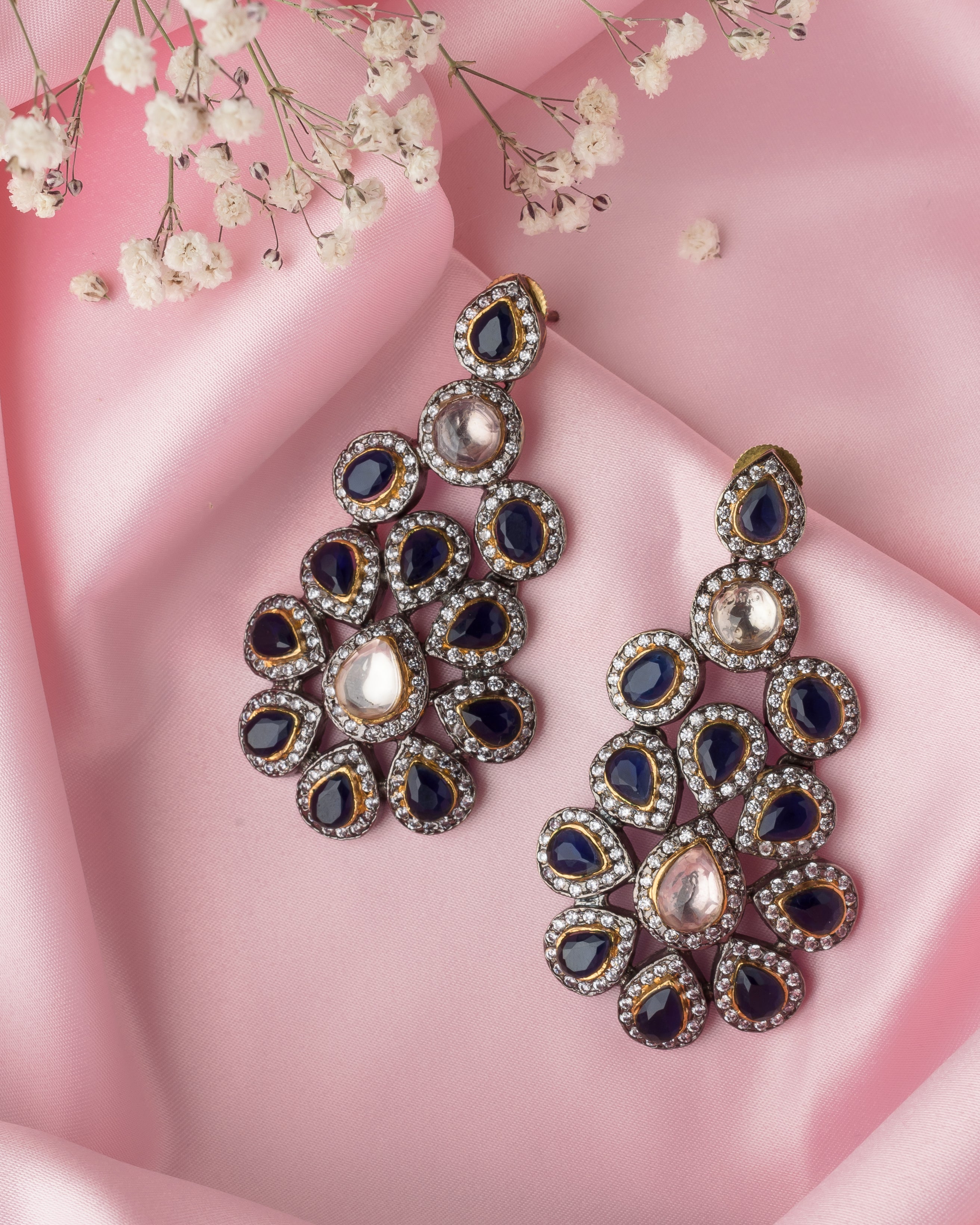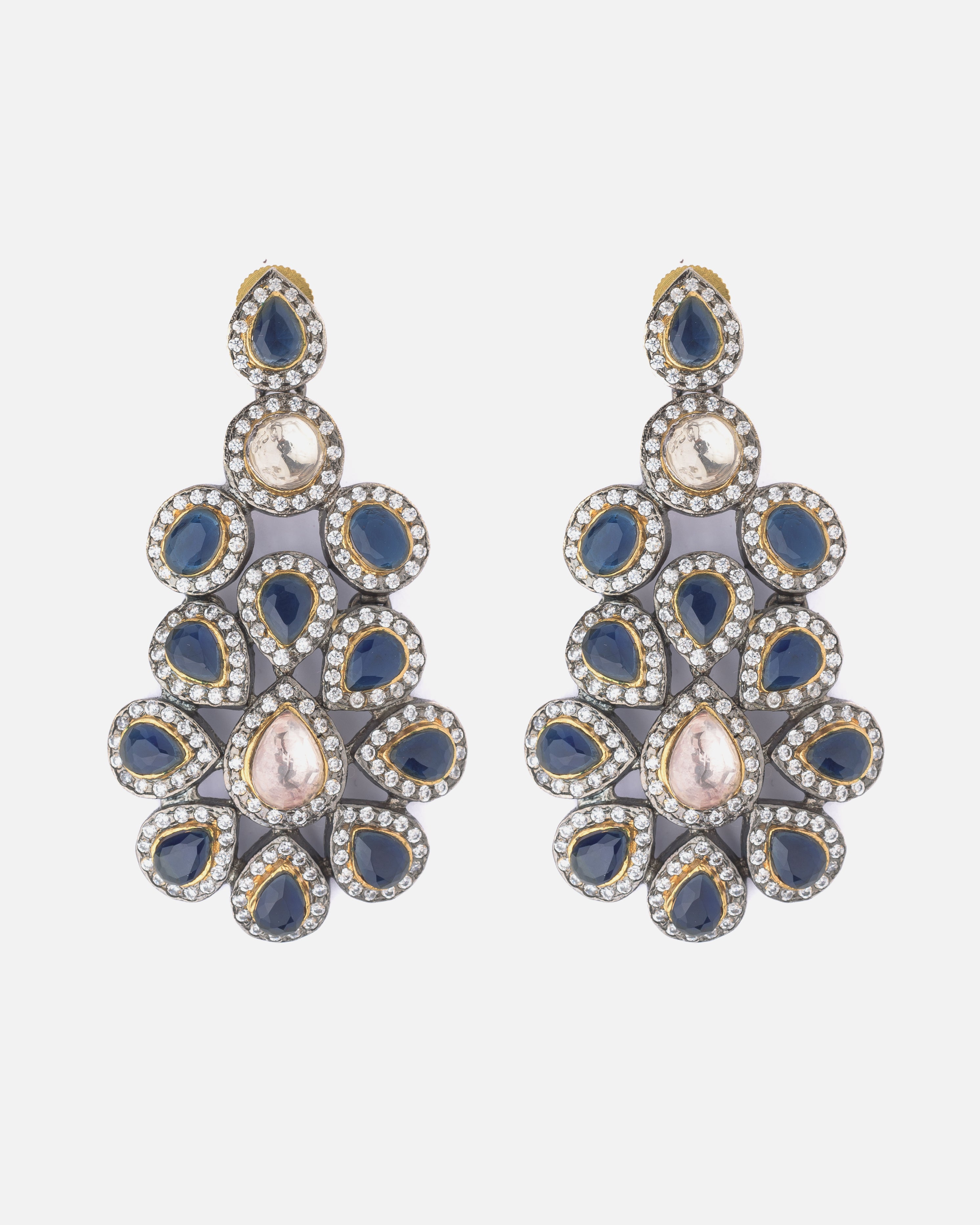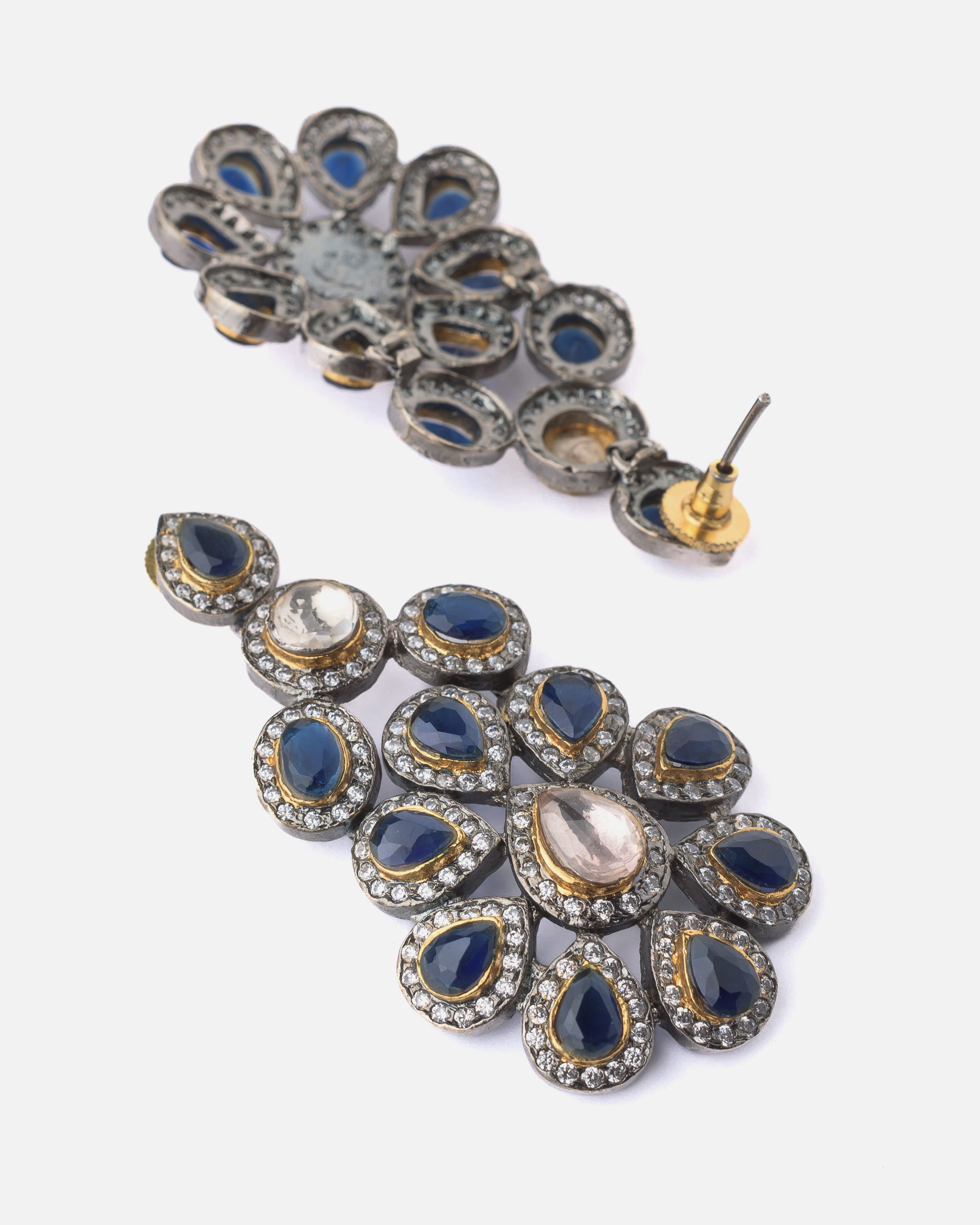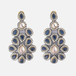 Elegant chandelier earrings featuring deep blue teardrop stones bordered with sparkling crystals. The floral cluster pattern exudes regal sophistication—perfect for festive, bridal, or evening wear.