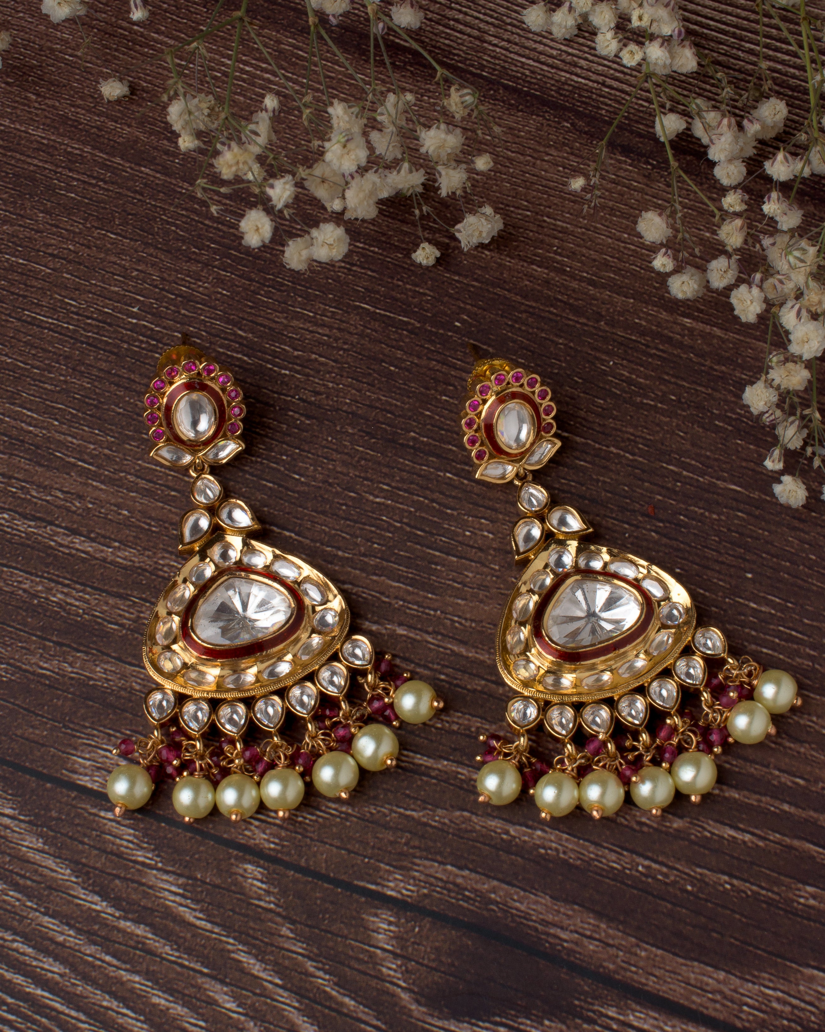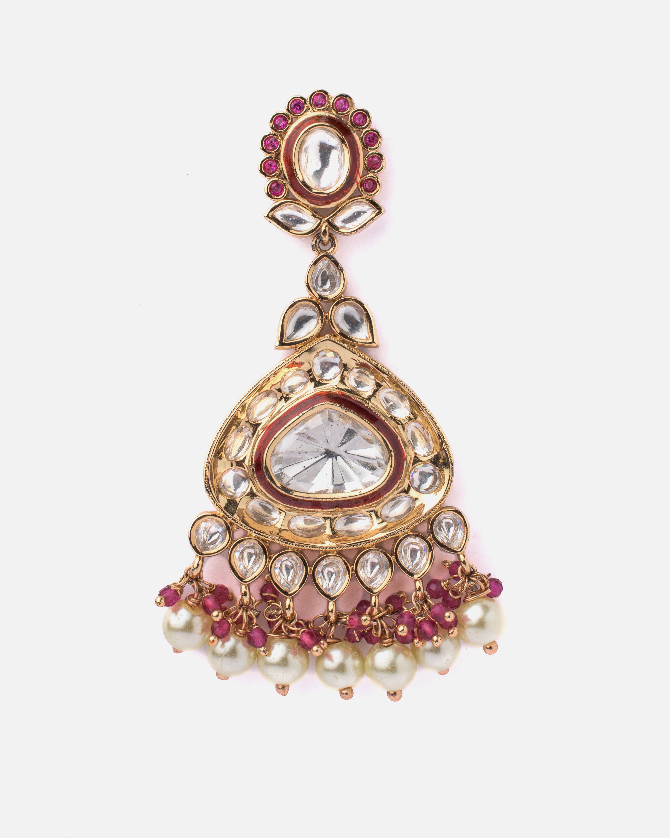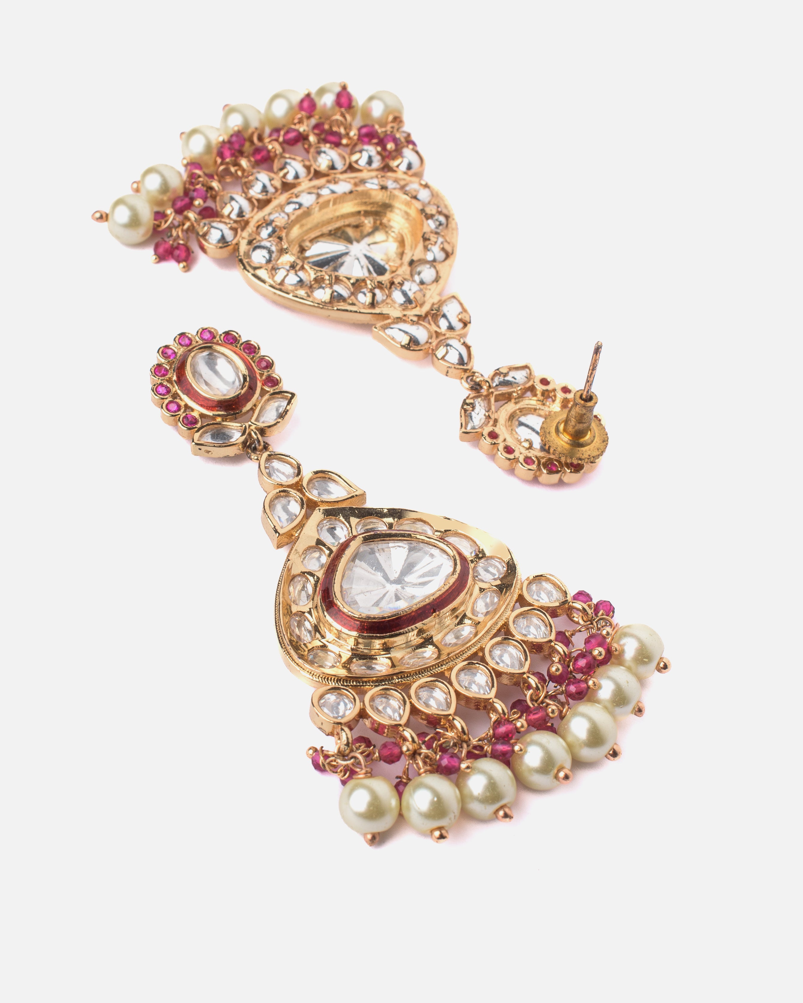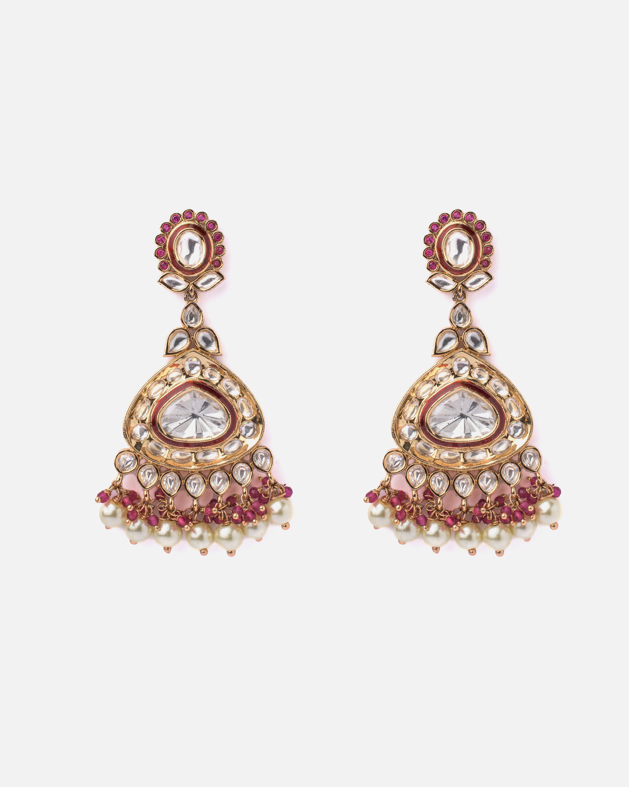 Add a royal touch with these traditional gold-toned earrings. Embellished with pearls, stones, and intricate detailing, they’re perfect for weddings, festivals, and grand celebrations.