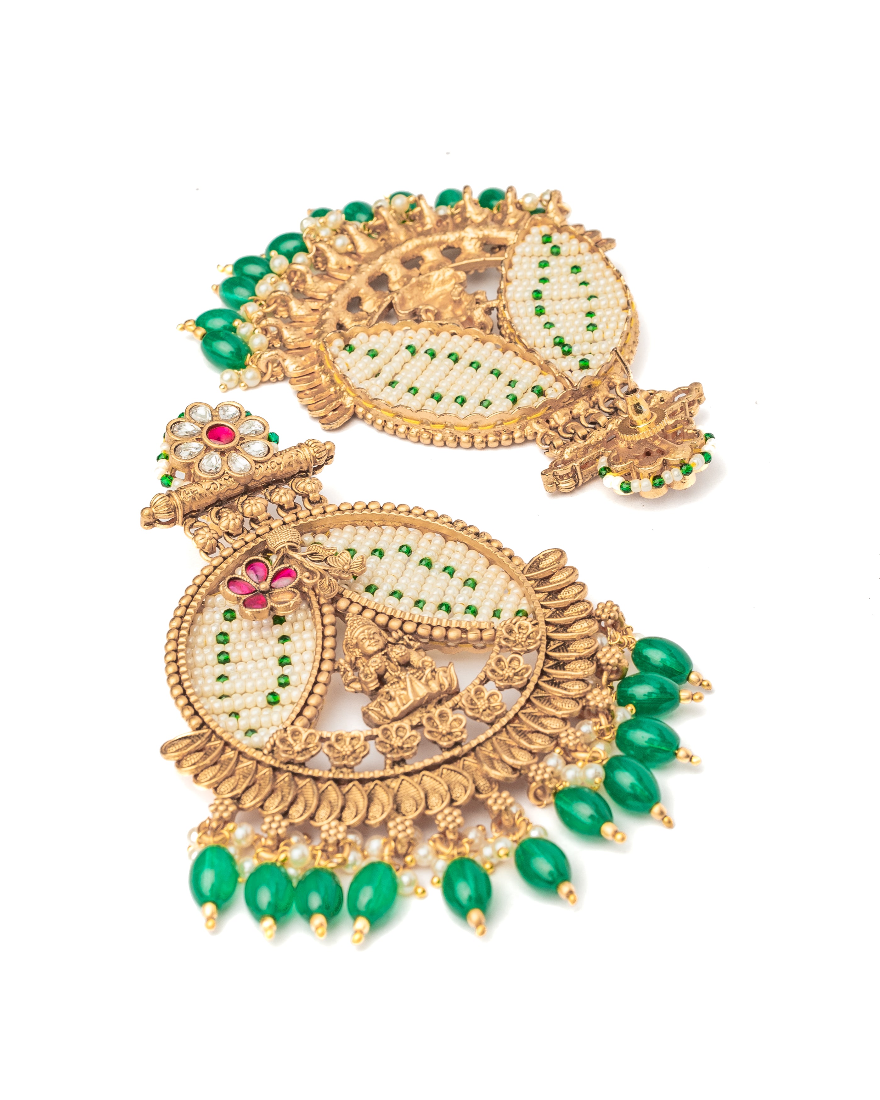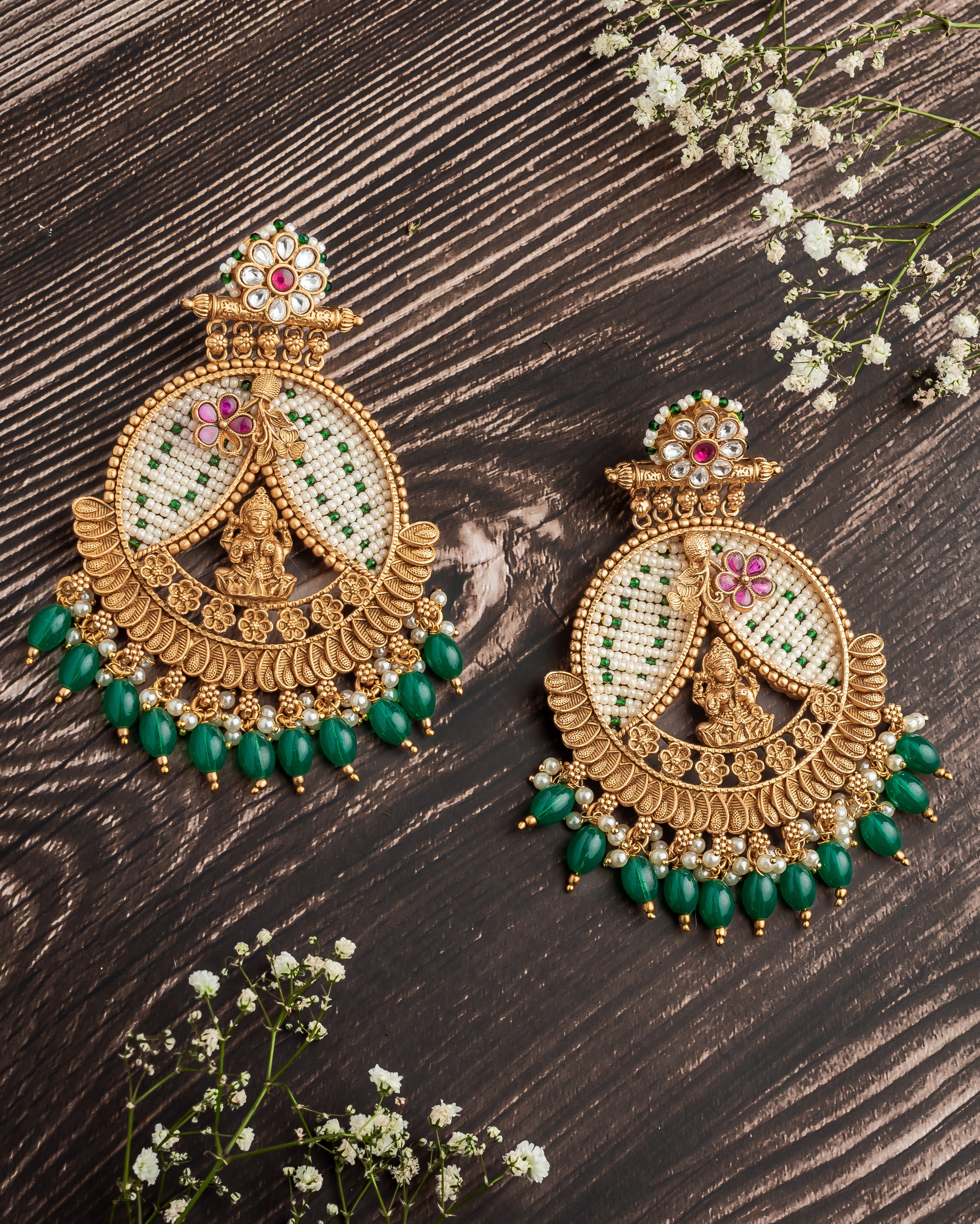 Traditional Indian earrings with gold-tone detailing, featuring a deity figure, floral motifs, pearl-like beads, green drops, and pink accents, offering a vibrant, intricate, and elegant design.