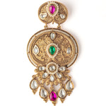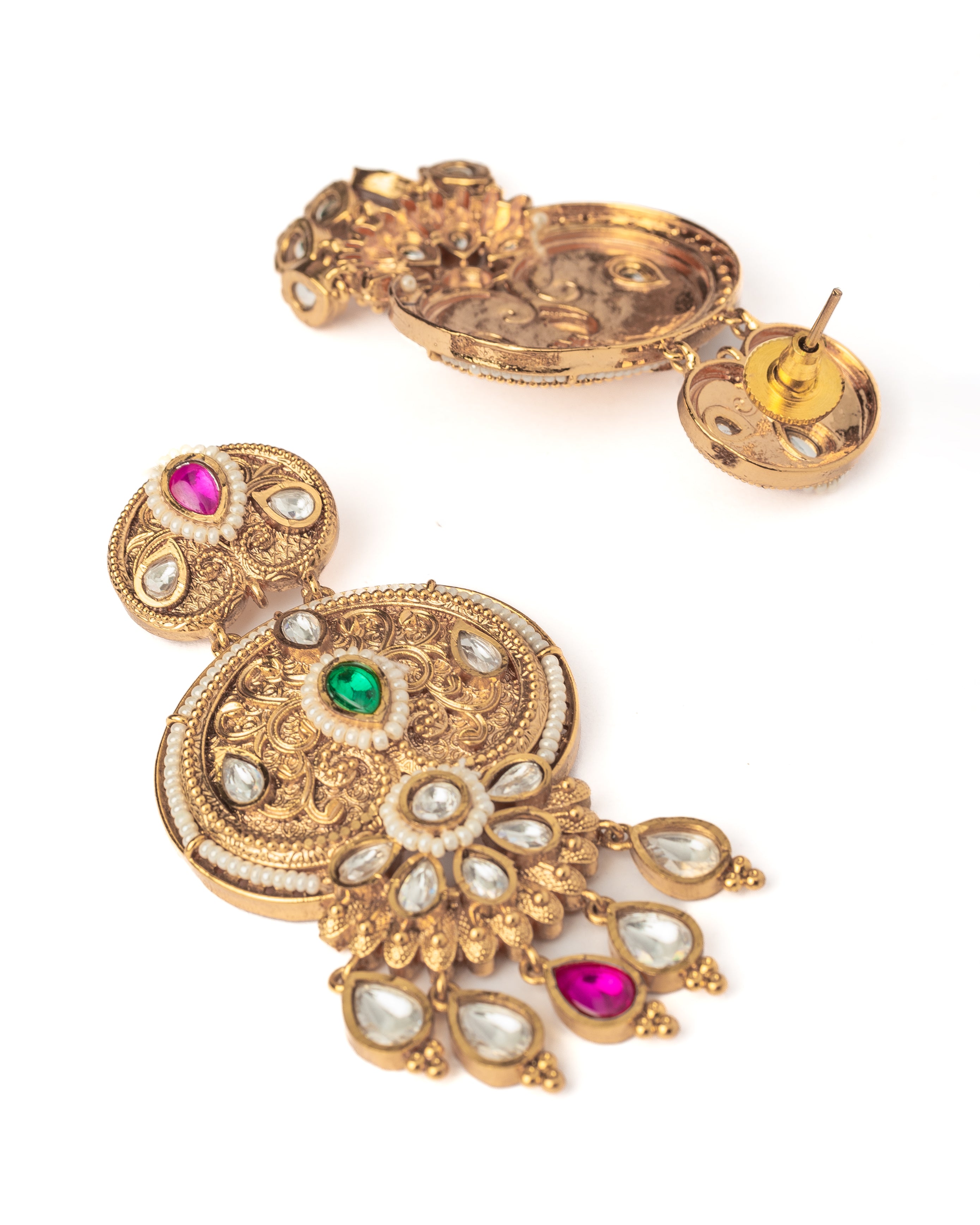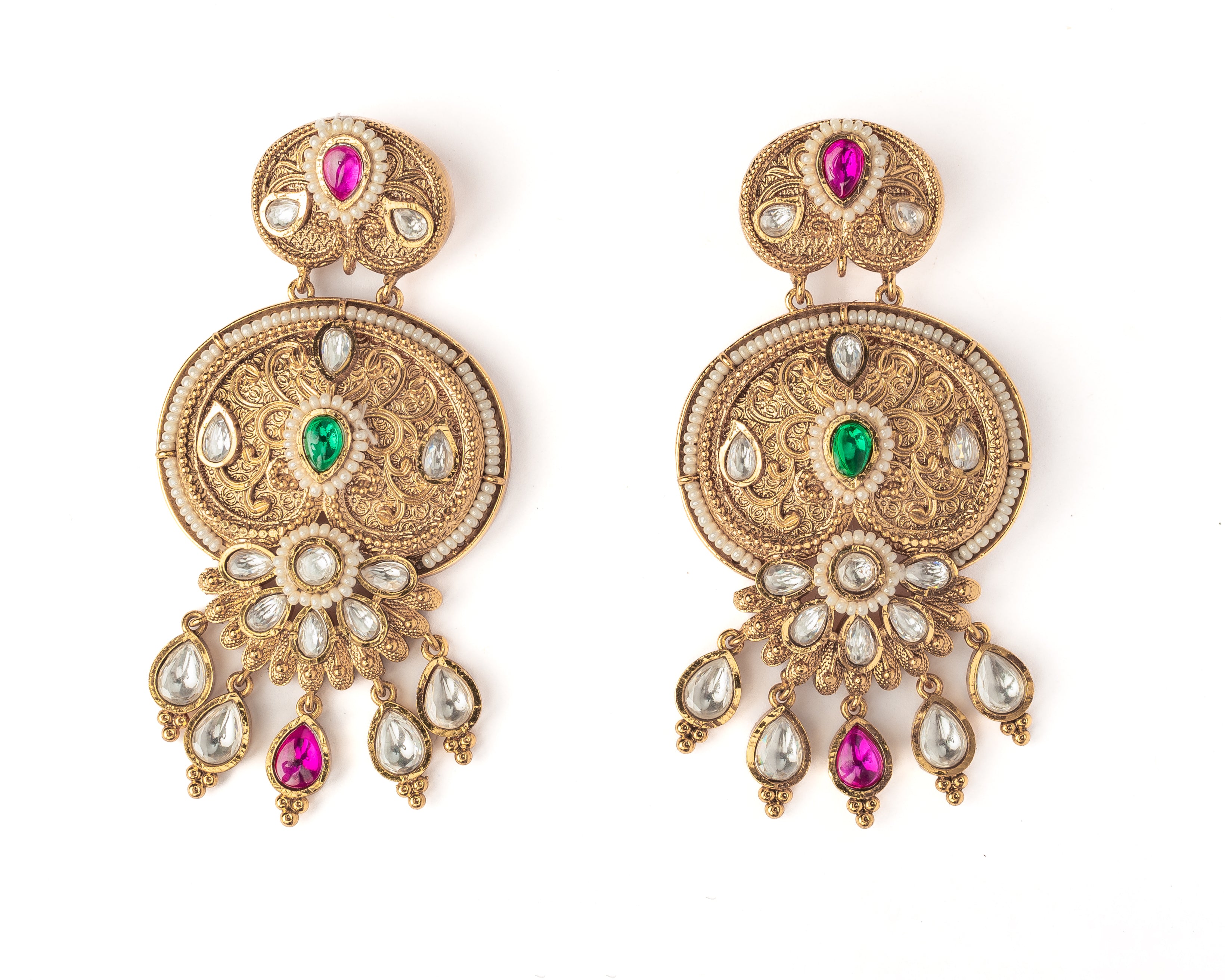 A pair of ornate earrings with a gold-tone base, intricate detailing, and a combination of green and pink gemstones. The design includes dangling white and pink stone accents.