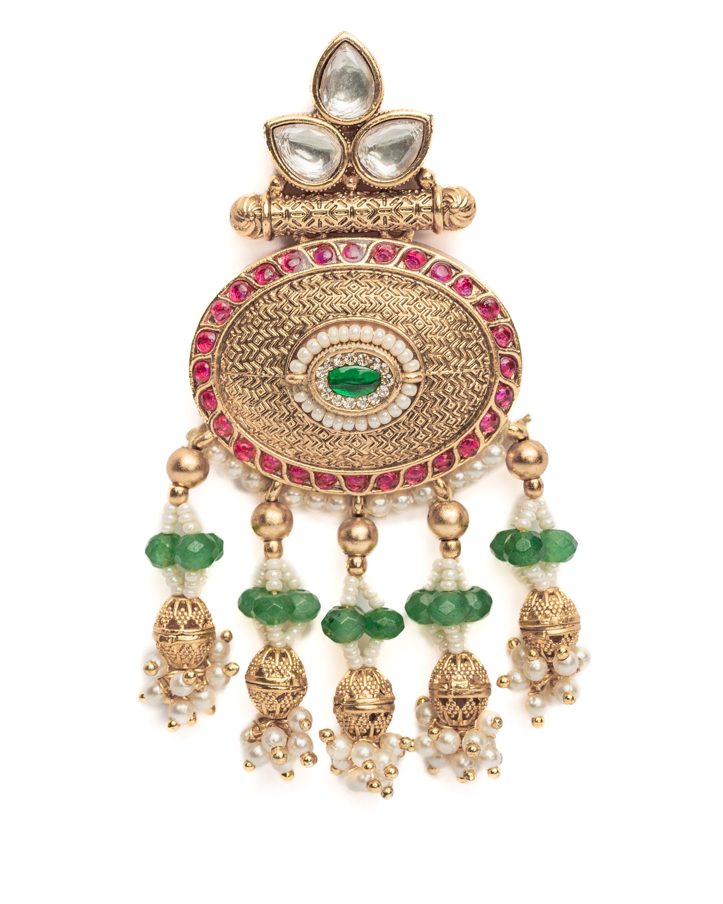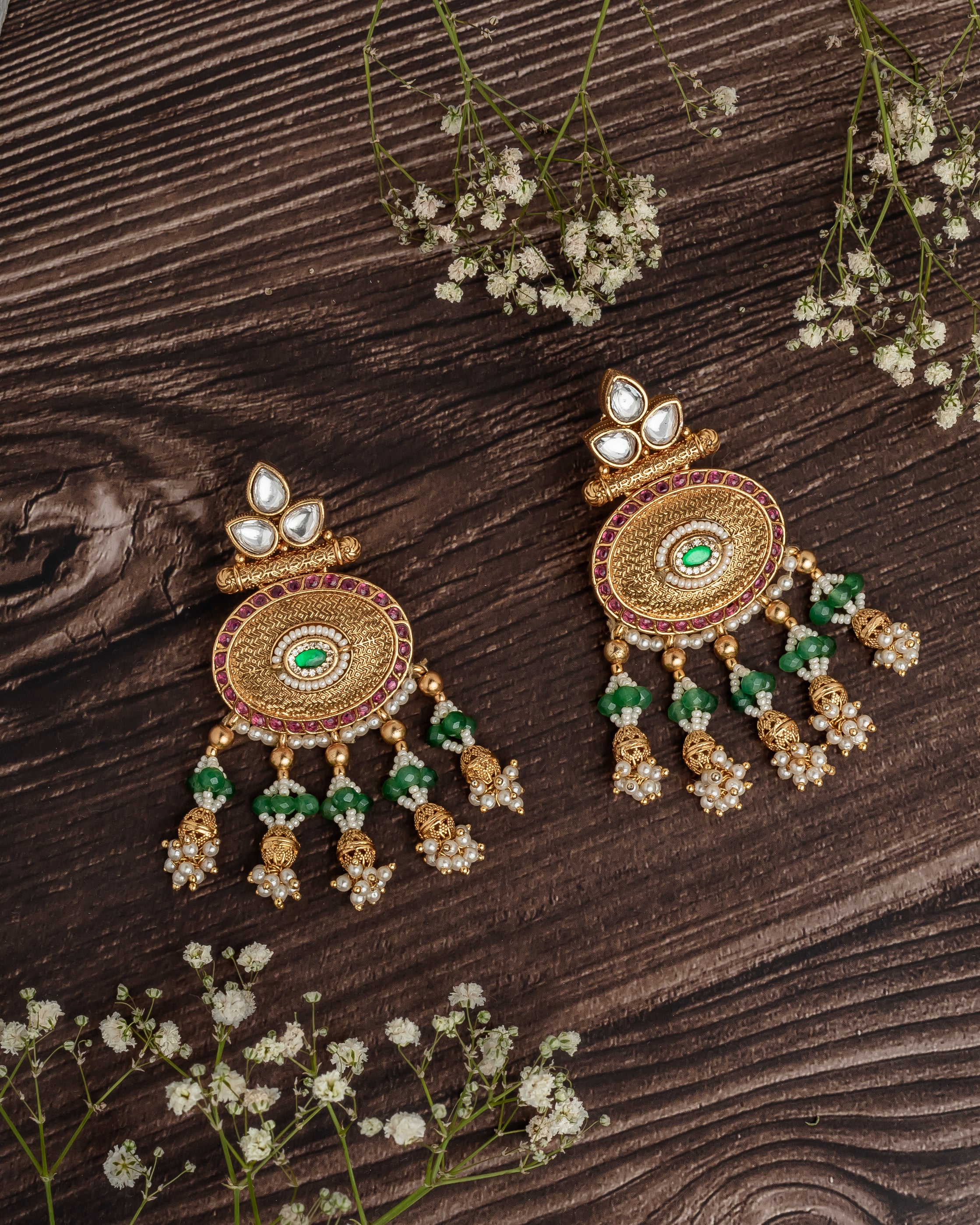 These are intricately crafted gold-plated earrings featuring green stone,pearl embellishments,dangling bead accent. The floral design & delicate details make ideal for traditional & festive occasion.