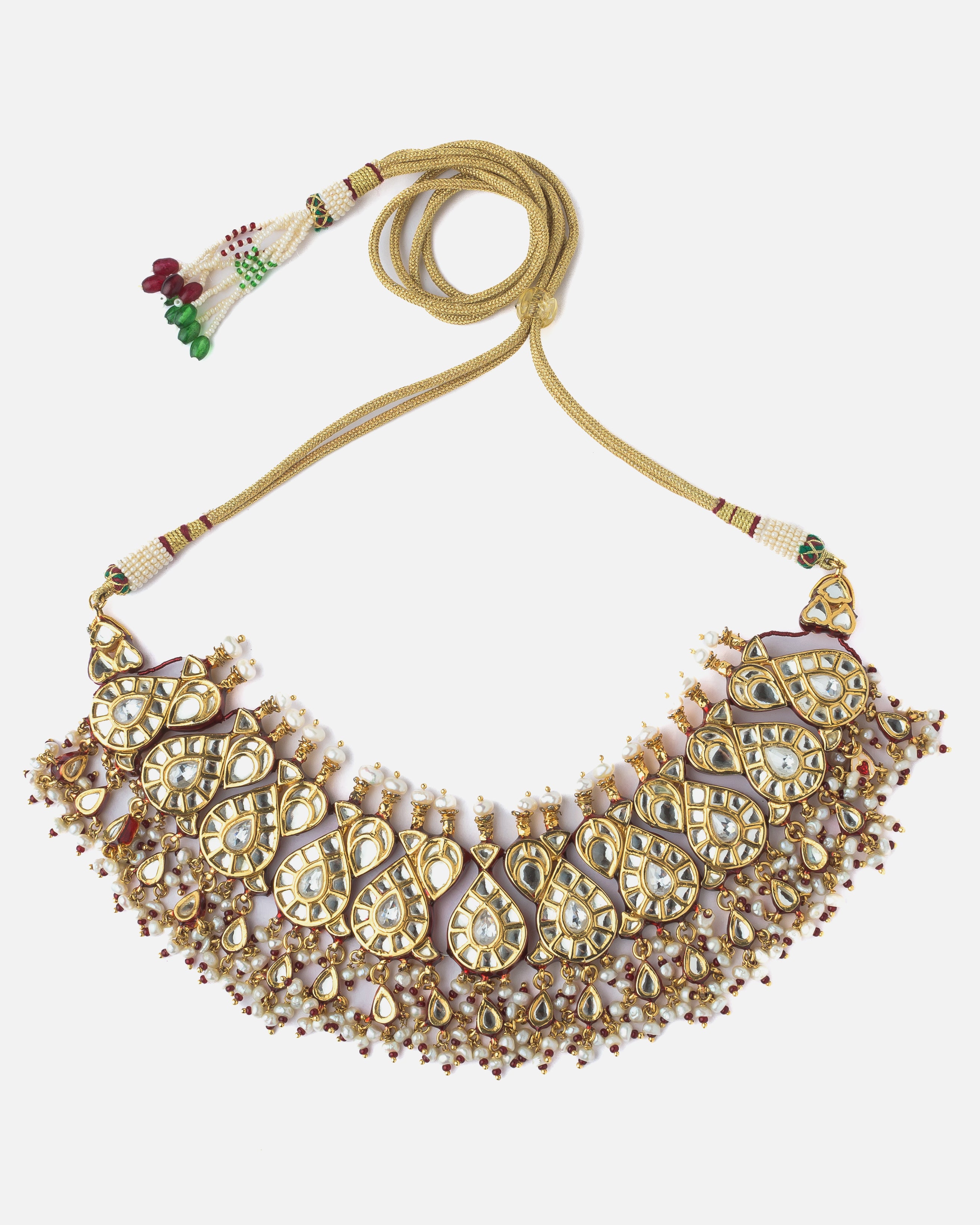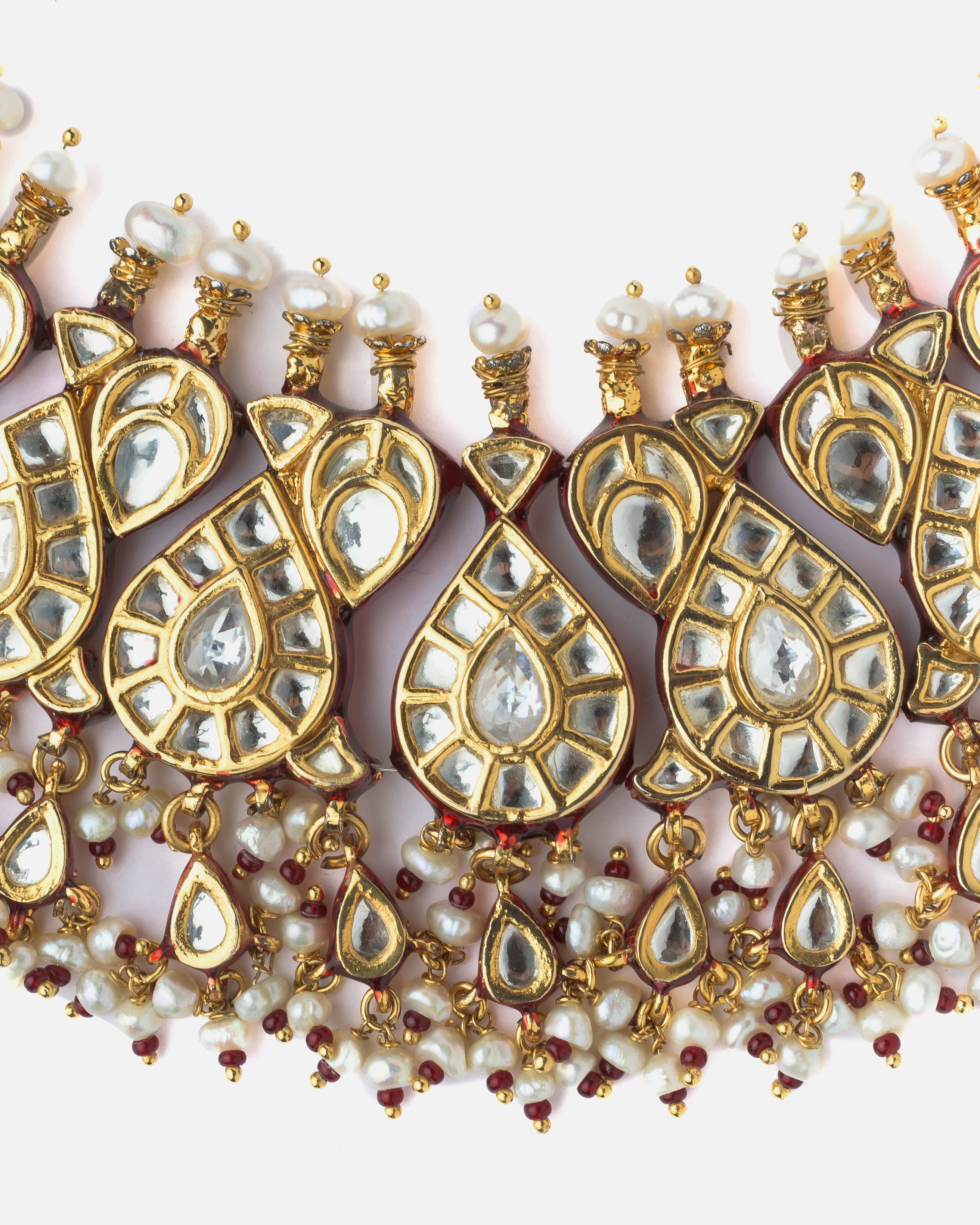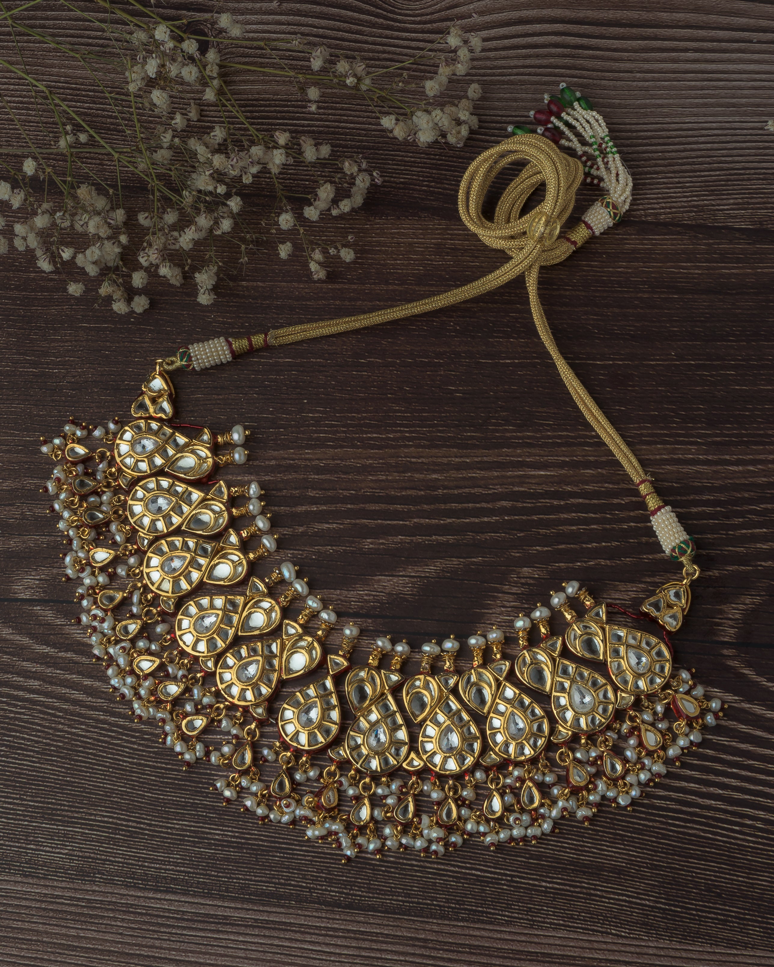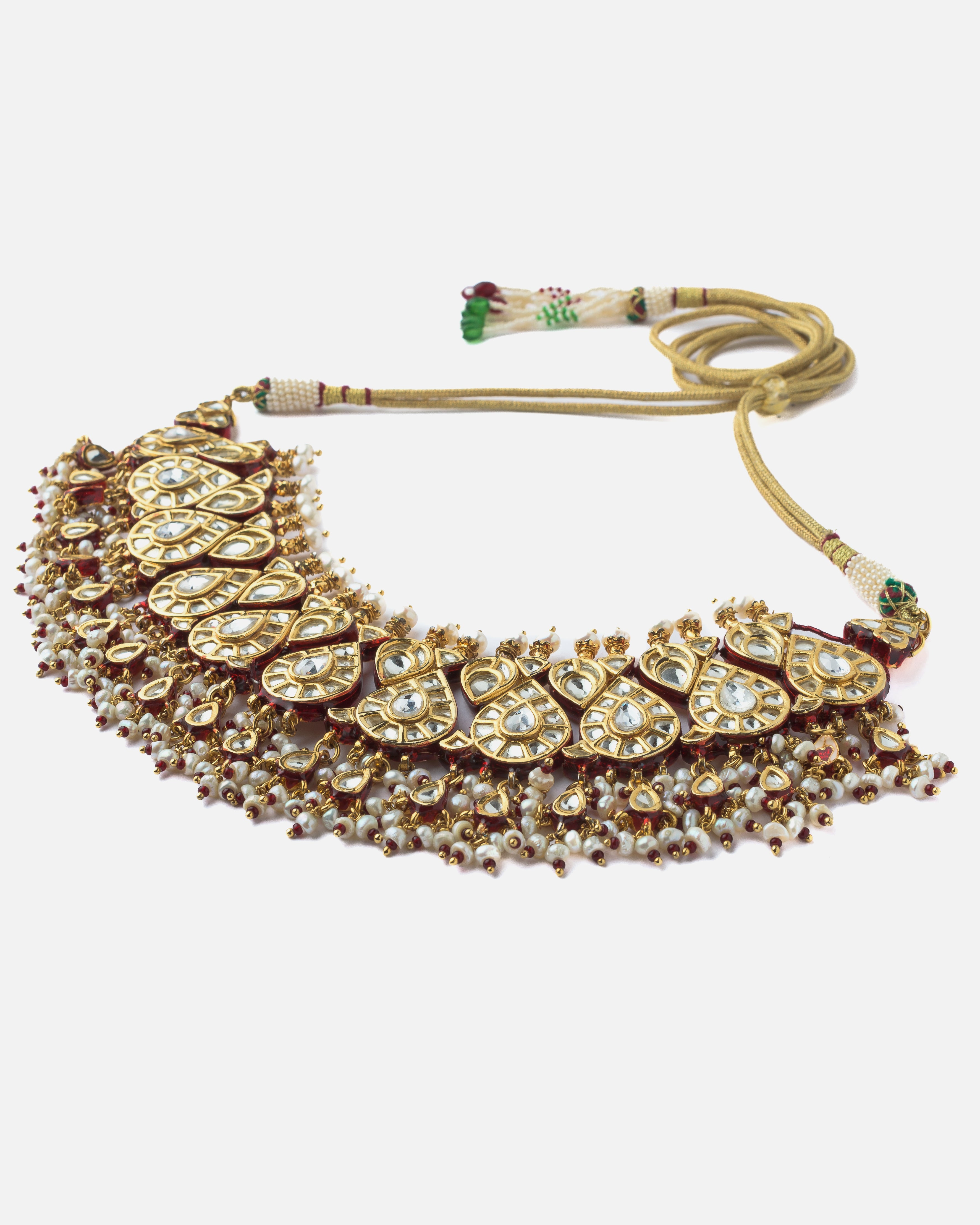 Opulent Kundan choker necklace adorned with intricate gold detailing and pearl accents. A perfect fusion of tradition and elegance, ideal for weddings, festive occasions, and cultural celebrations.