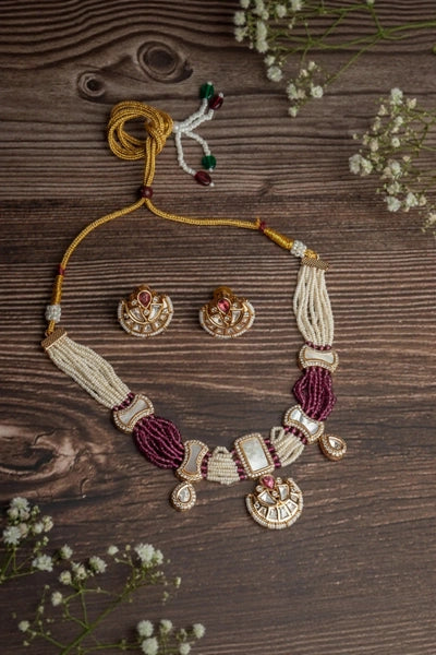 This exquisite jewellery set includes a pearl and maroon beaded necklace with gold-plated detailing and a central pendant. Paired with matching earrings, it's an ideal choice for adding elegance to festive attire.