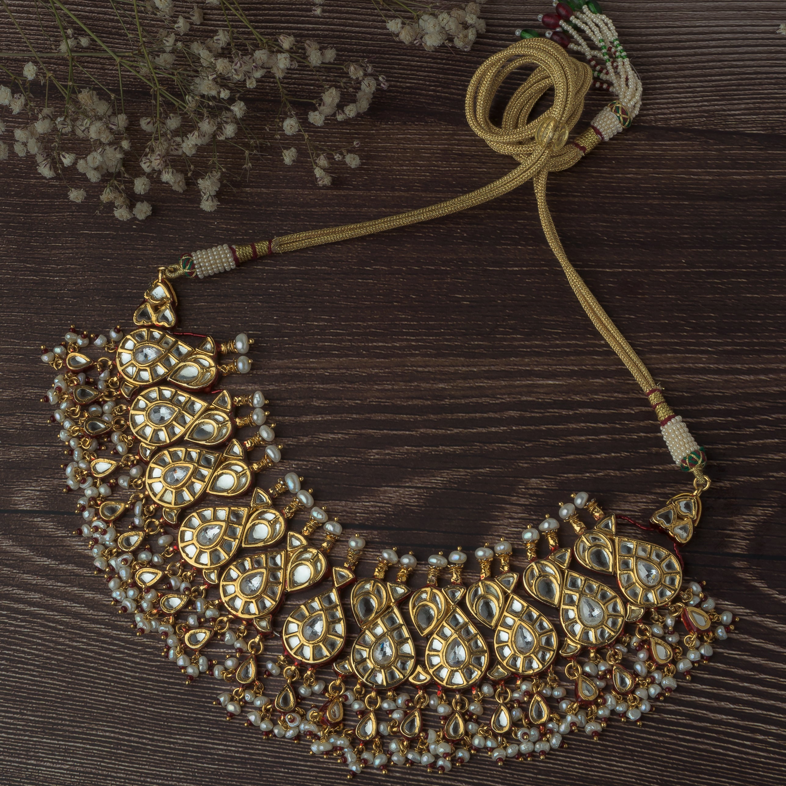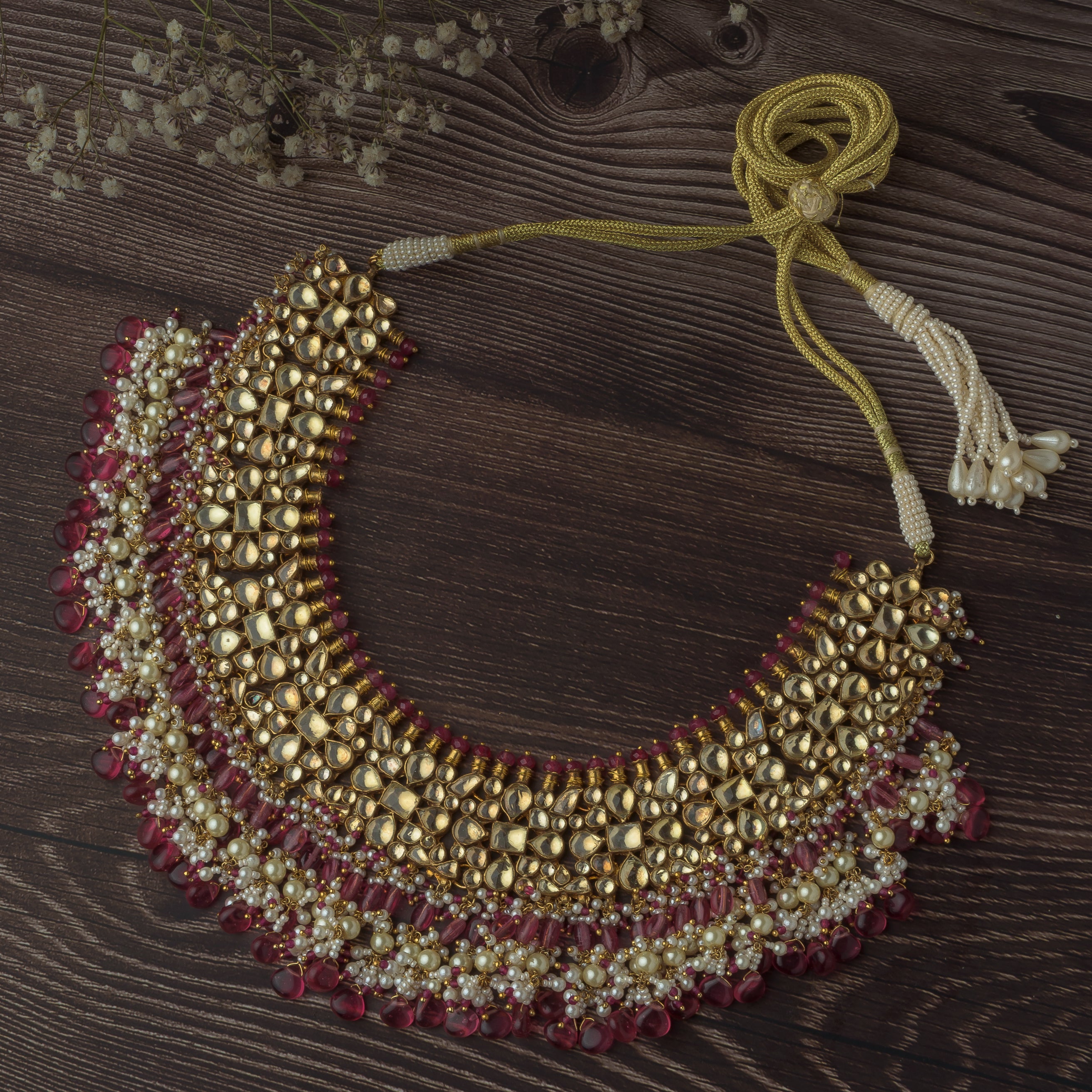Gold Finish Red Kundan Polki & Red Stones Choker Necklace Set