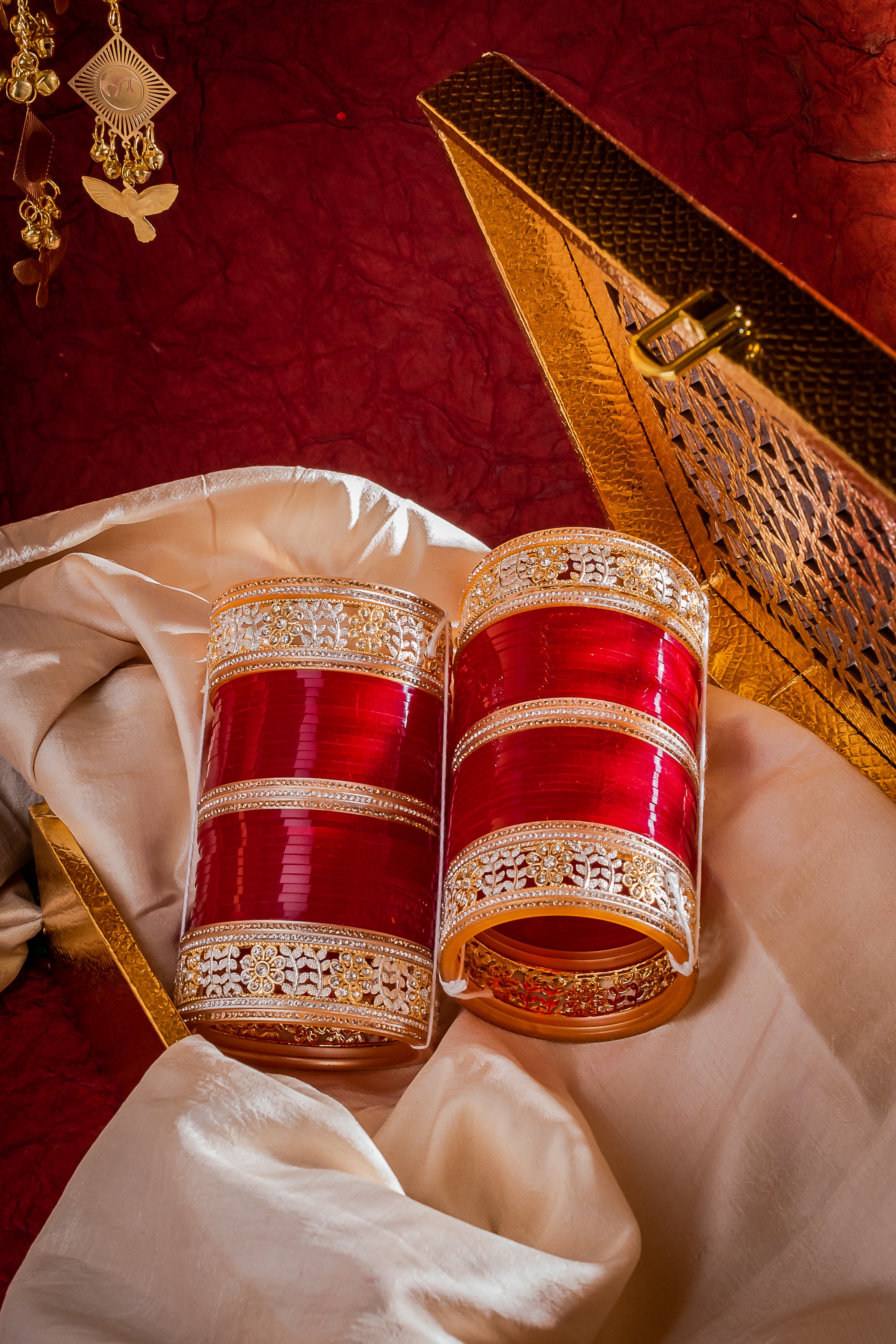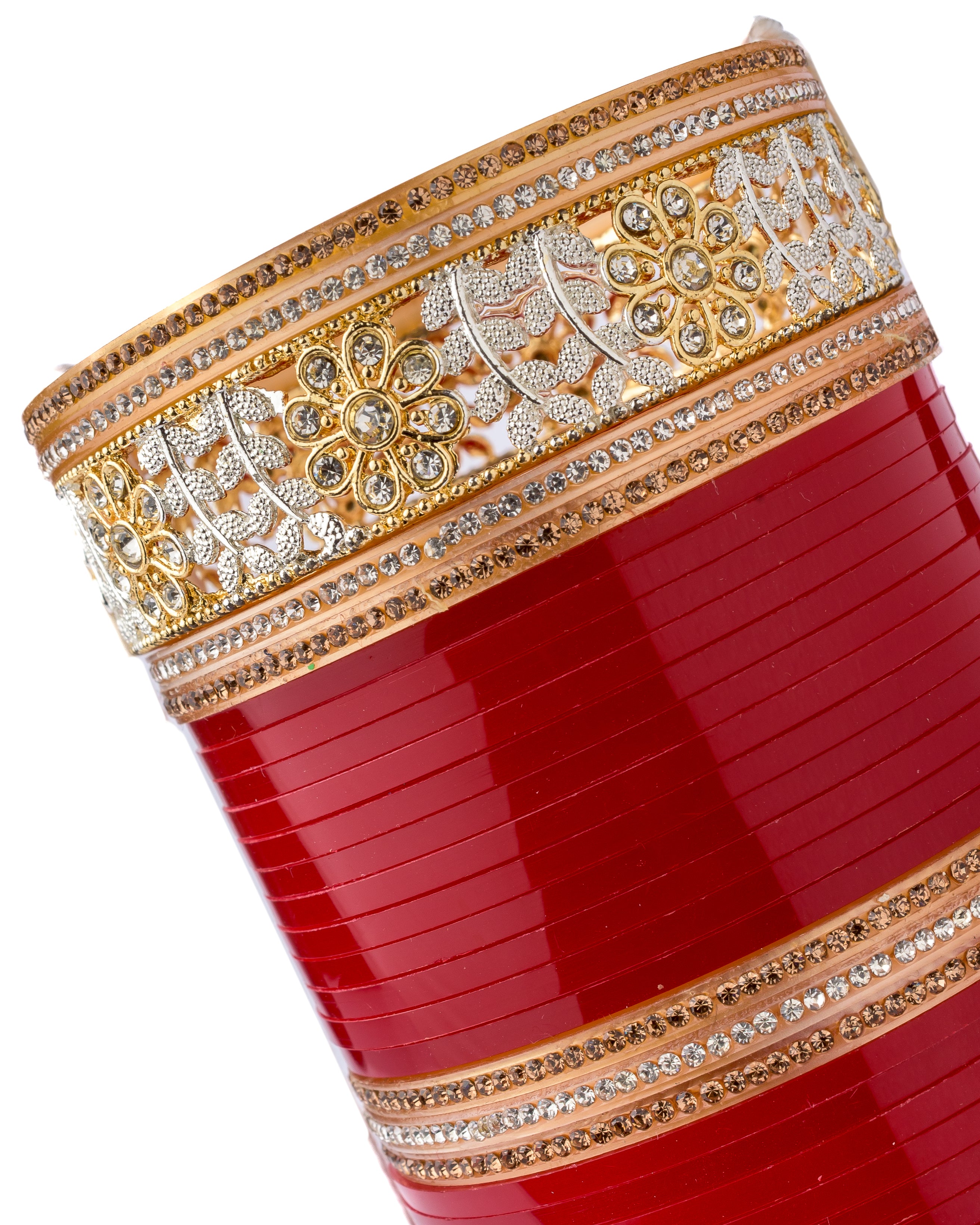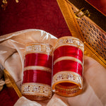Elegant bridal Chuda bangles with a rich red hue and intricate golden detailing, symbolizing tradition and prosperity. Perfect for weddings and festive occasions, adding grace and charm to your ethnic ensemble.