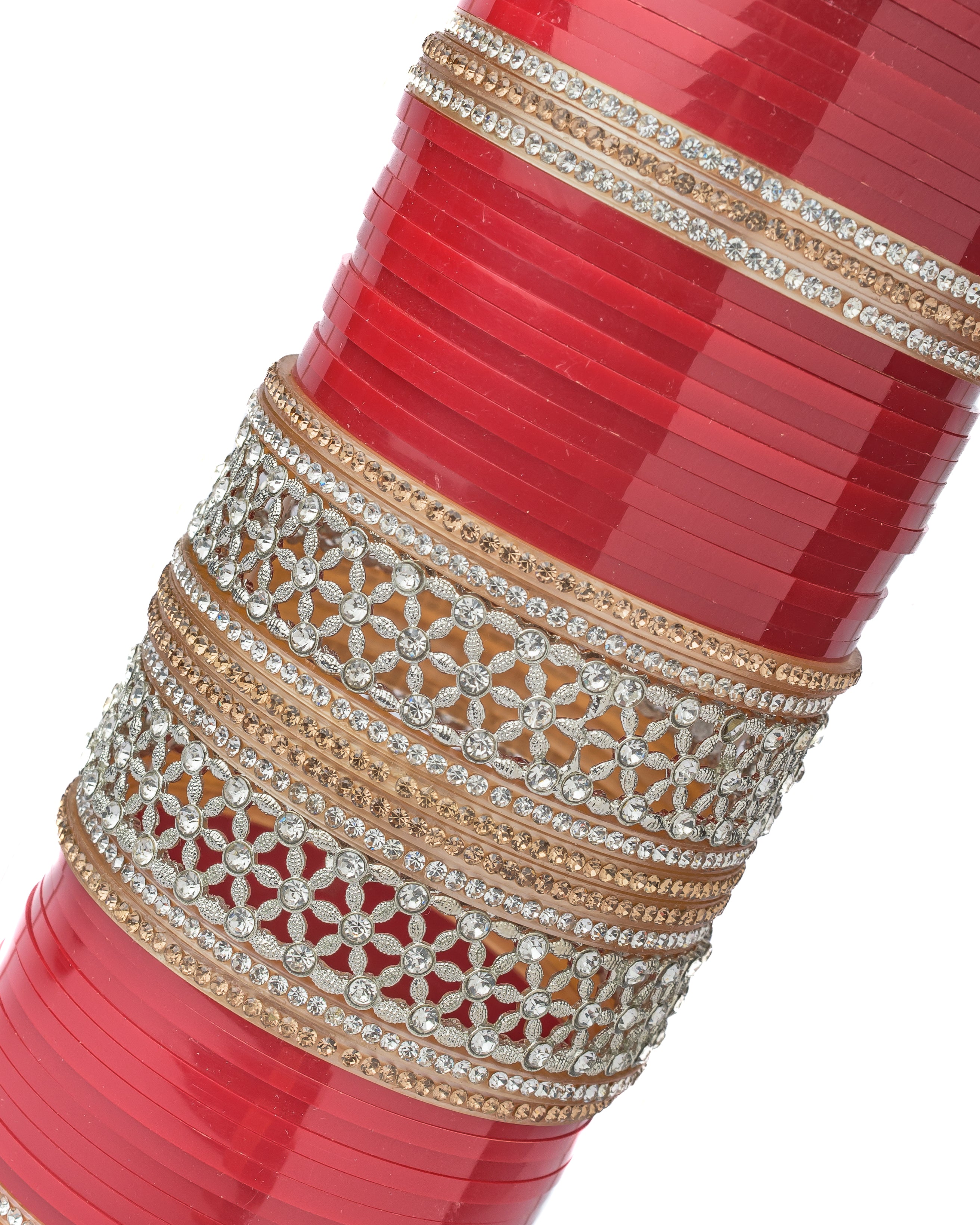 Elegant bridal chuda with rich red and gold detailing, symbolizing tradition and grace. Adorned with intricate embellishments, it adds a royal touch to any wedding attire. A perfect blend of heritage and style.