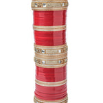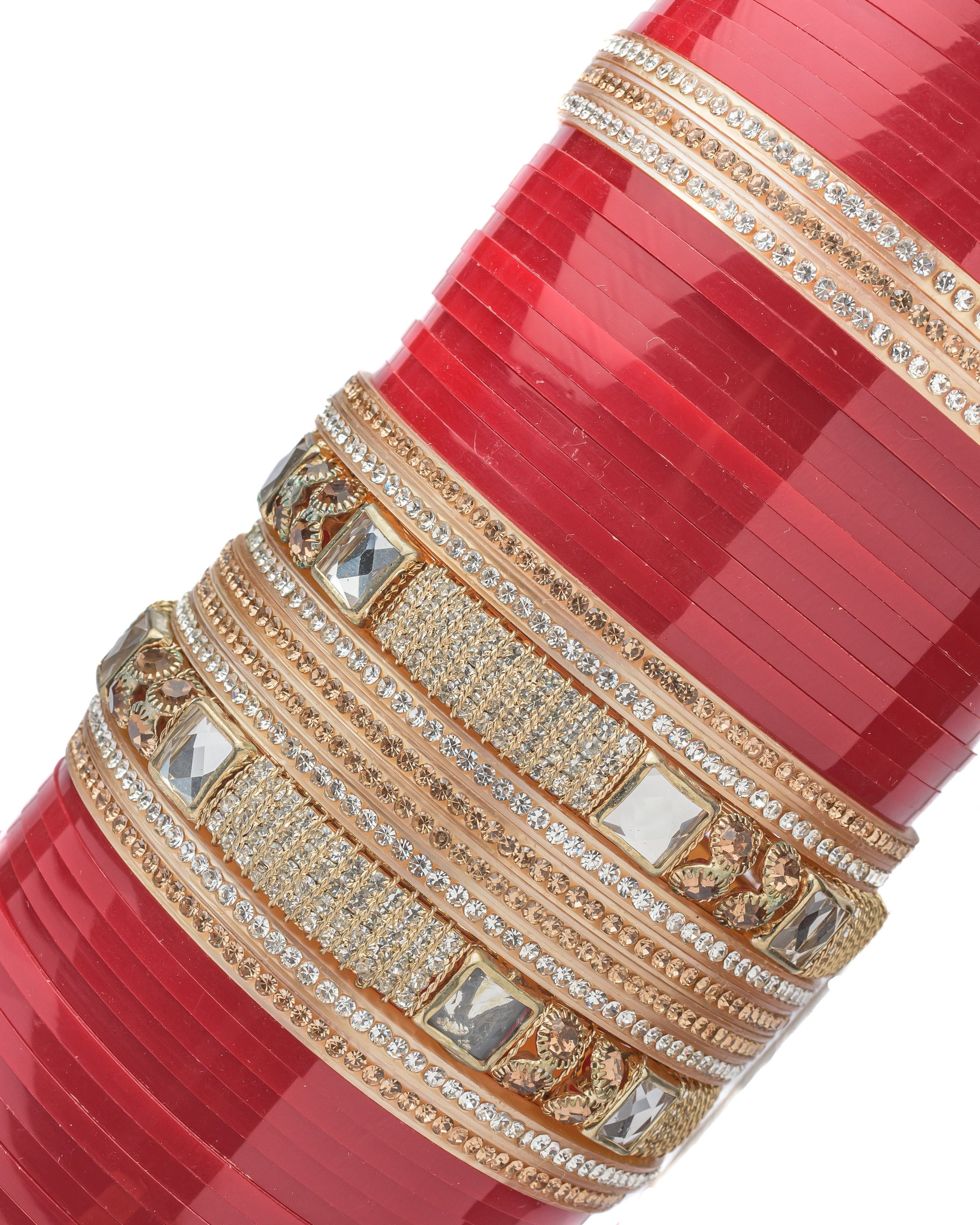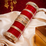 Elegant bridal chuda set with a vibrant red finish, adorned with intricate gold embellishments and sparkling stonework. A symbol of tradition and grace, perfect for weddings and special occasions. Lightweight & durable.