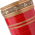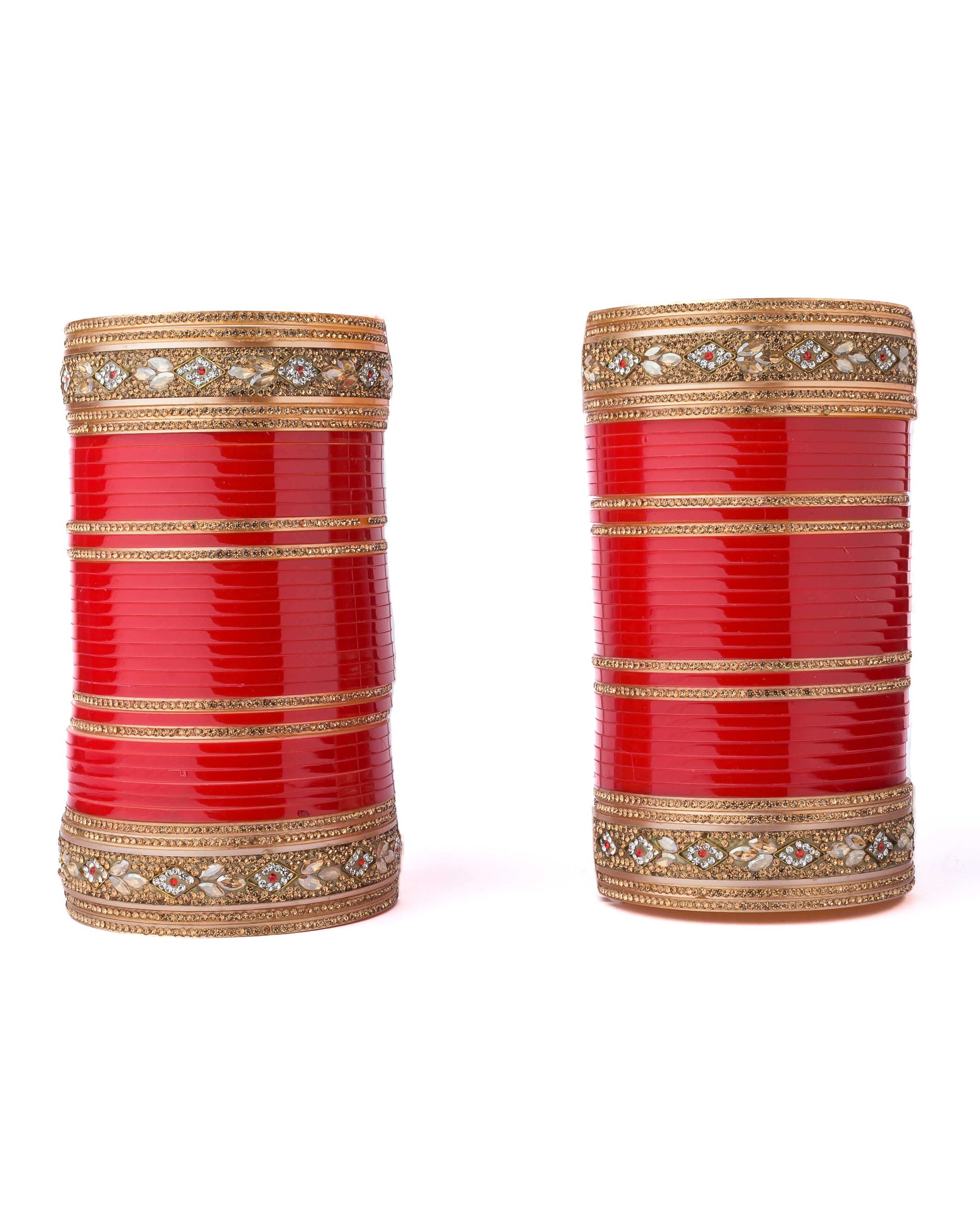 Elegant bridal chuda with traditional red and gold detailing, symbolizing love and prosperity. Crafted with intricate embellishments, this bangle set adds charm to any bridal attire, perfect for weddings & ceremonies.