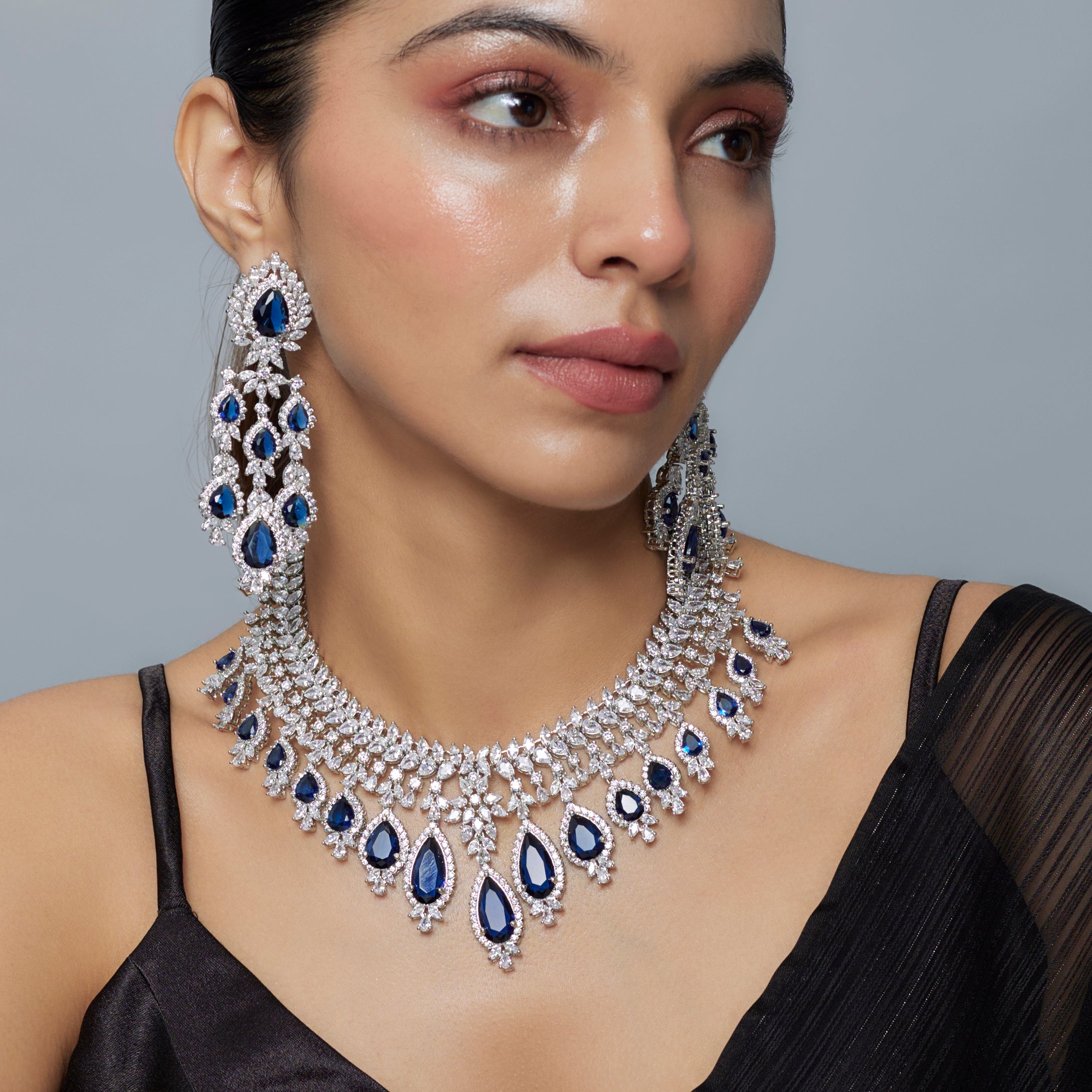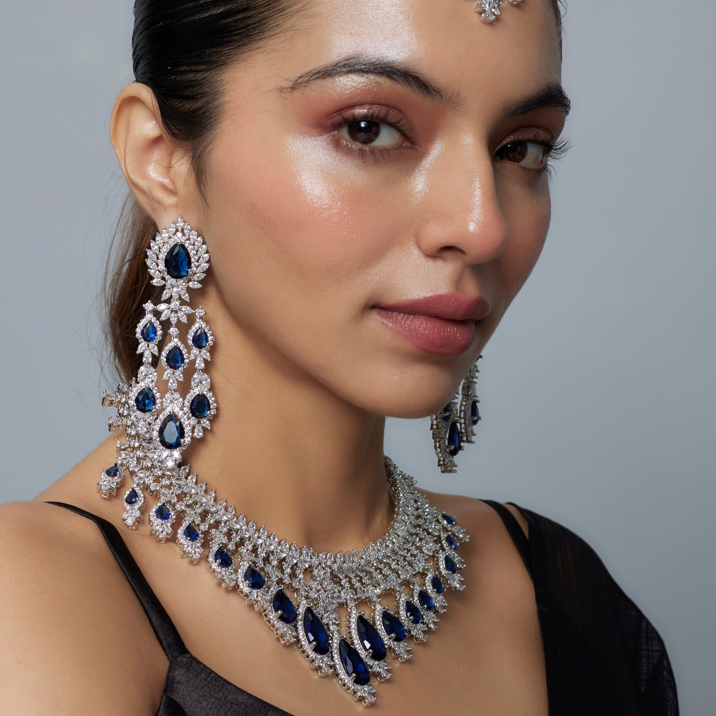 Zia Silver Plated Blue Womens Zircon Short Necklace Set with Pair of Dangler Earrings & Maangtikka
