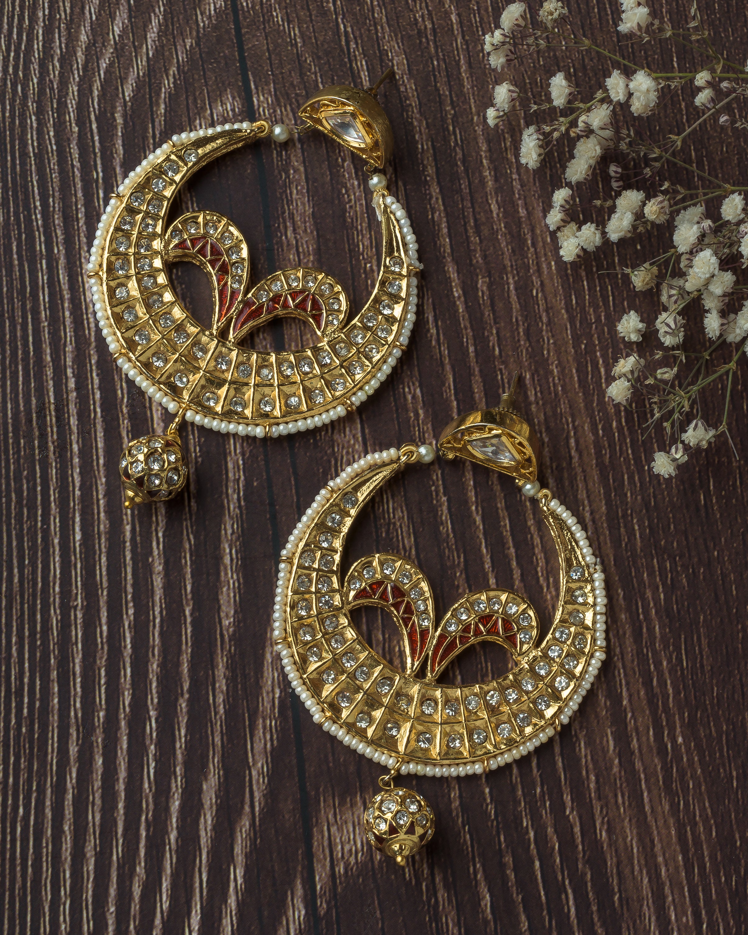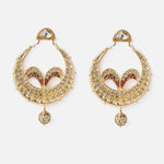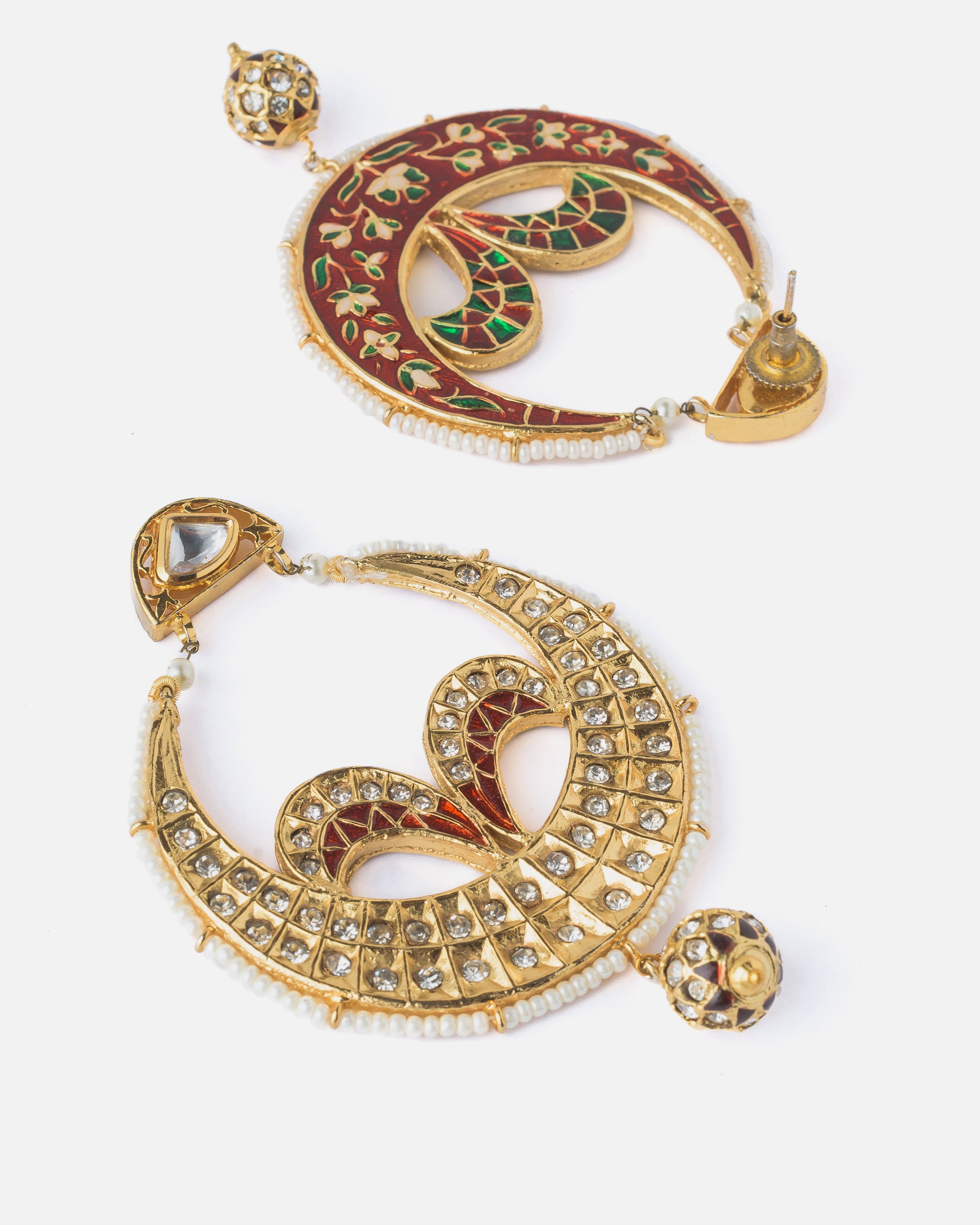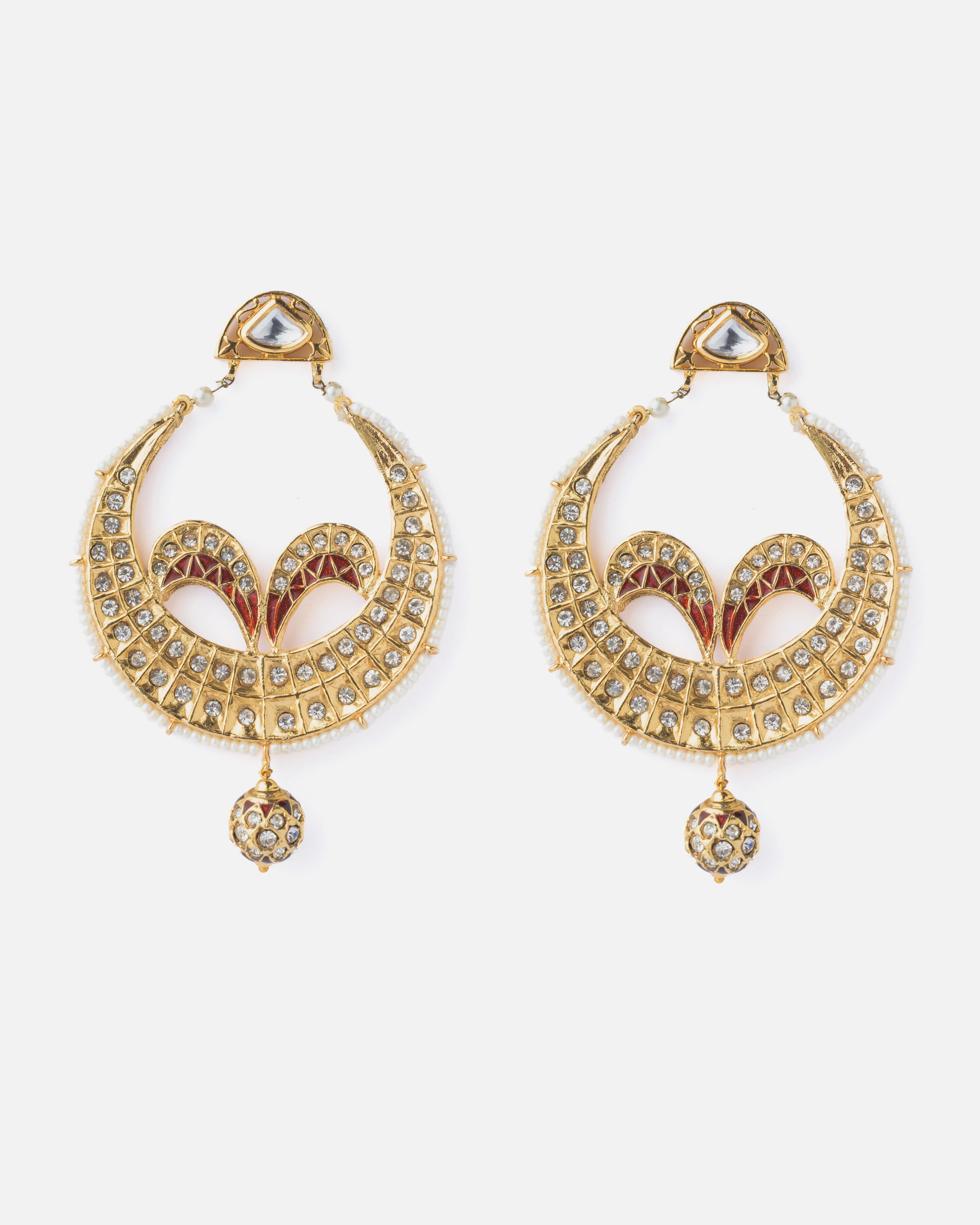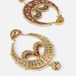 Exquisitely crafted traditional chandbali earrings with intricate meenakari work, studded with sparkling stones and finished with a hanging bead. A regal accessory perfect for weddings and festive occasions.