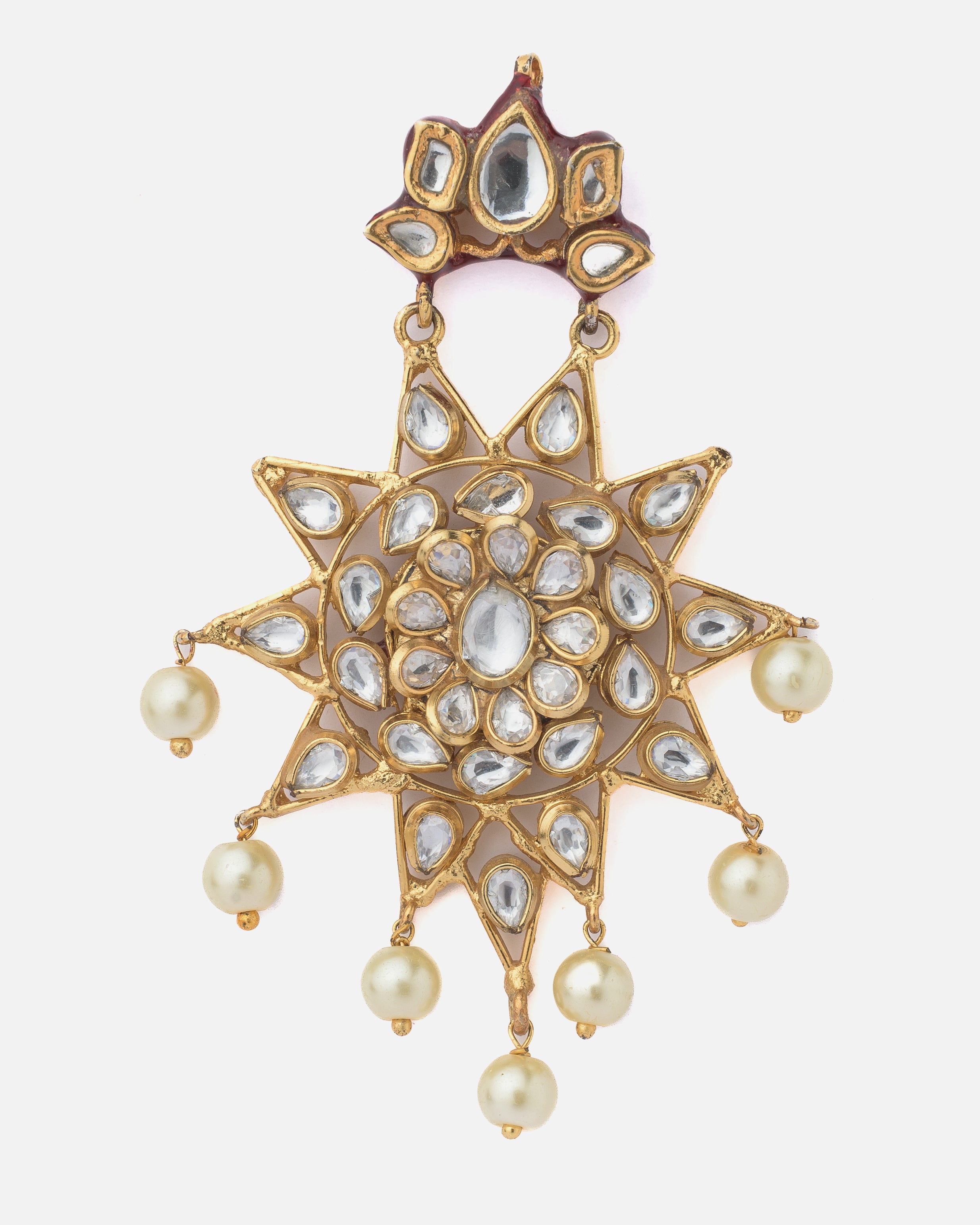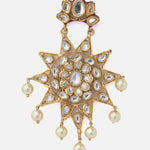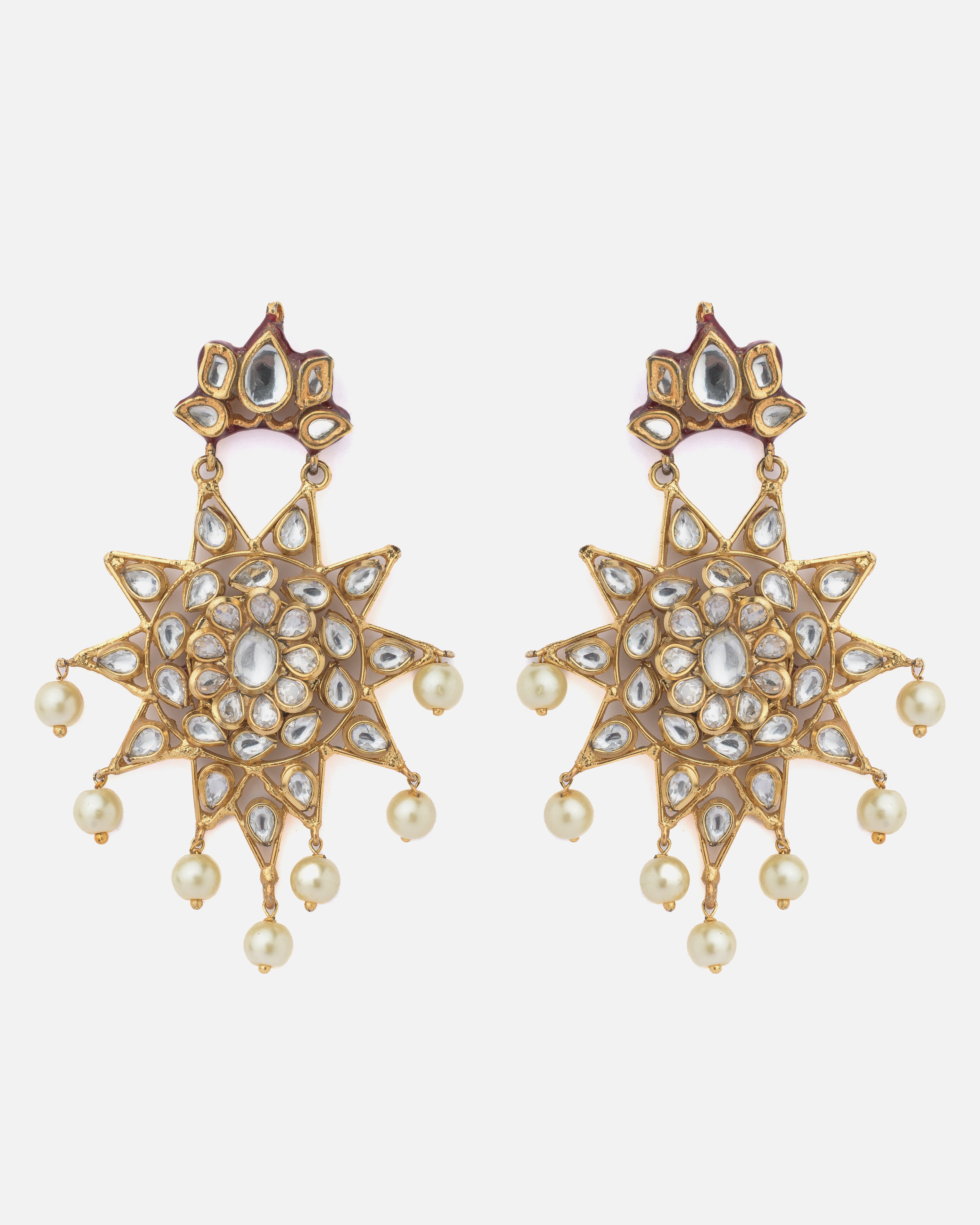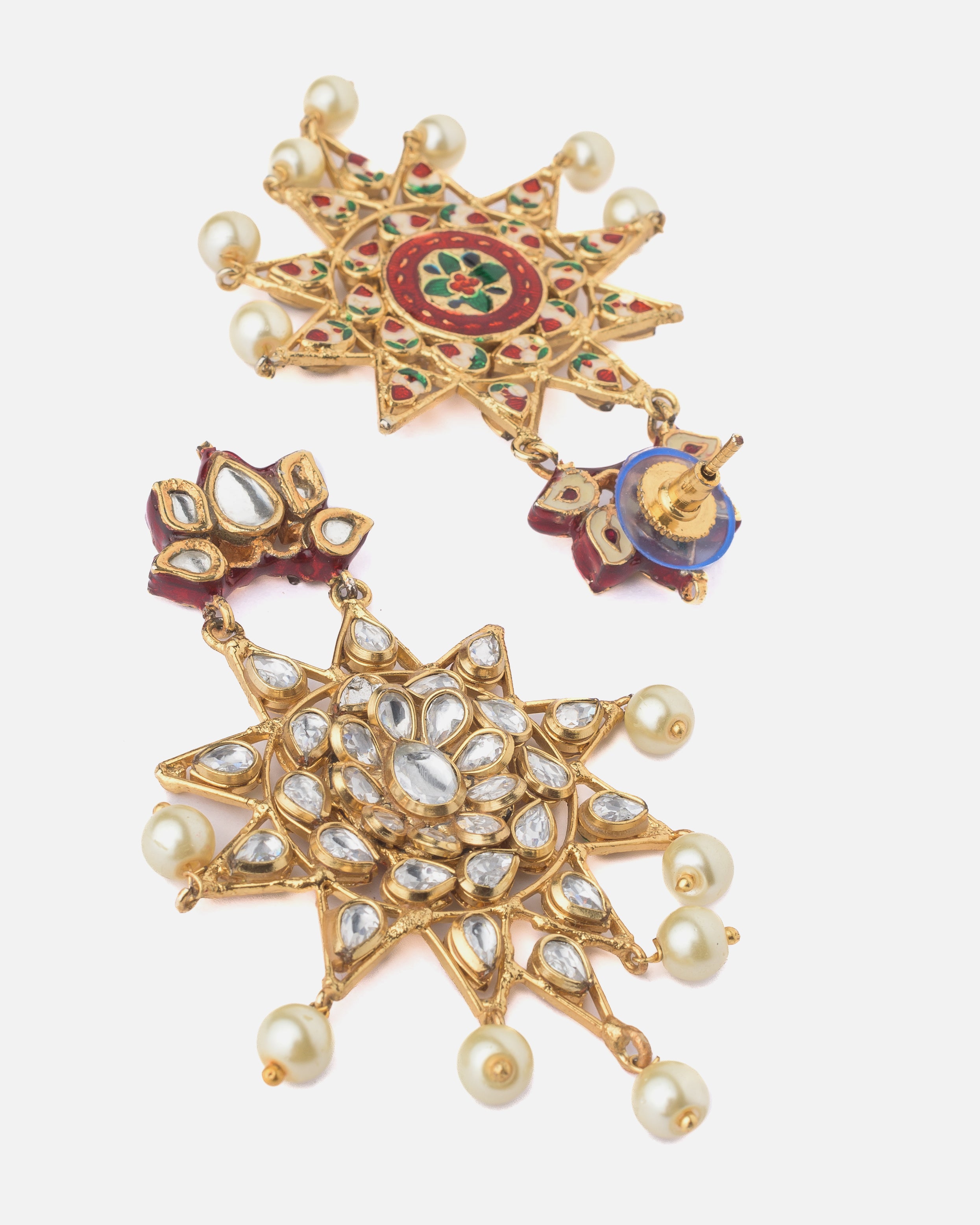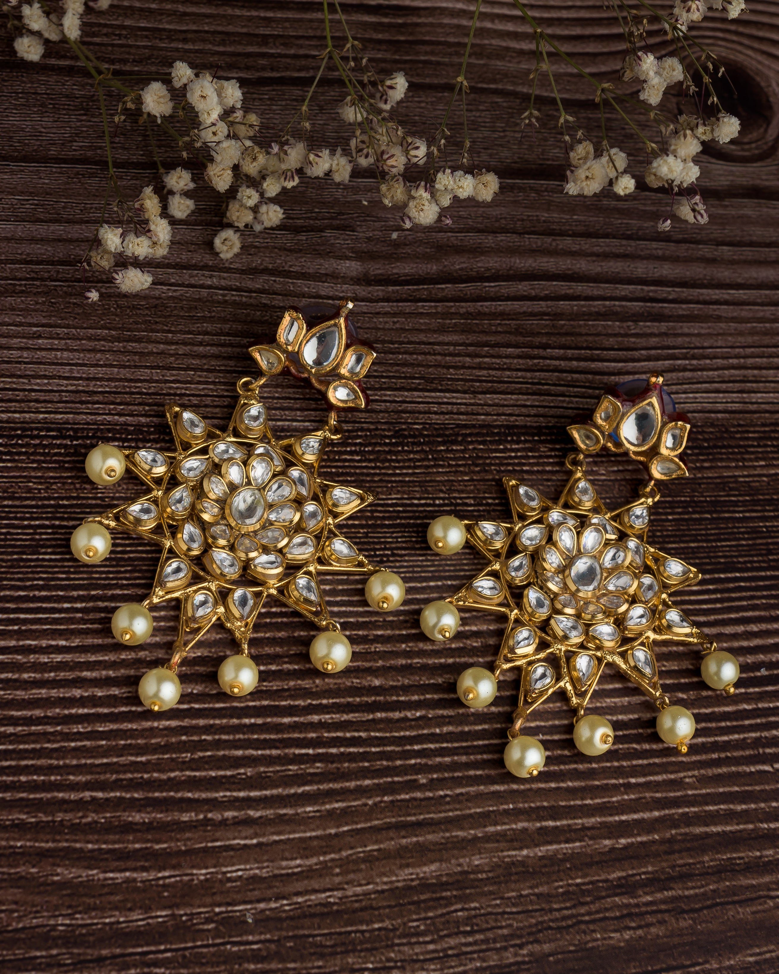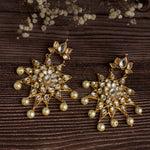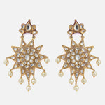 Radiant starburst-style gold-tone earrings embellished with sparkling white stones and pearl drops. A stunning accessory that adds festive sparkle and elegance to any traditional or party outfit.