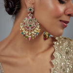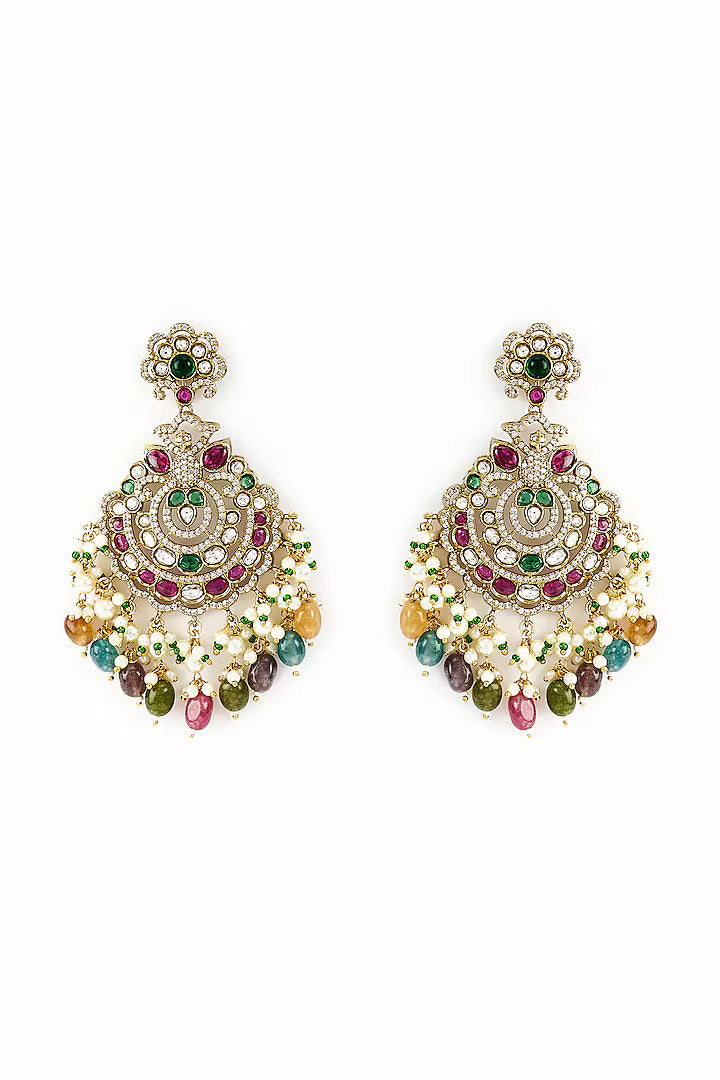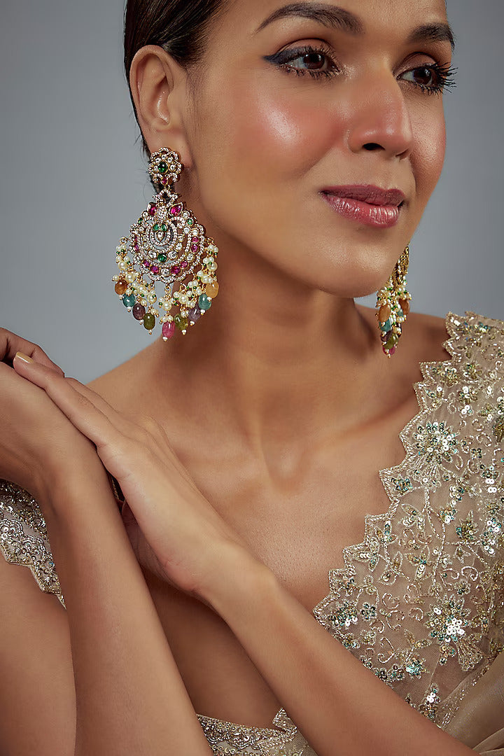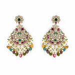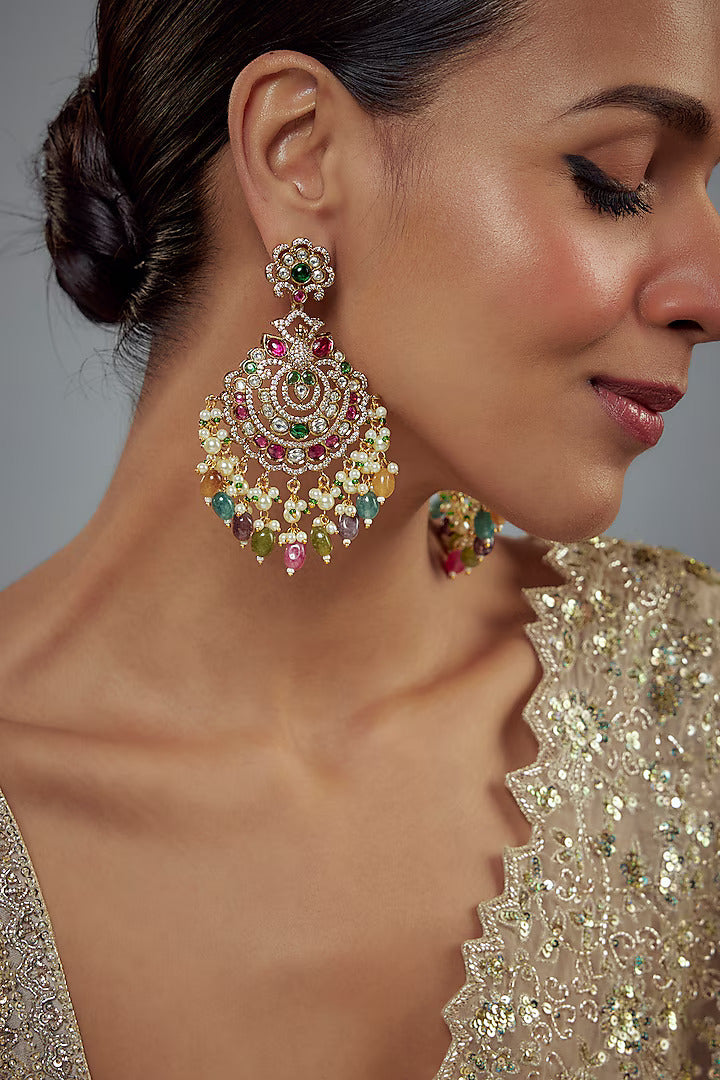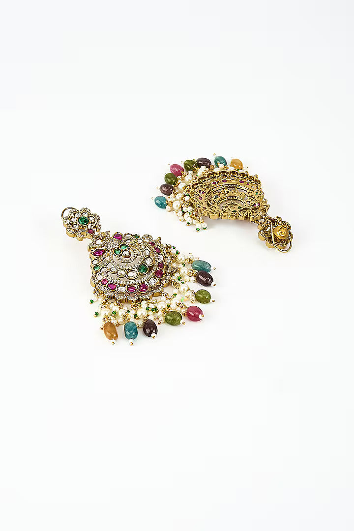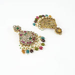 These exquisite statement earrings feature intricate gold-toned detailing adorned with vibrant multi-colored gemstones. Perfect for festive occasions, they exude elegance & timeless charm.