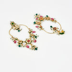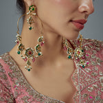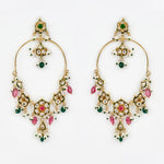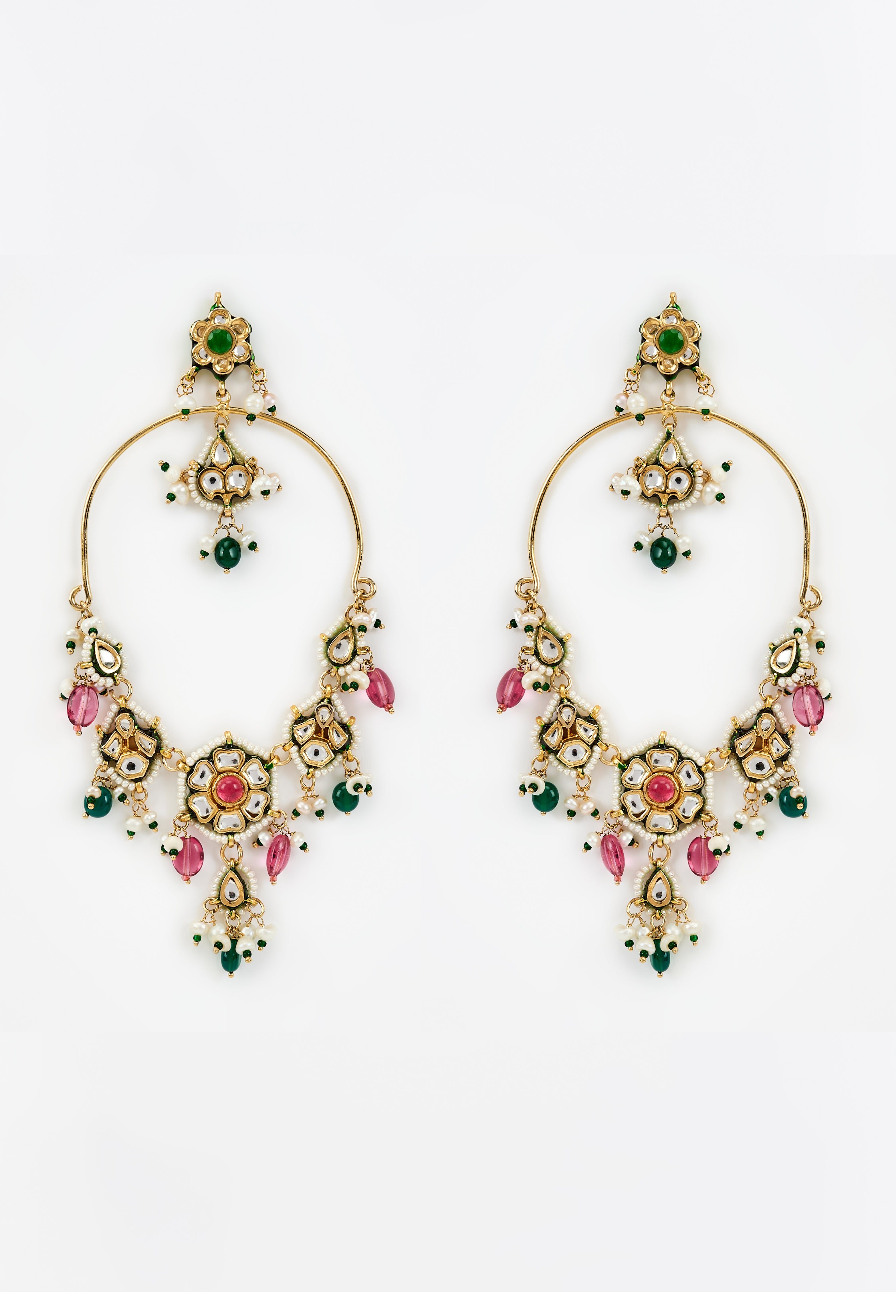 Elegant traditional earrings featuring intricate Kundan work,green & pink beads & pearl embellishments. Perfectly complements festive & bridal outfits with their unique craftsmanship and regal charm.
