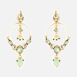 These elegant statement earrings feature a gold-toned base adorned with polki-style stones, pink accents, and green bead drops, adding a perfect blend of tradition and modern charm for festive occasions.
