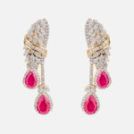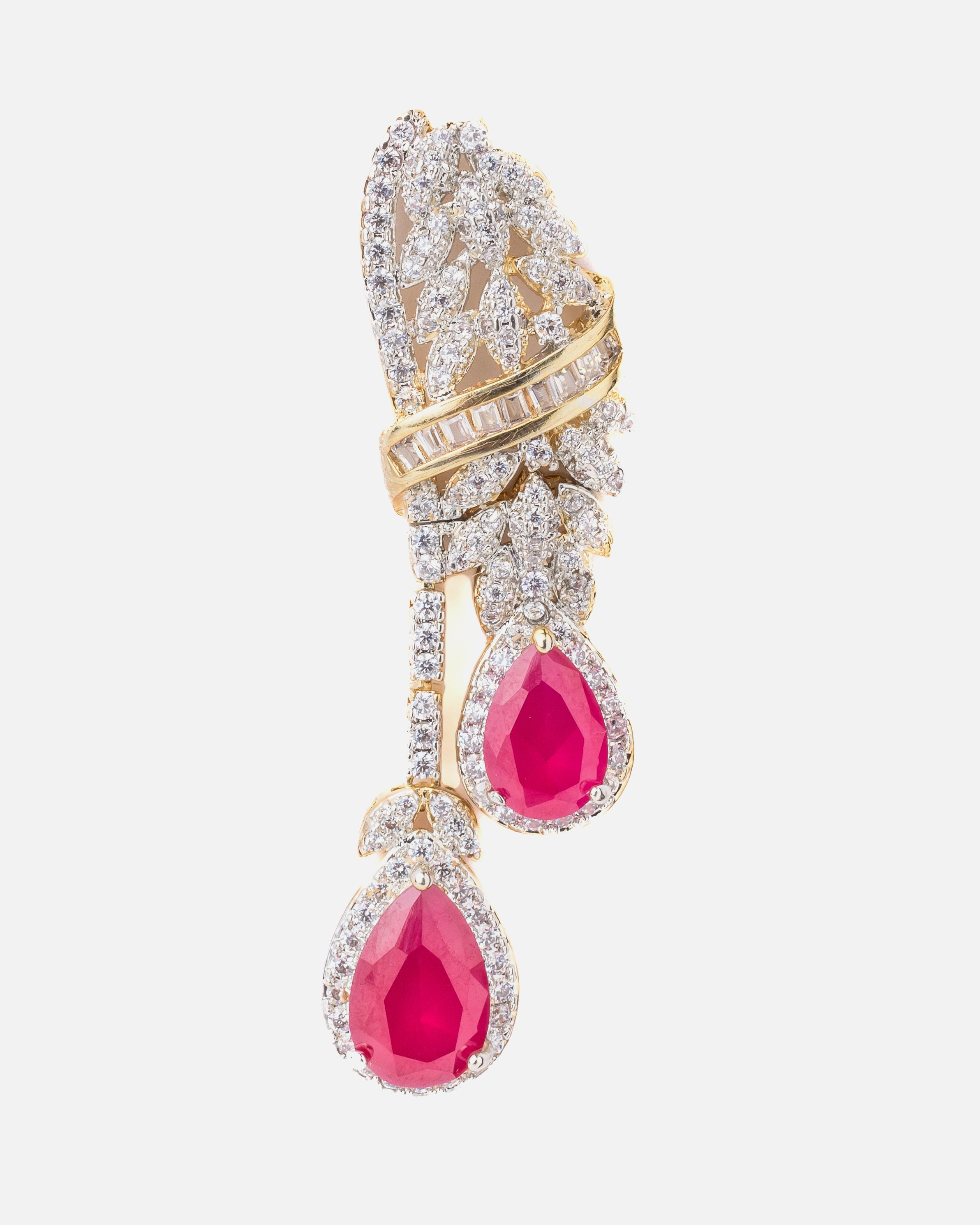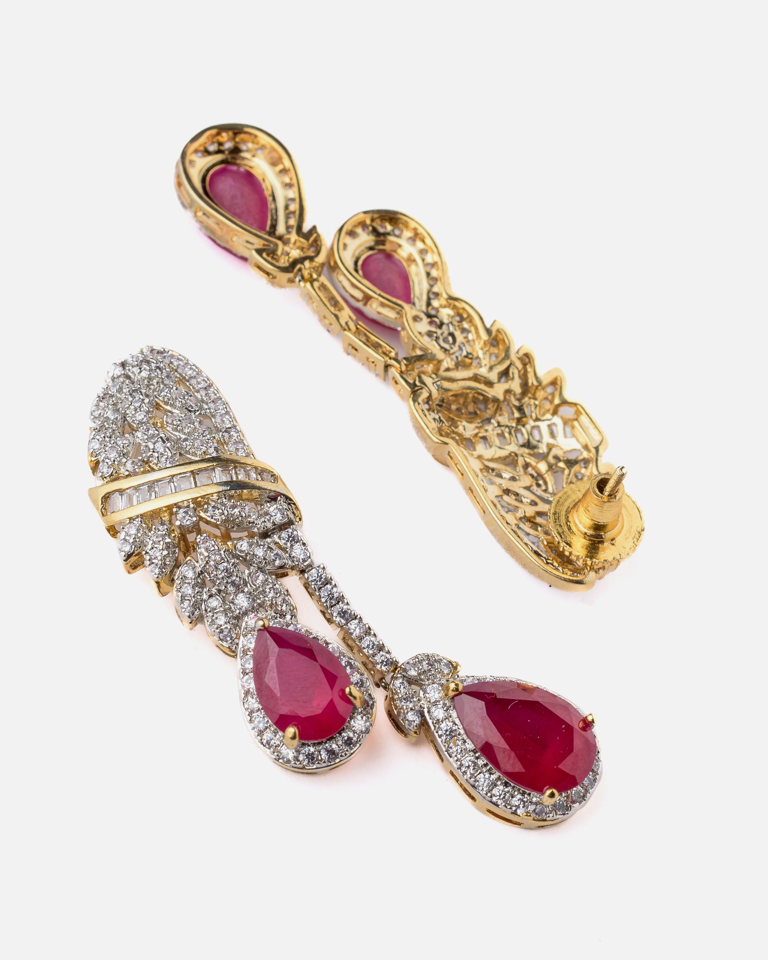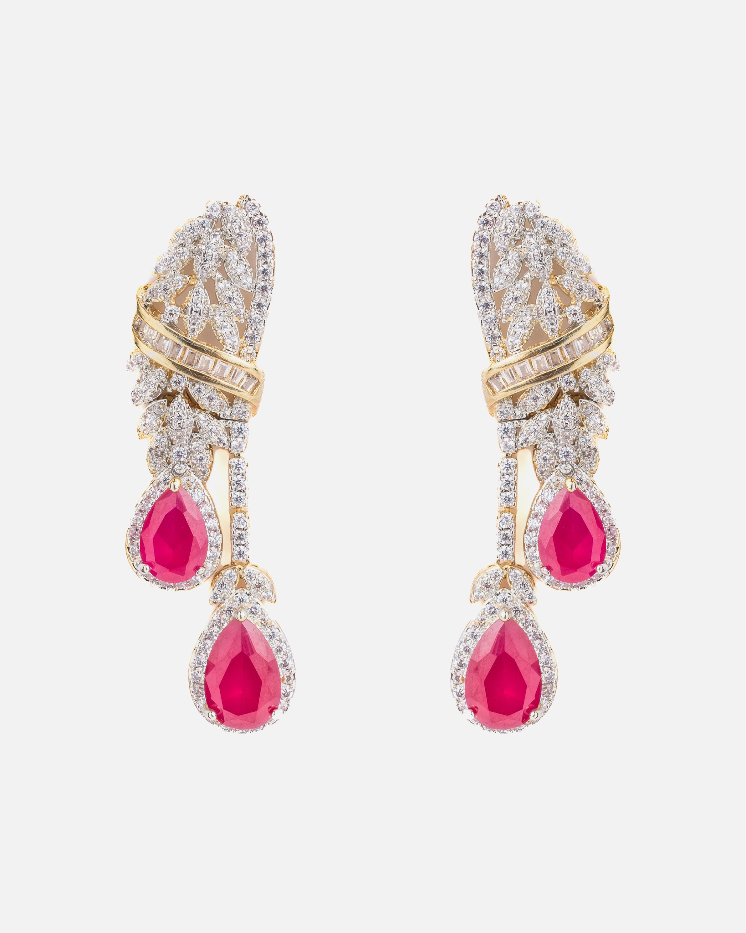 Elegant ruby and diamond-studded earrings crafted with precision. Featuring dazzling white stones and deep red gemstones, these statement earrings add a touch of royalty and sophistication to any outfit.