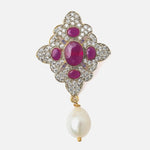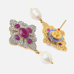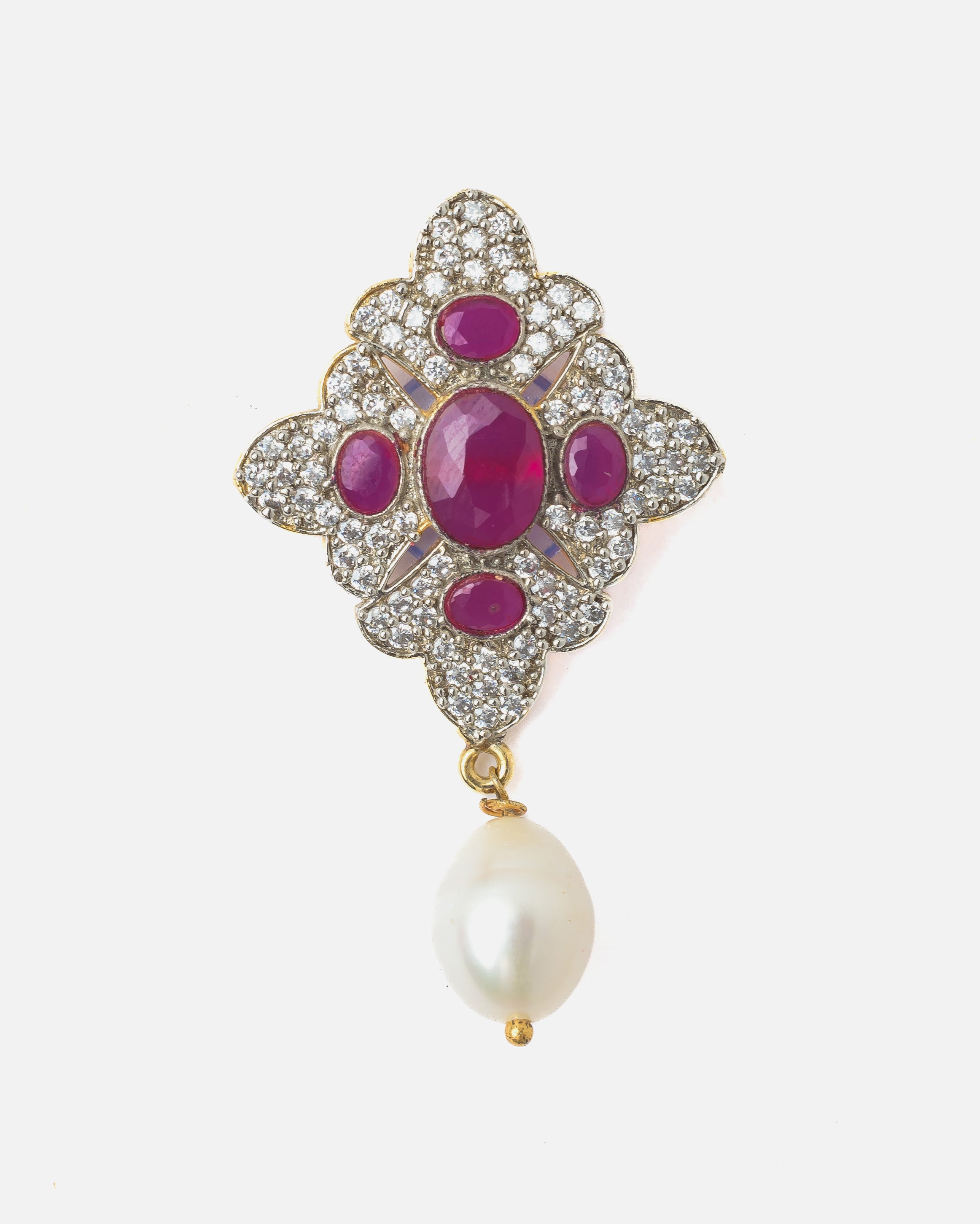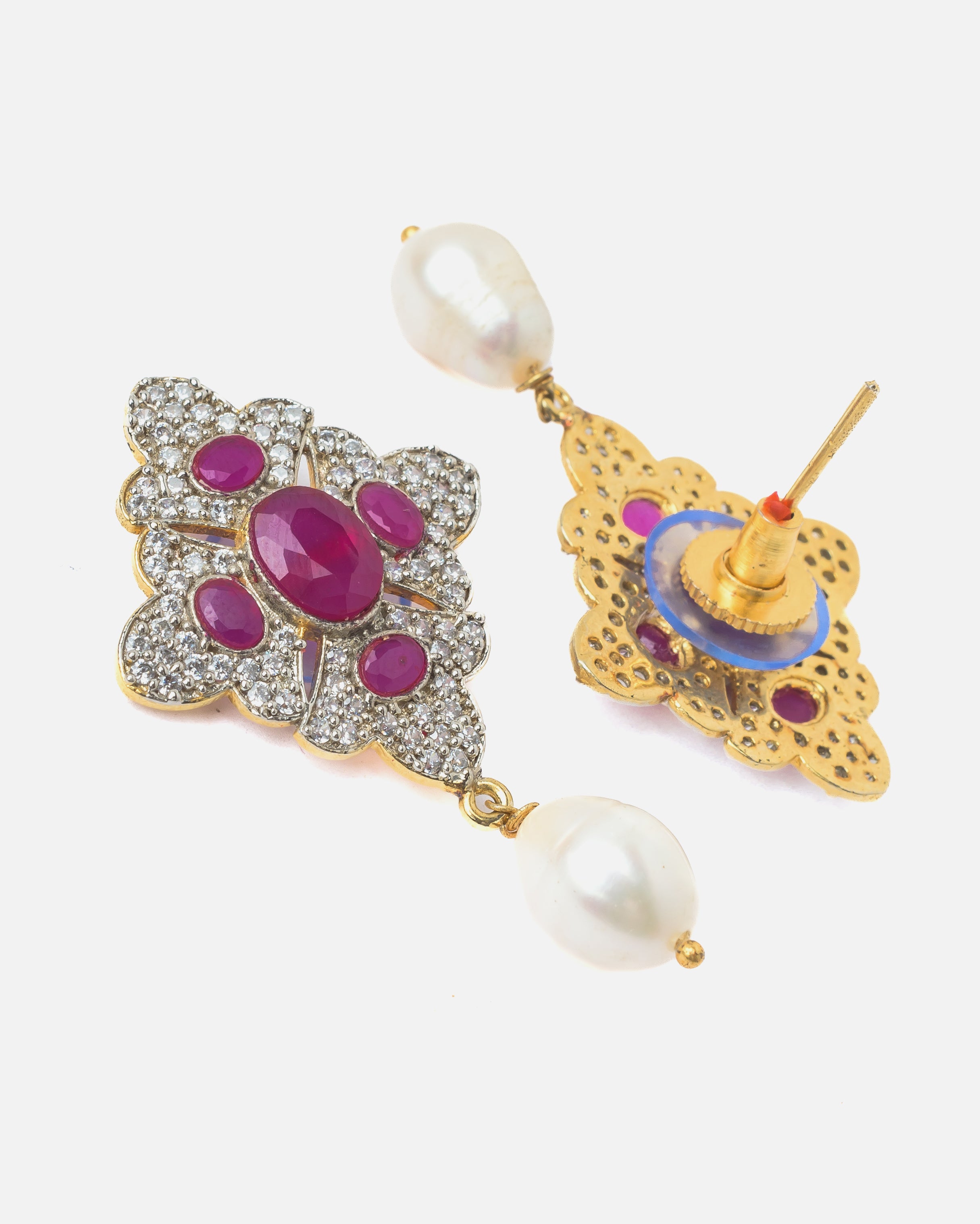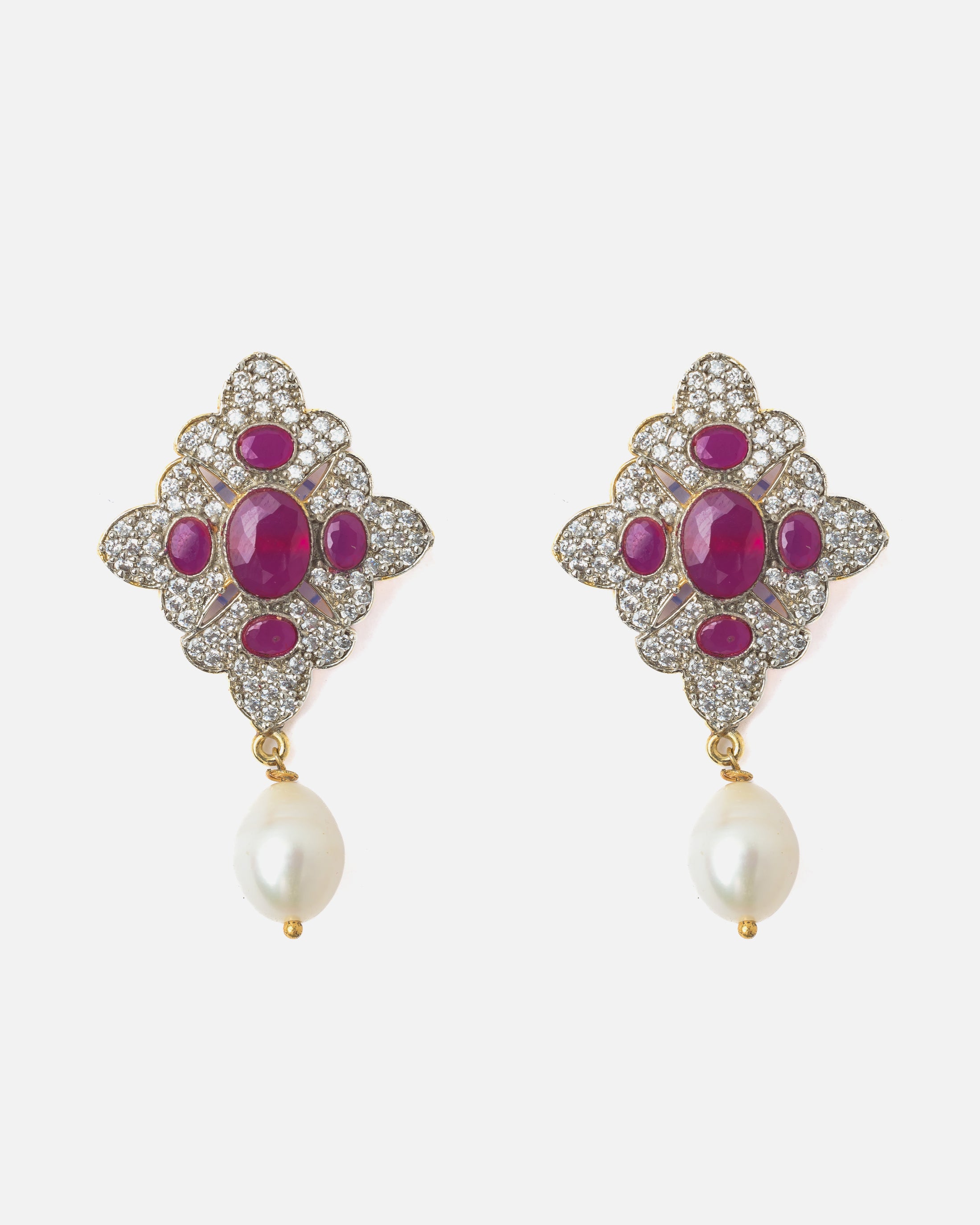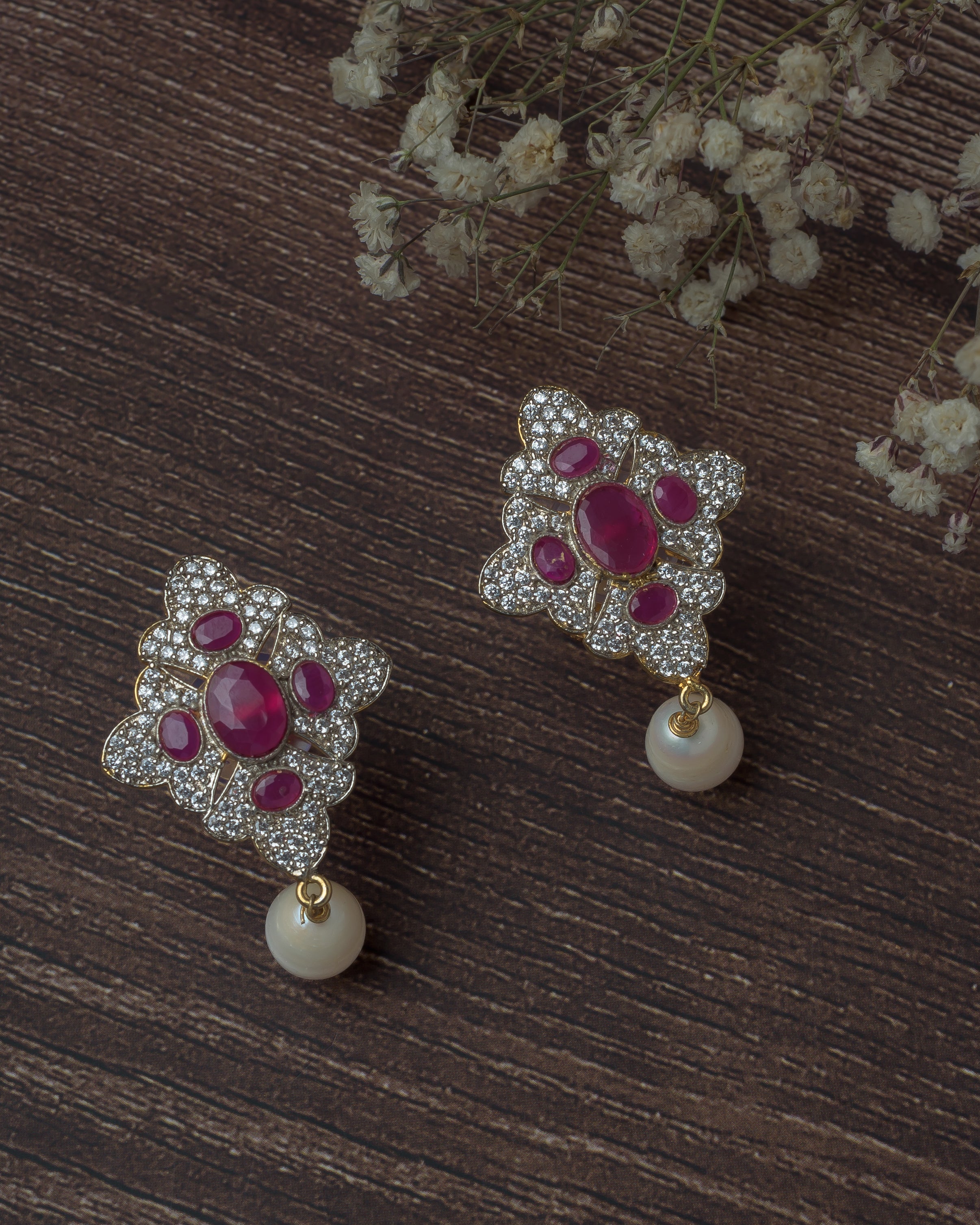 These exquisite earrings showcase a vibrant cluster of ruby-toned stones set in a silver-toned floral frame, finished with a delicate pearl drop. Ideal for festive, bridal, or traditional occasions.
