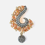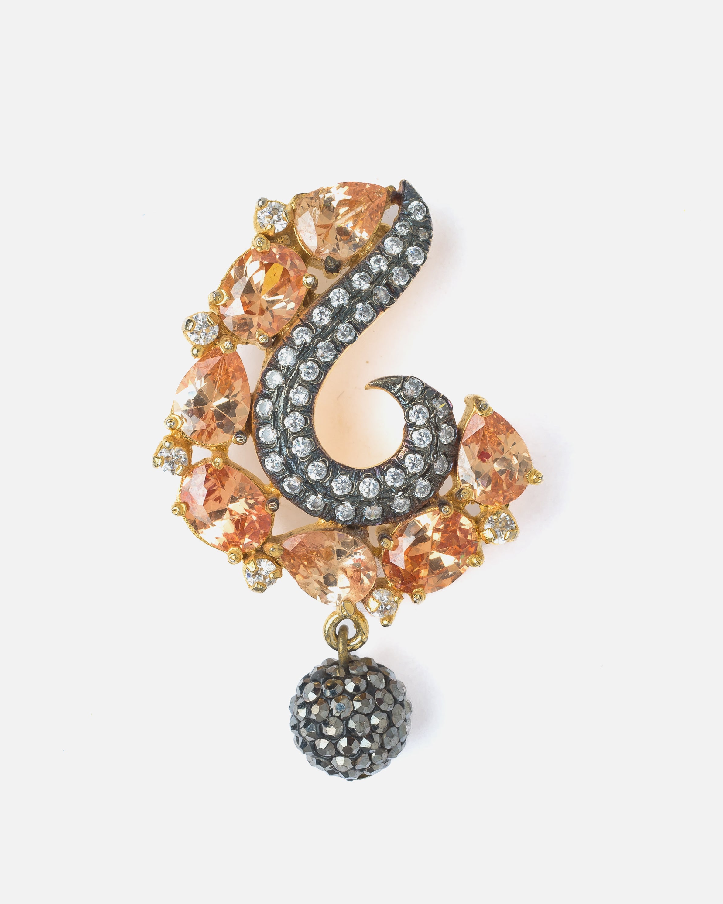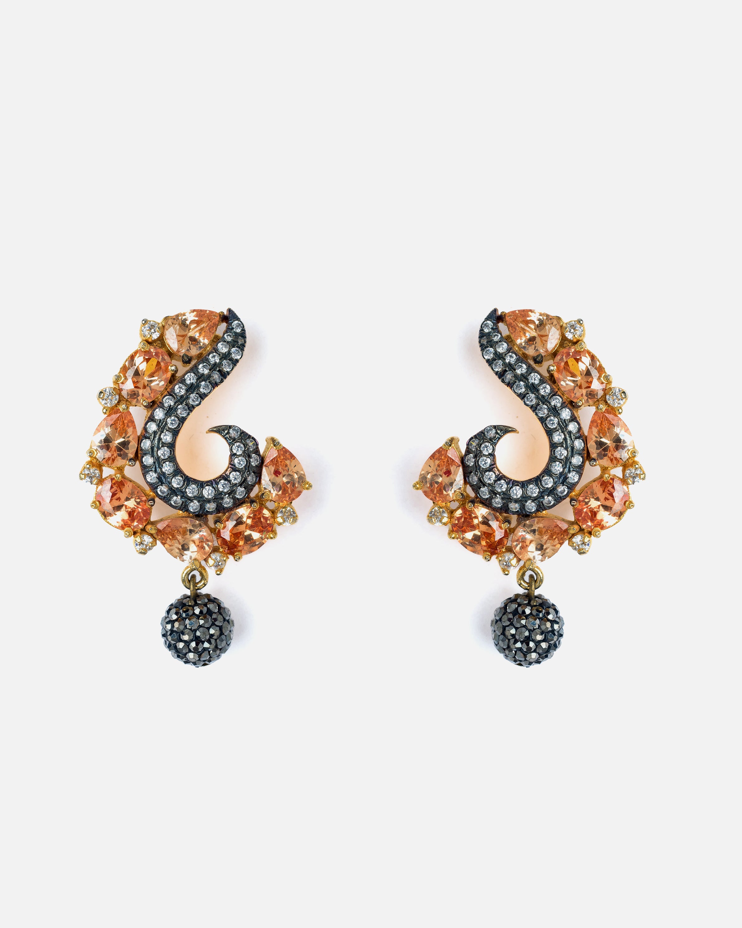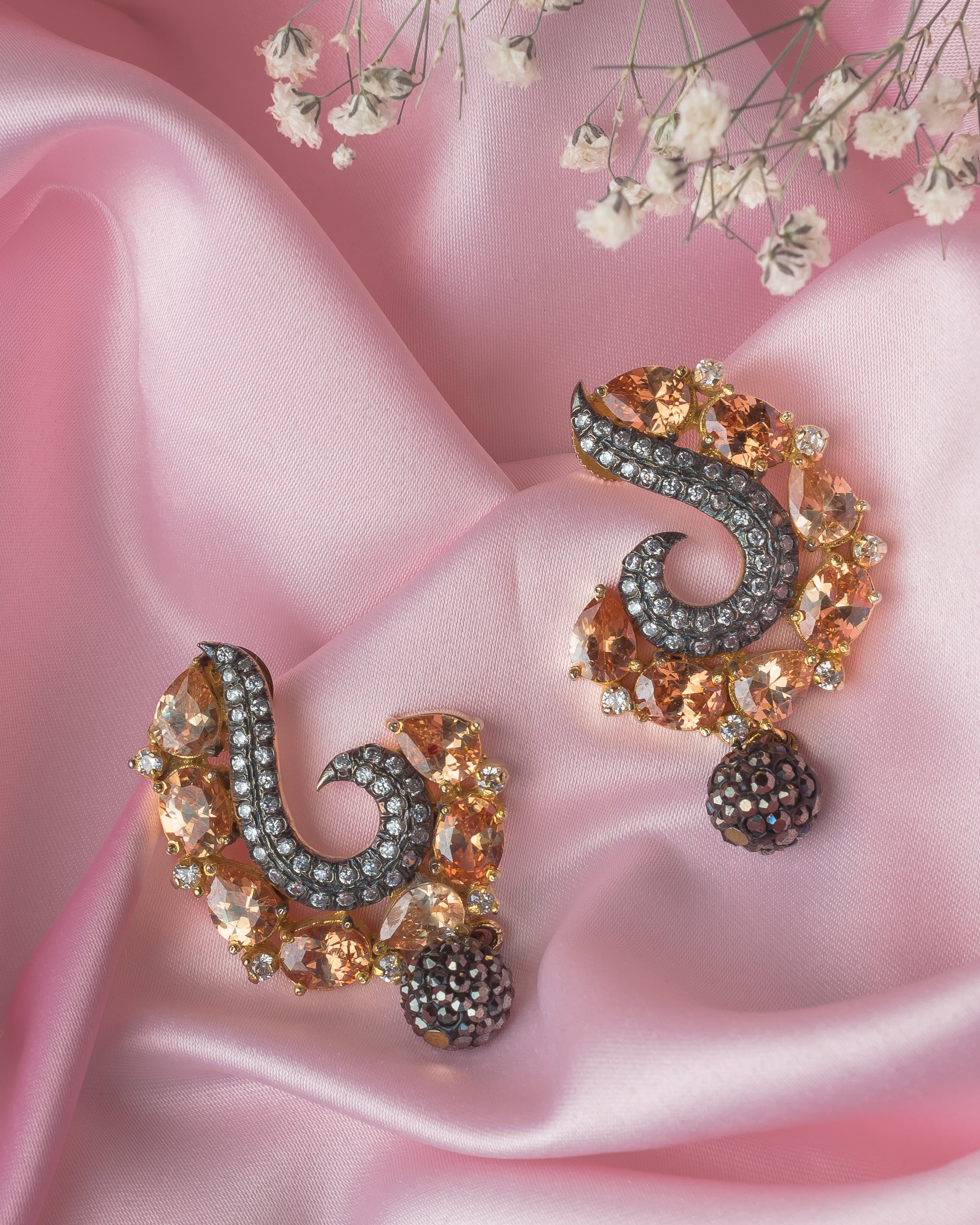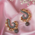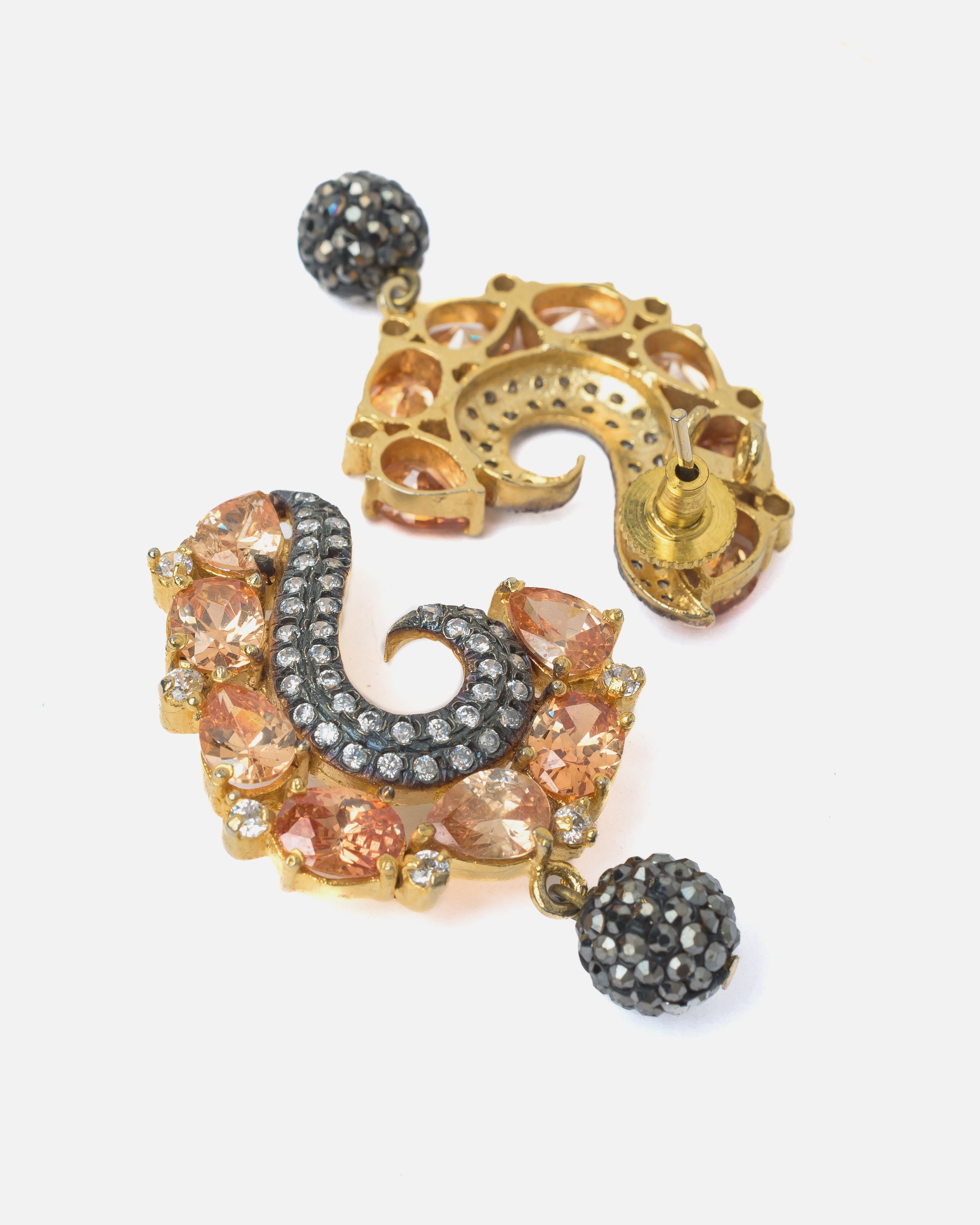 Elegant and eye-catching, these designer earrings feature a unique paisley-inspired design adorned with sparkling golden and black stones. Perfect for festive occasions or a glamorous evening look.
