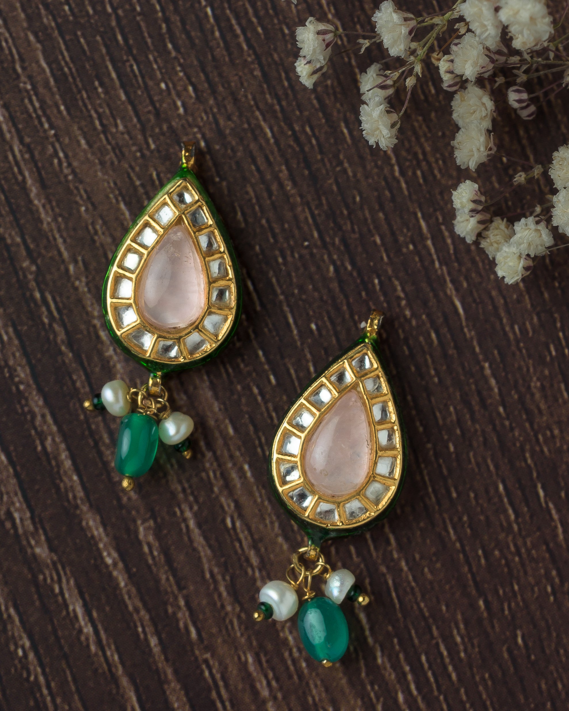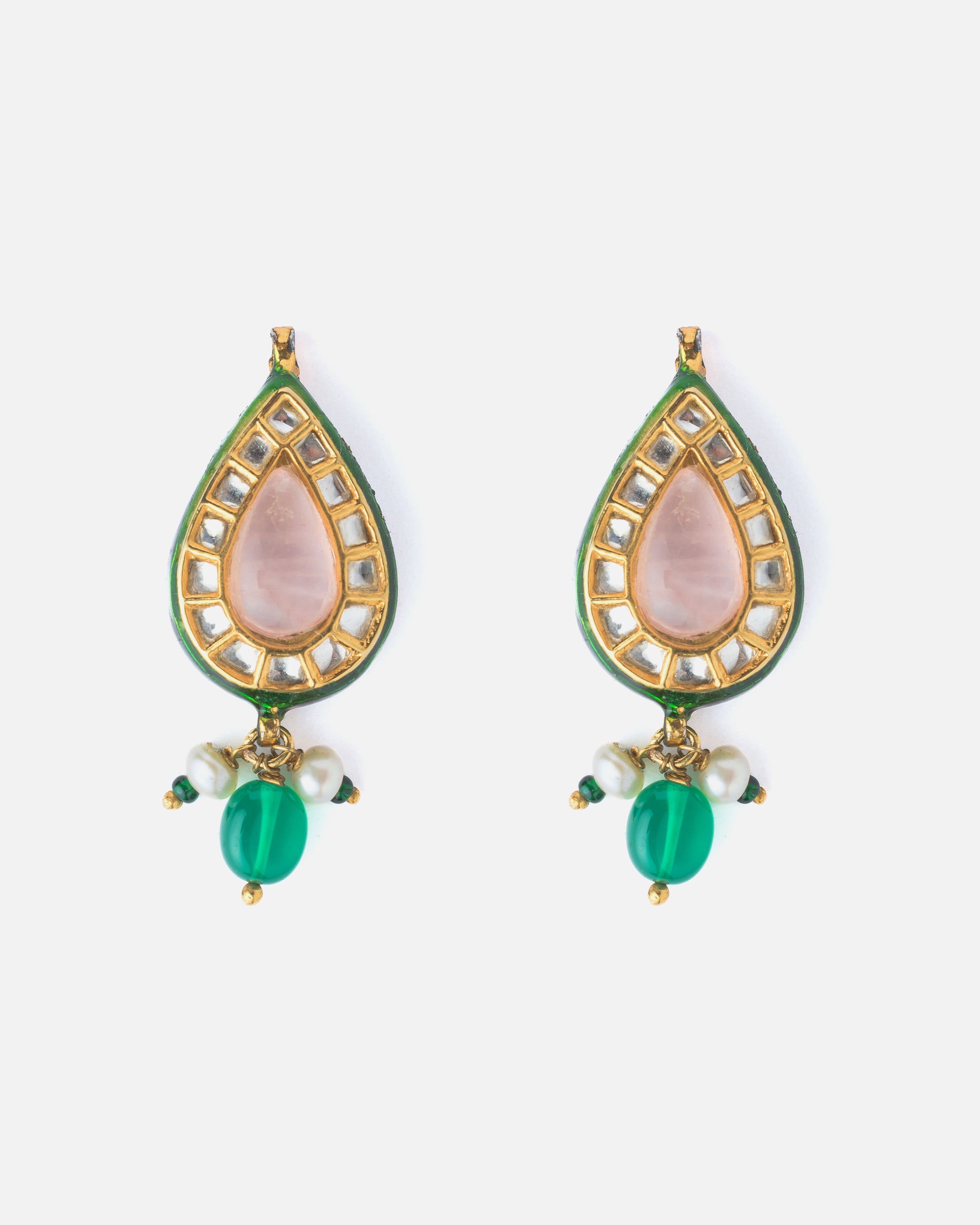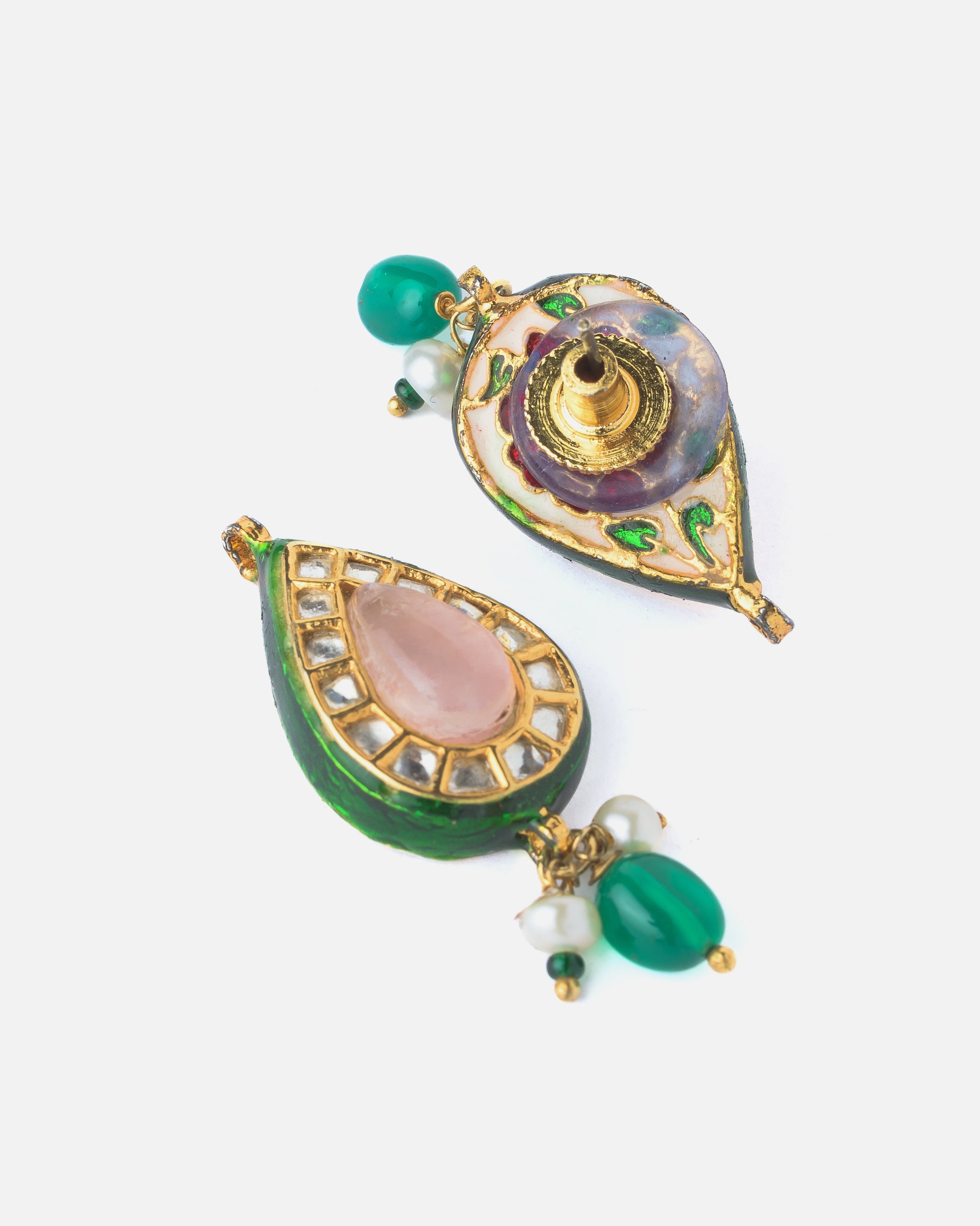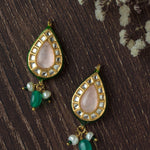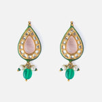 Elegant handcrafted teardrop earrings featuring pink stone inlays, surrounded by delicate kundan work, and accented with green beads and pearls. A perfect fusion of traditional charm and modern appeal.
