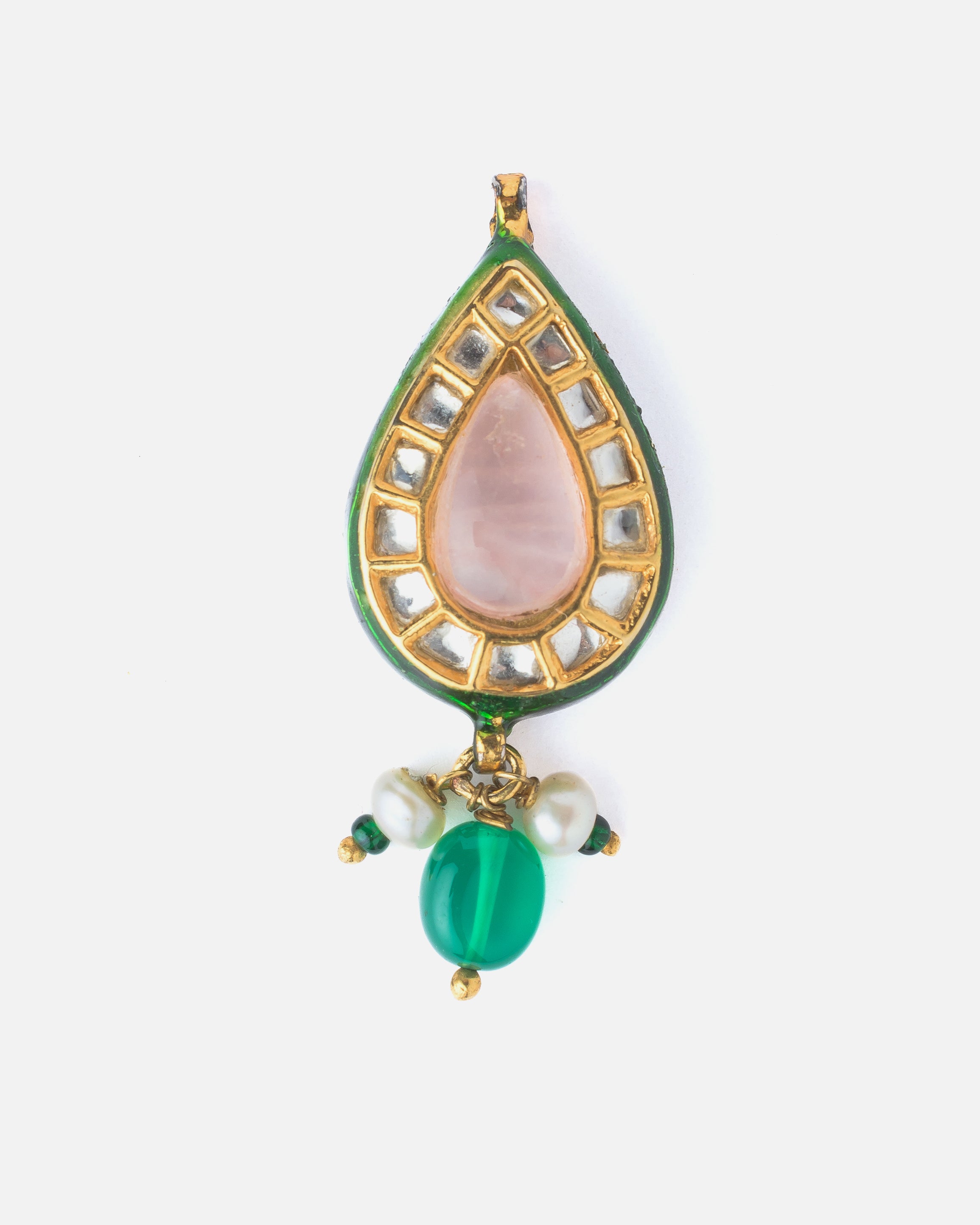 - Elegant Teardrop Design: Features a classic teardrop shape embellished with pink stone at the center and detailed kundan work around the border.