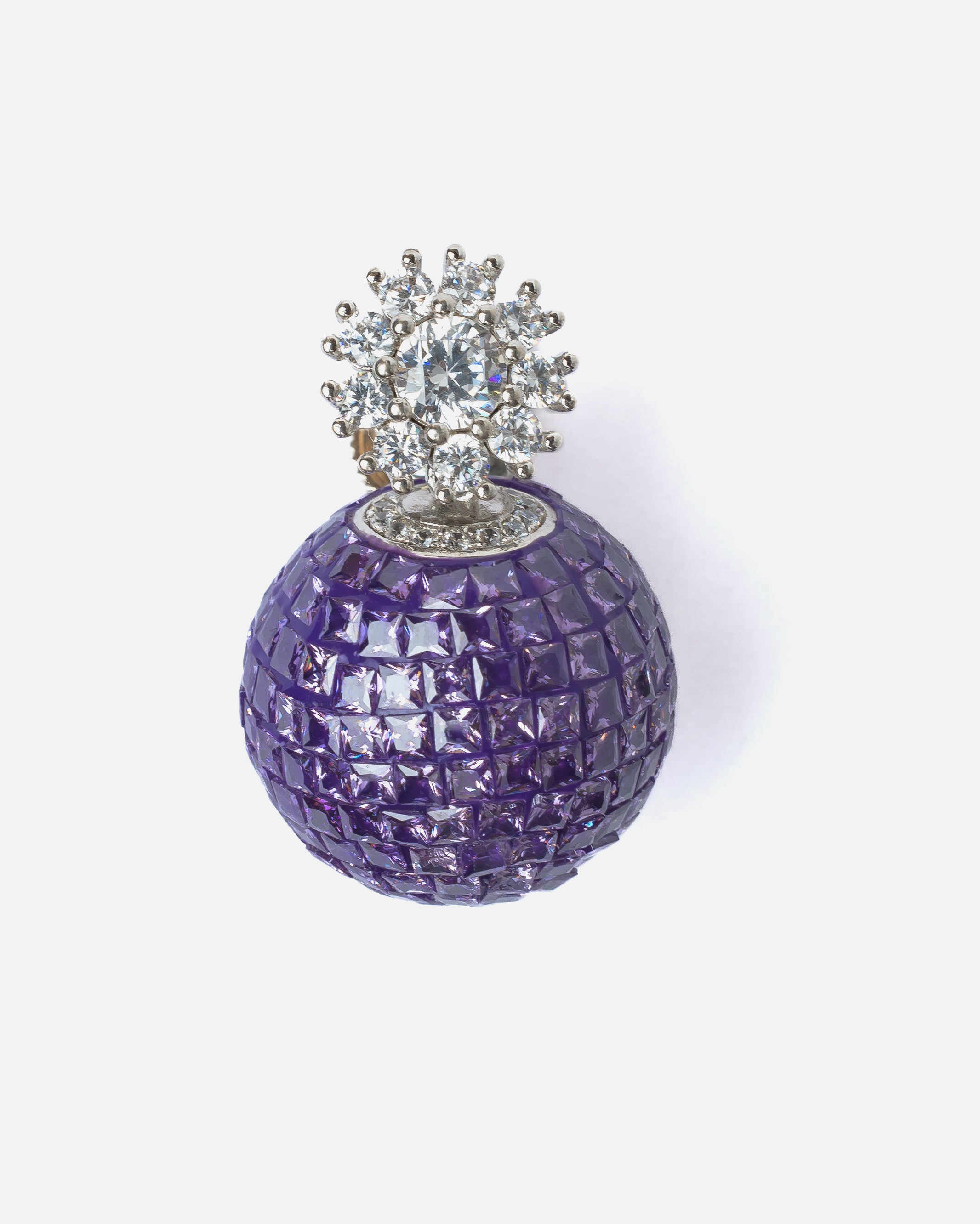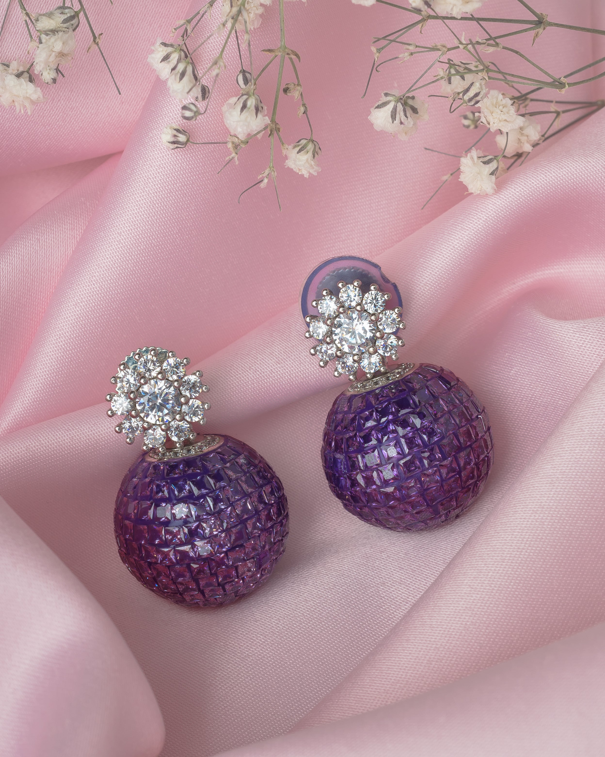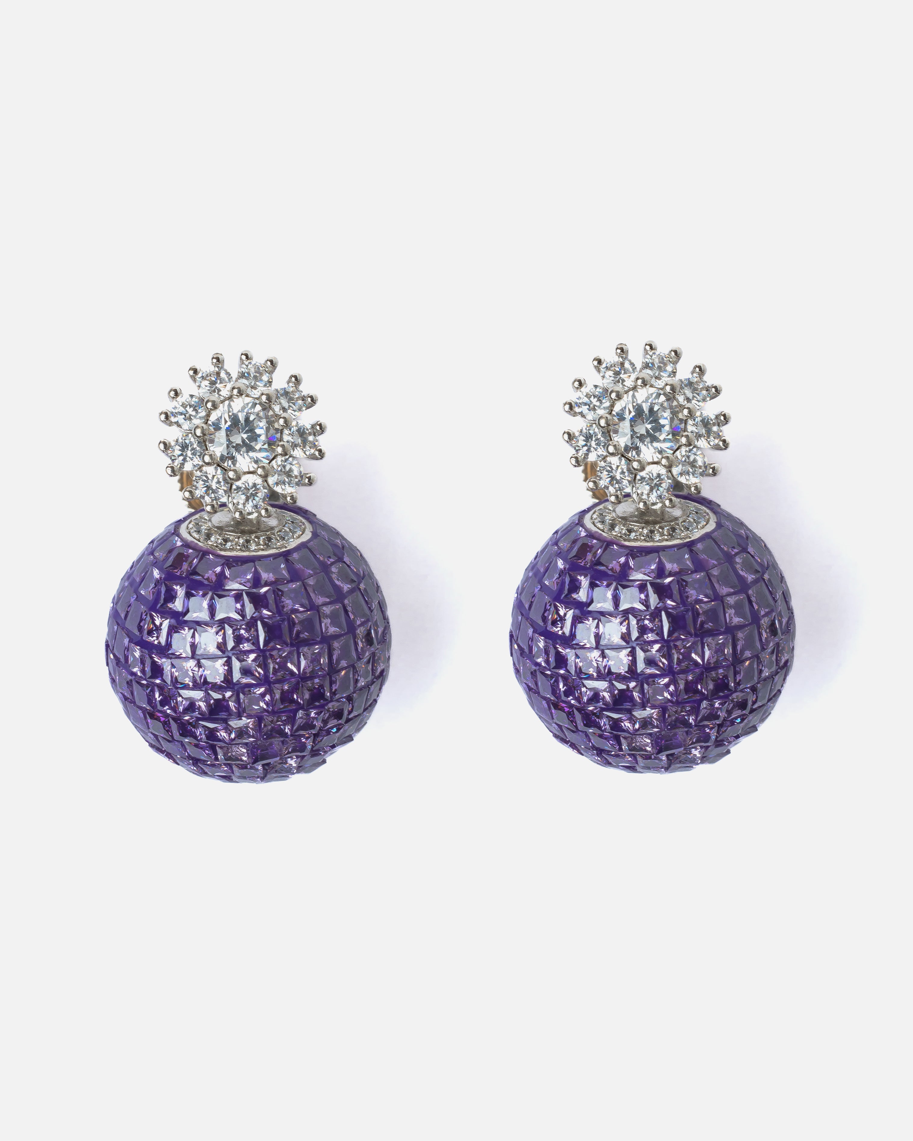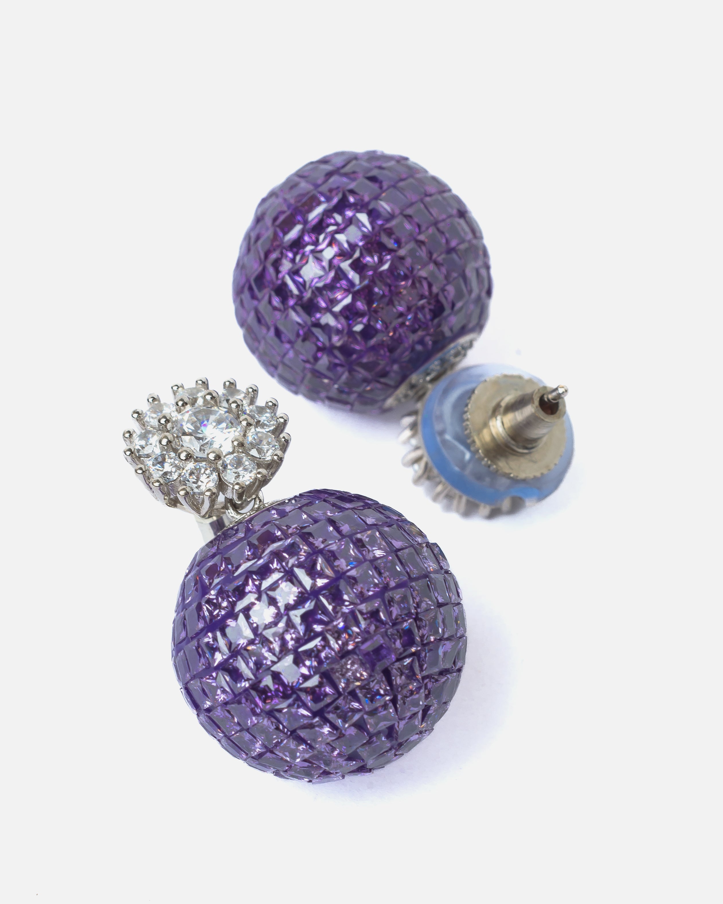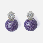 Glamorous purple glitter dome earrings paired with a sparkling cluster of white stones. A bold, modern accessory perfect for parties, cocktail events, and adding a touch of sparkle to your outfit.