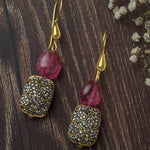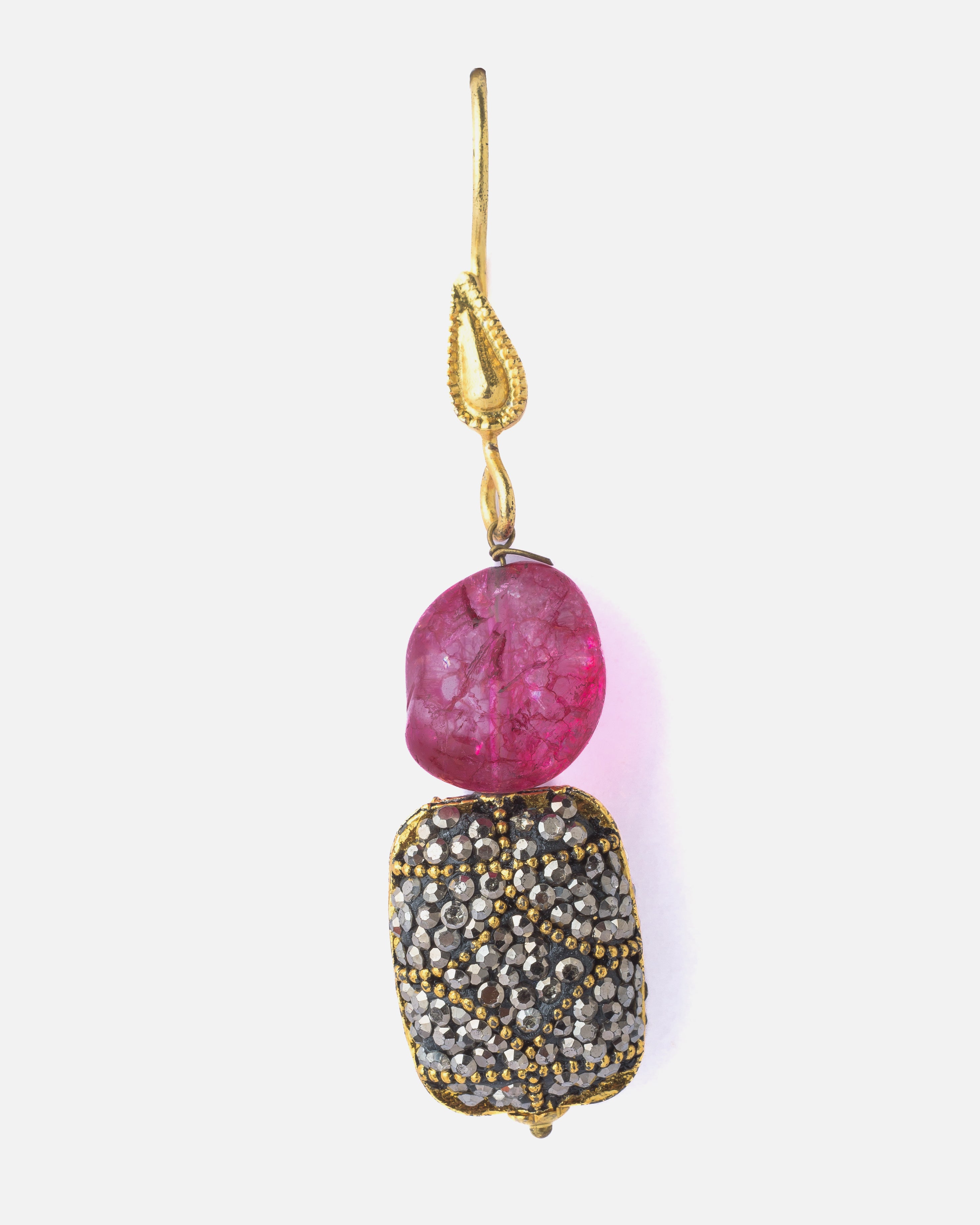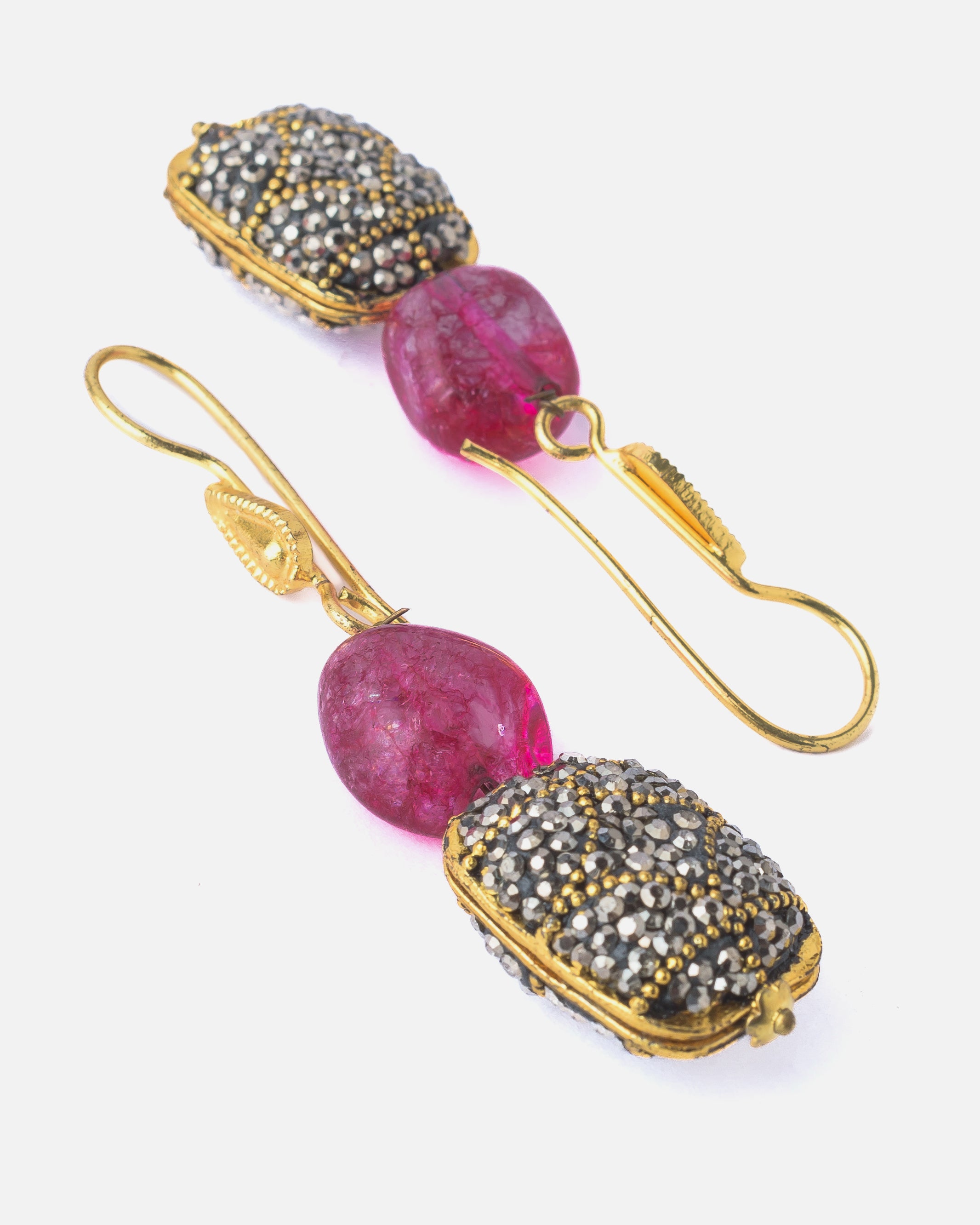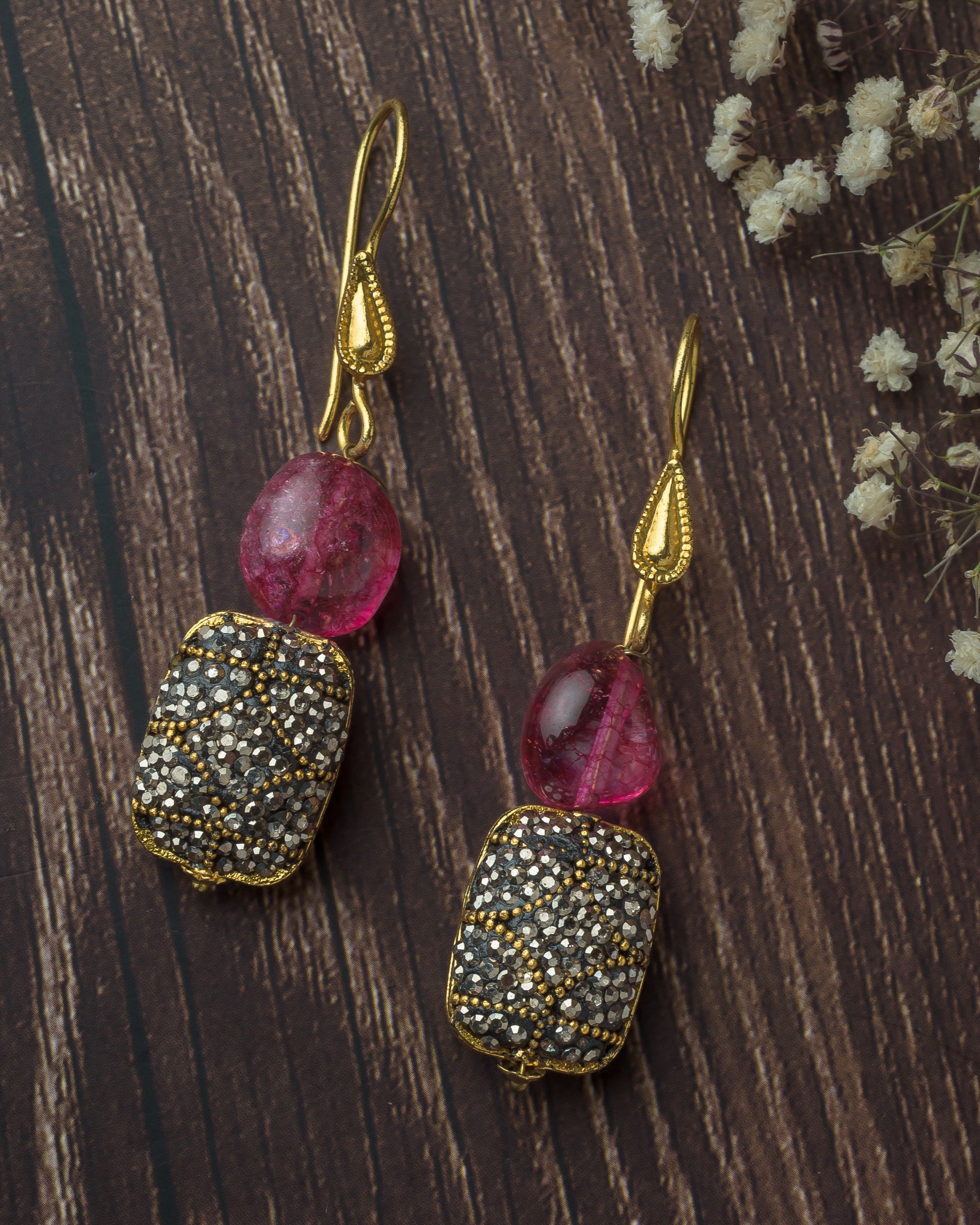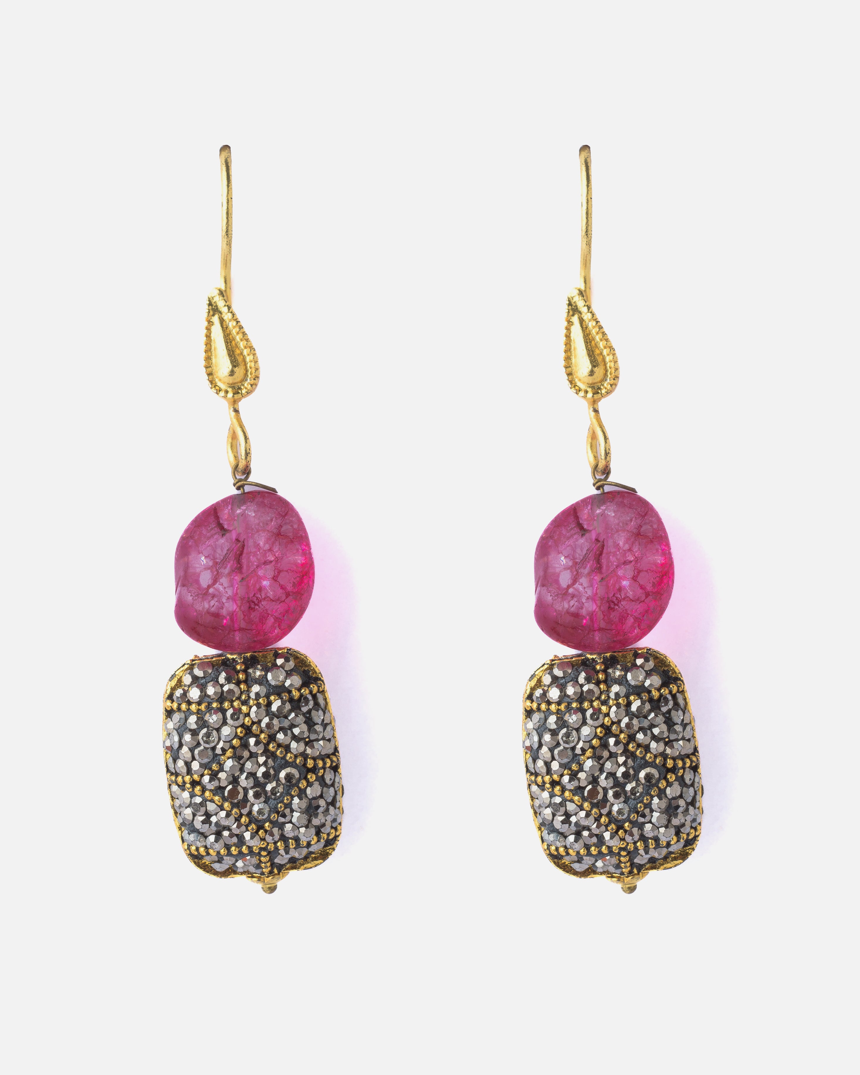 Add sparkle to your look with these elegant drop earrings, featuring a textured pink stone and intricately embellished silver-toned charm, accented with antique gold details for a classic touch.