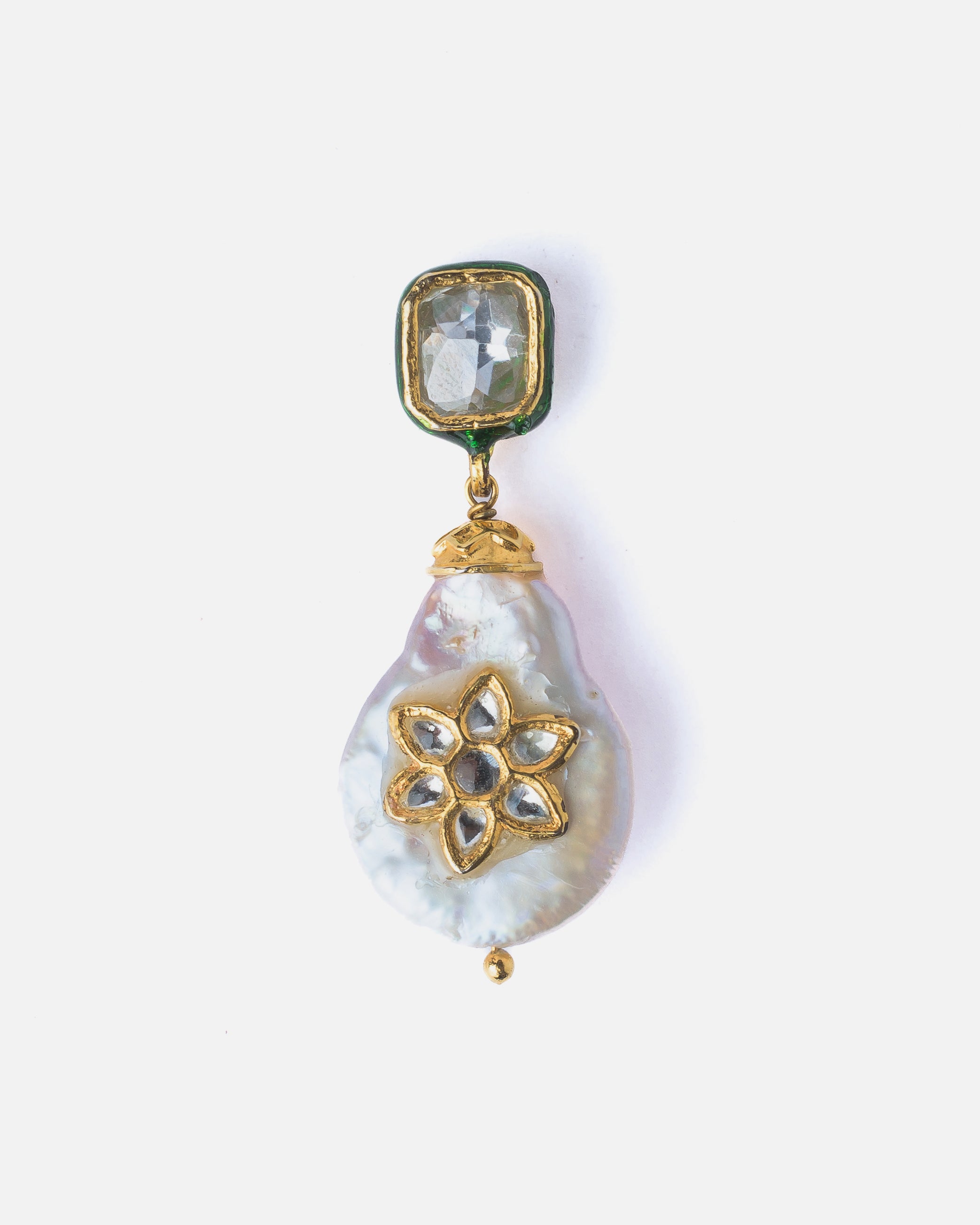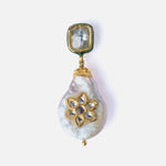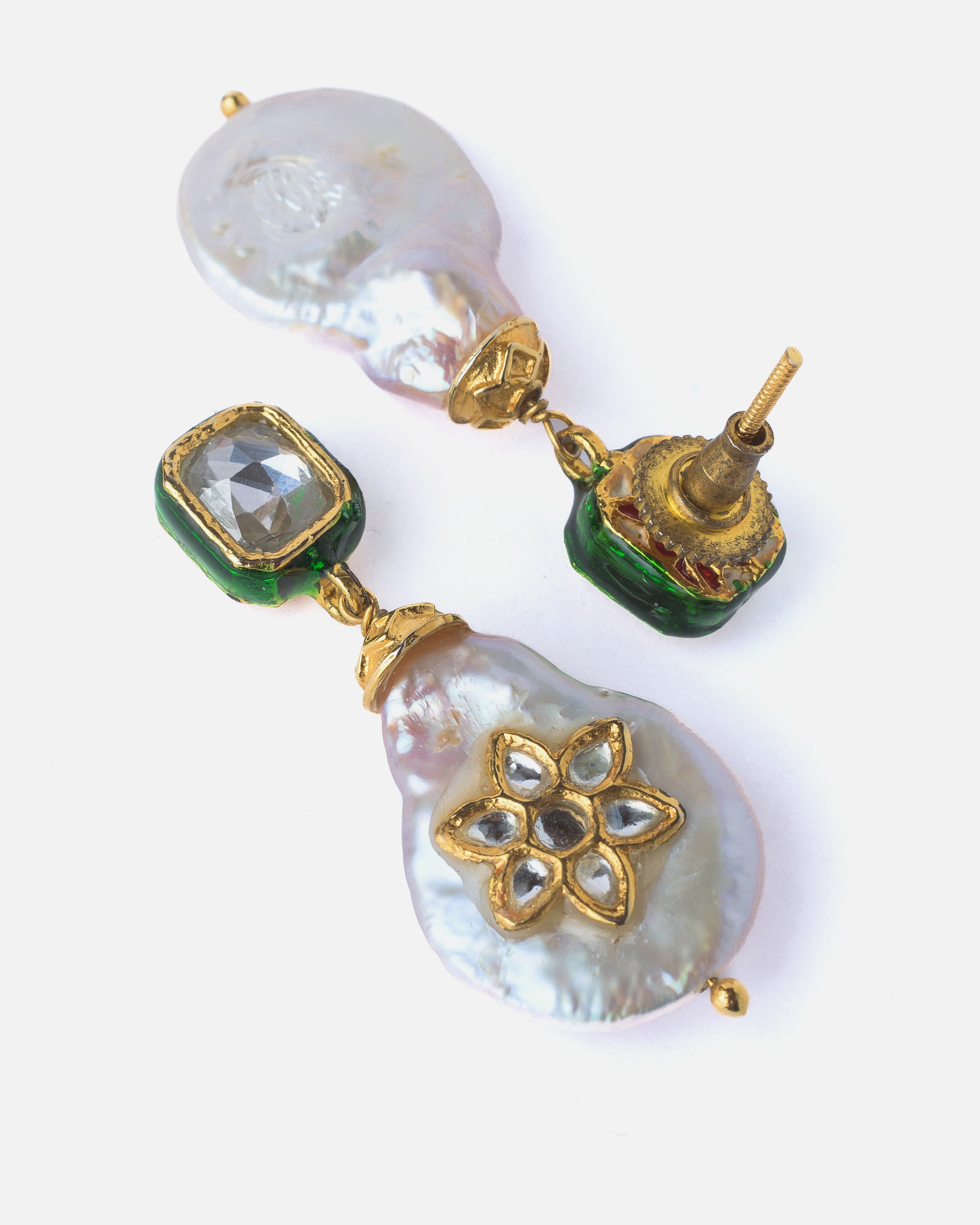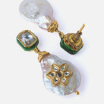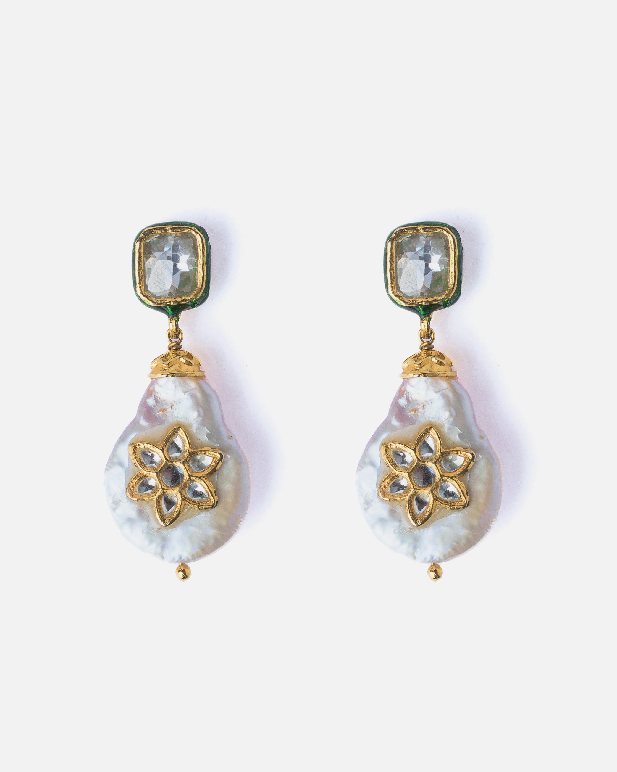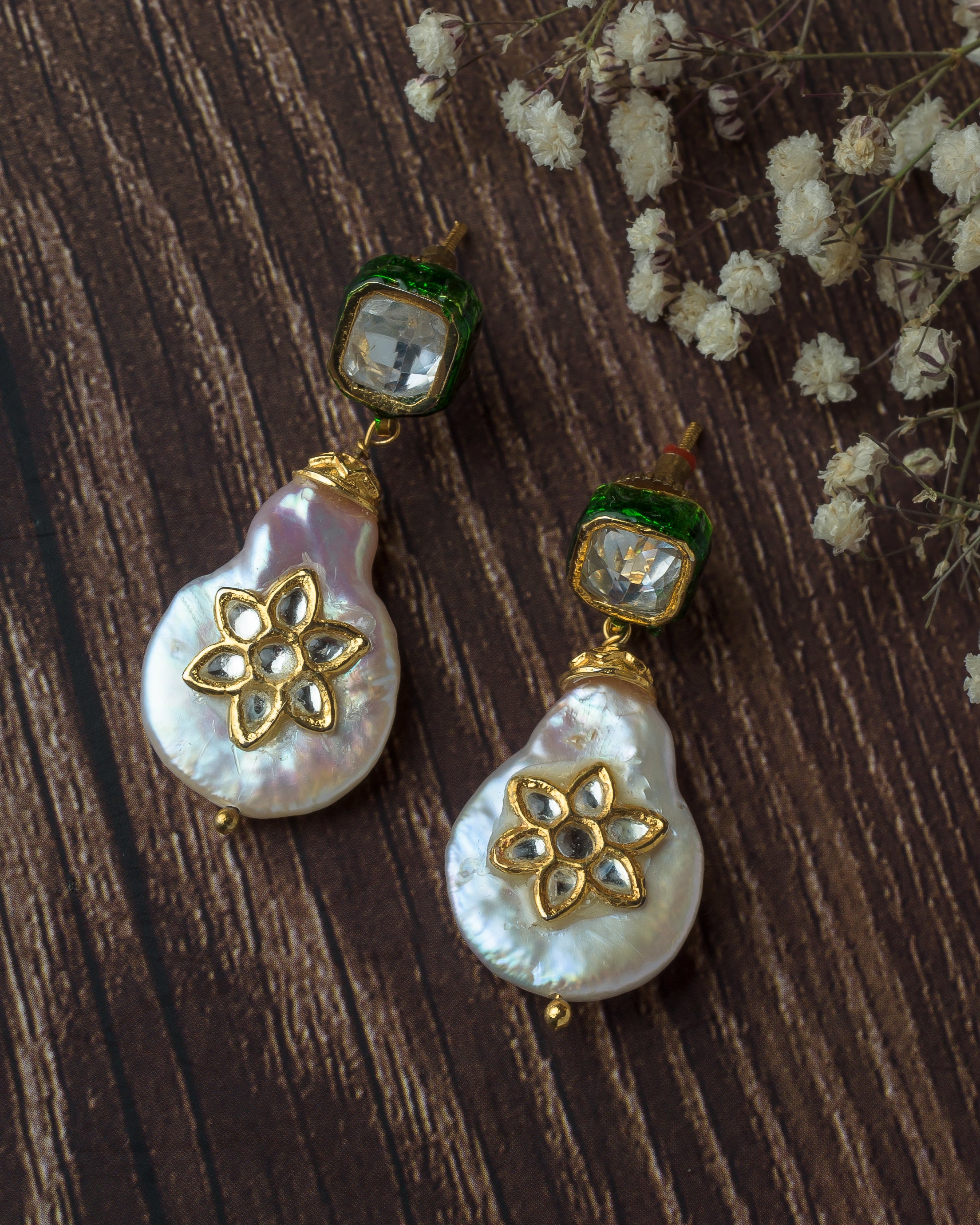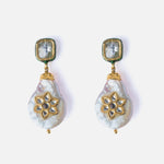 These elegant drop earrings feature a blend of raw pearl-like drops adorned with floral kundan-style motifs and rectangular gemstone studs, offering a perfect fusion of vintage charm and modern elegance.