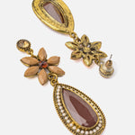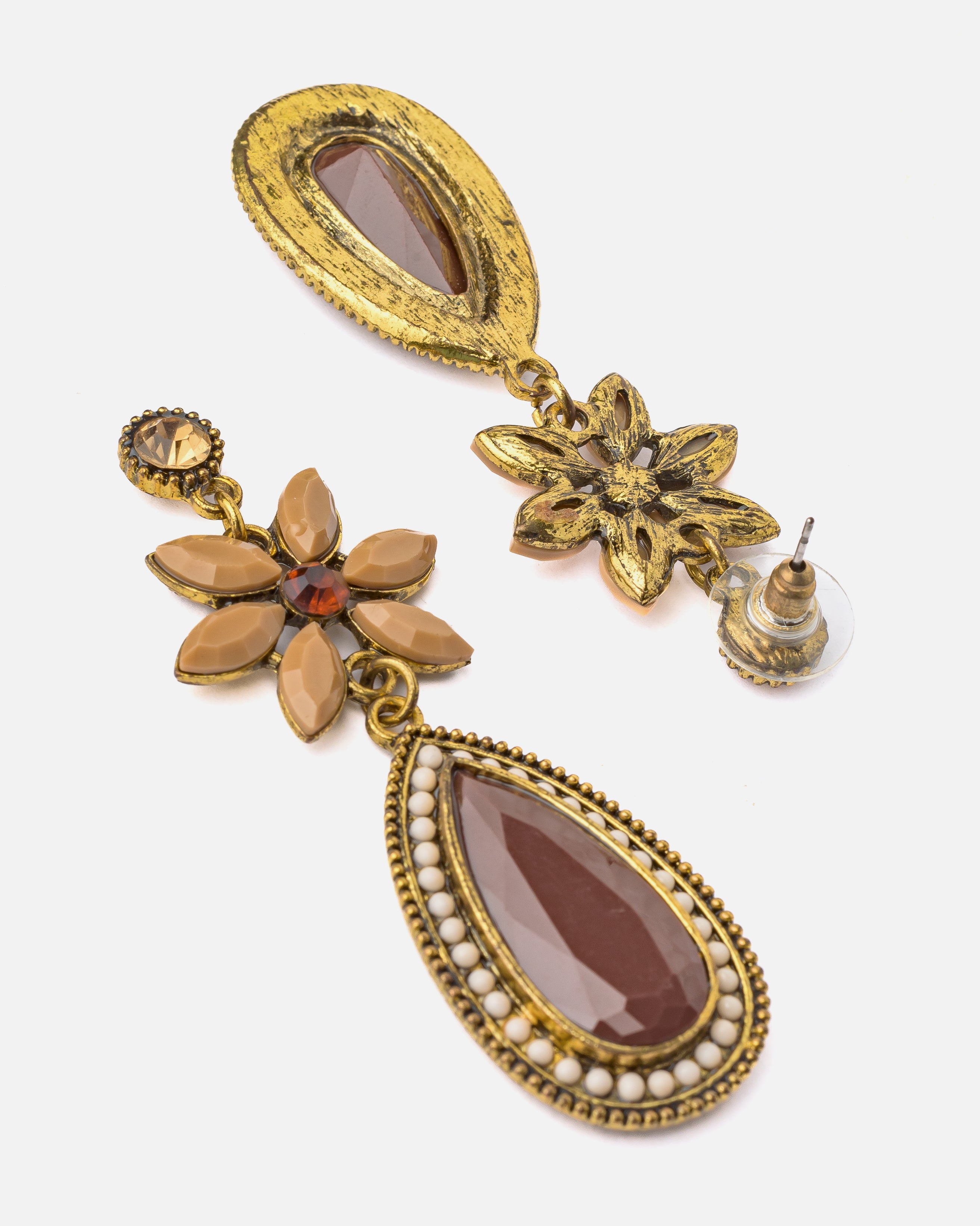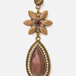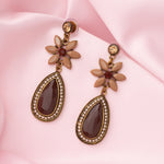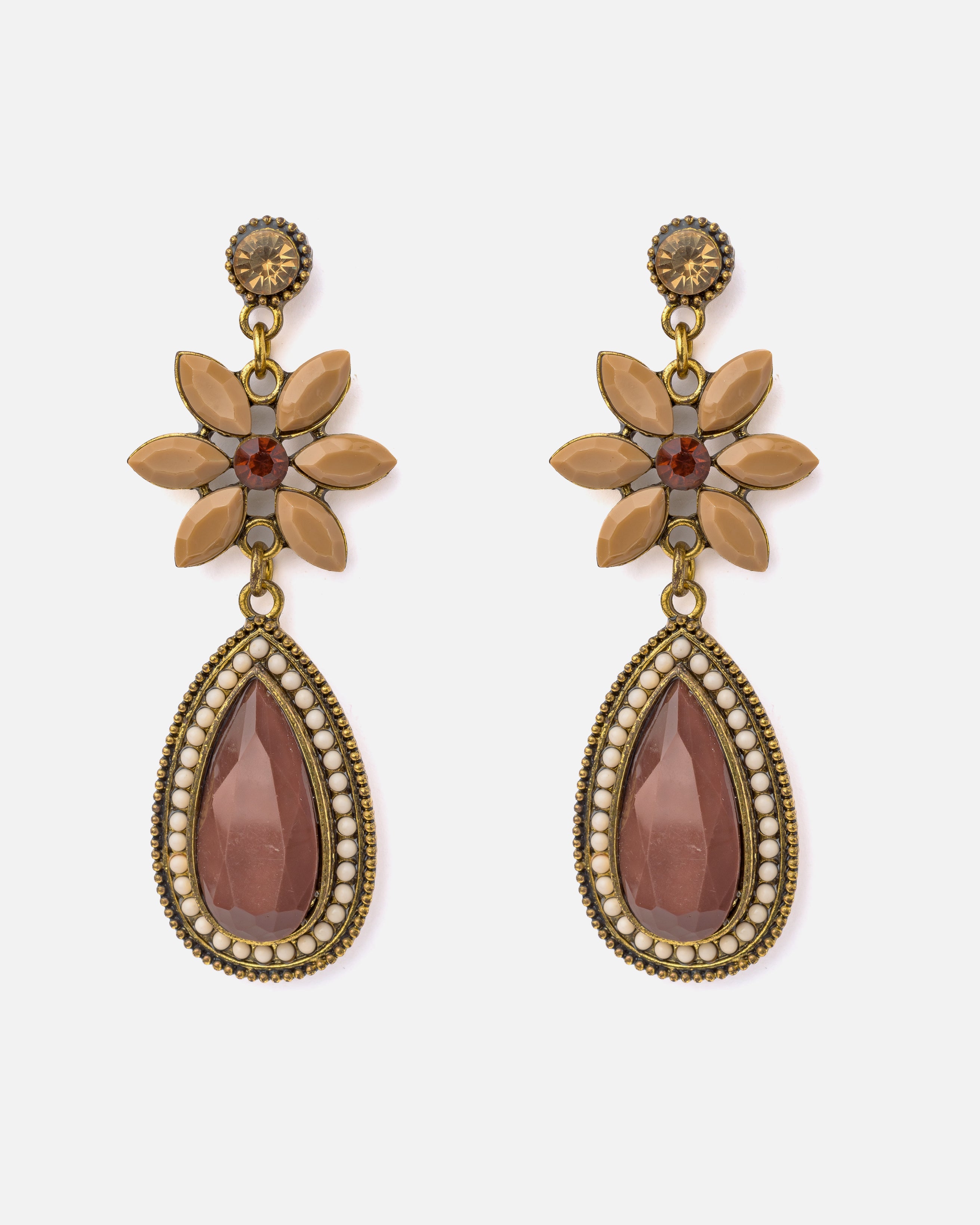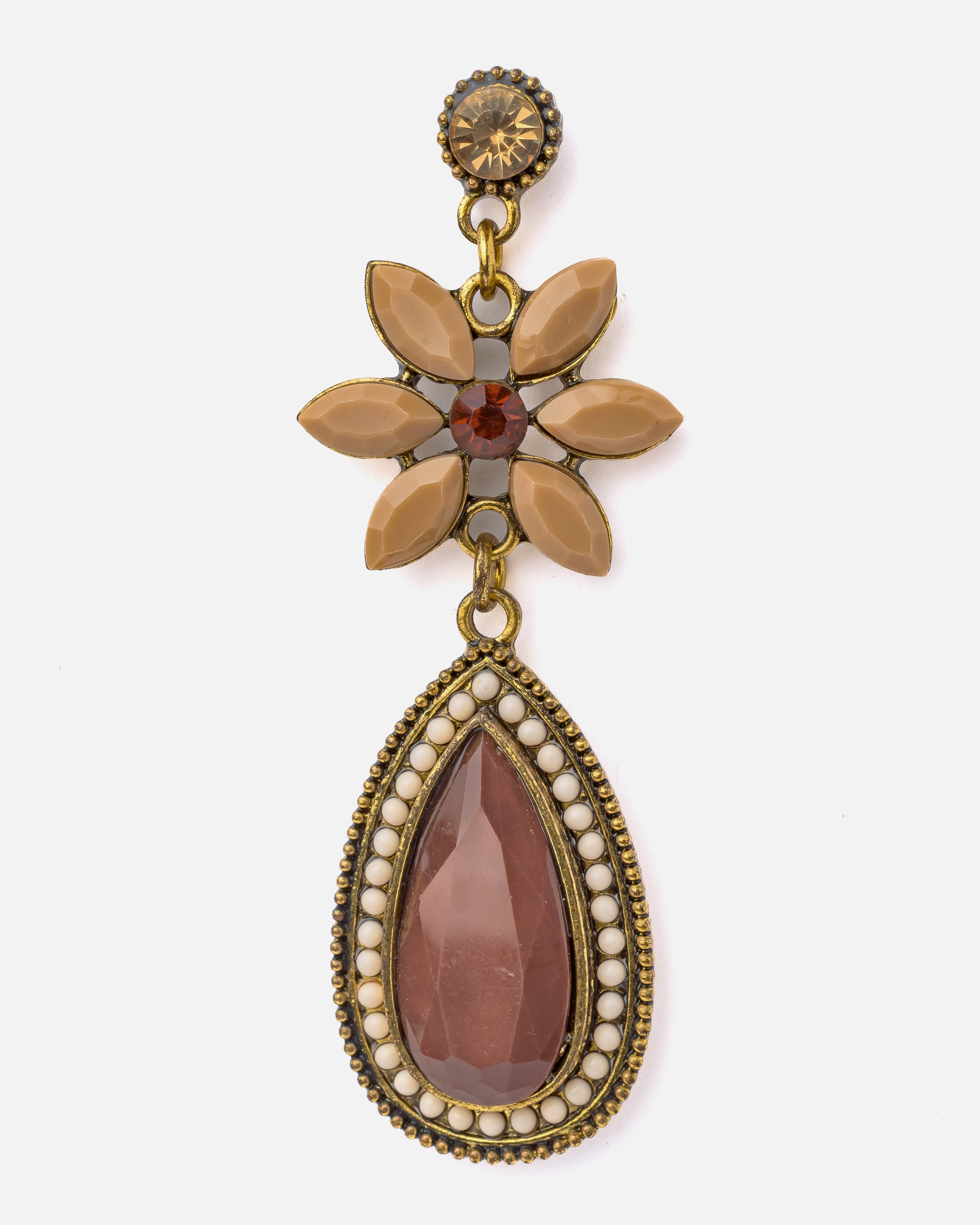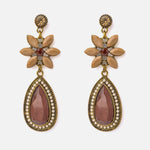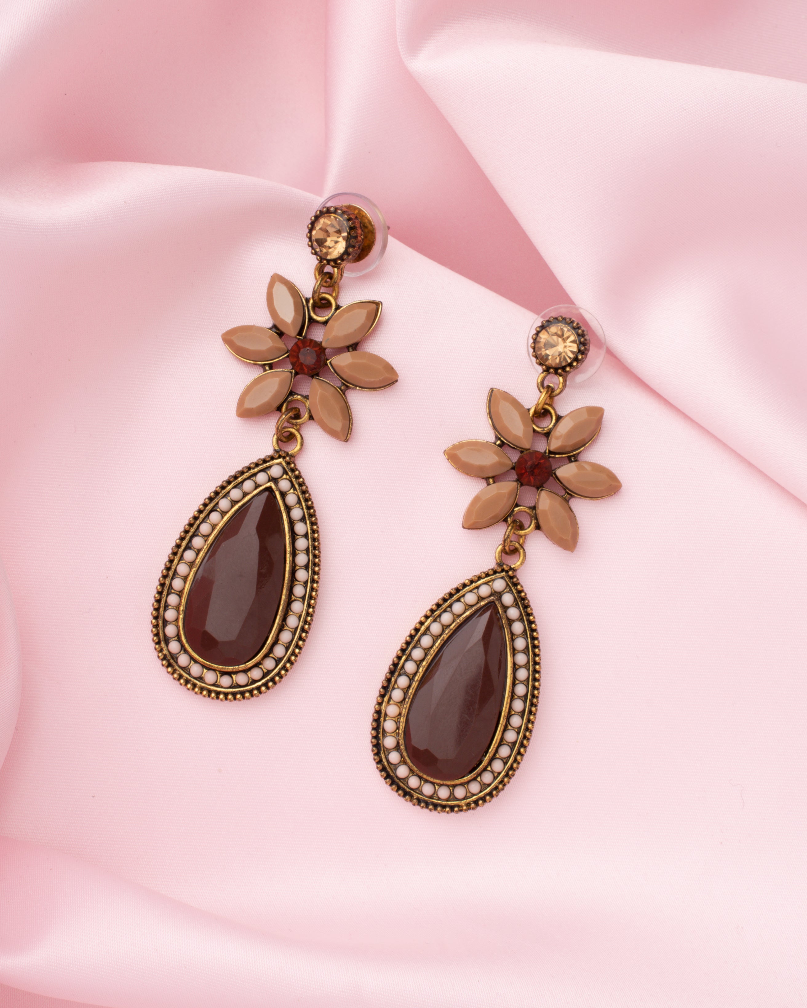 Elegant drop earrings featuring a floral stud and teardrop gemstone accent. Adorned with shimmering details, these earrings offer a vintage charm with a modern twist, perfect for special occasions or casual elegance.