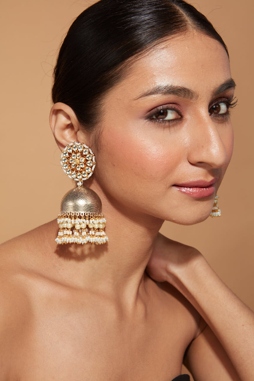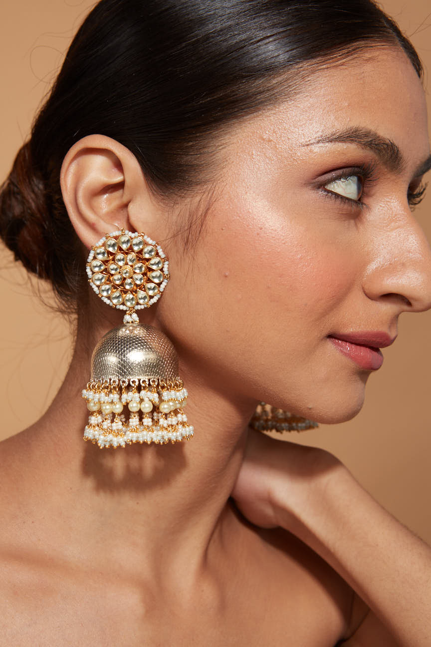 Elegant gold-toned jhumka earrings featuring intricate detailing and pearl embellishments. Designed for festive occasions, these statement pieces add a touch of regal charm to any traditional outfit.