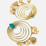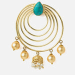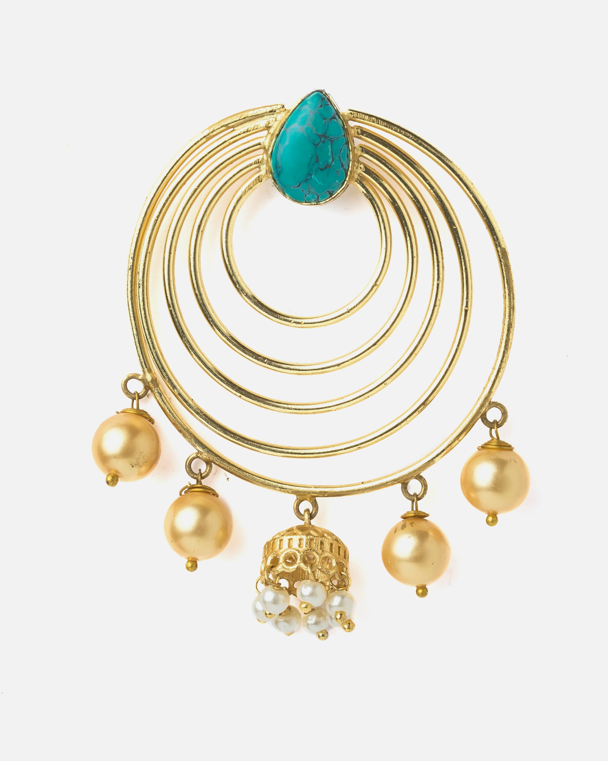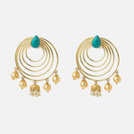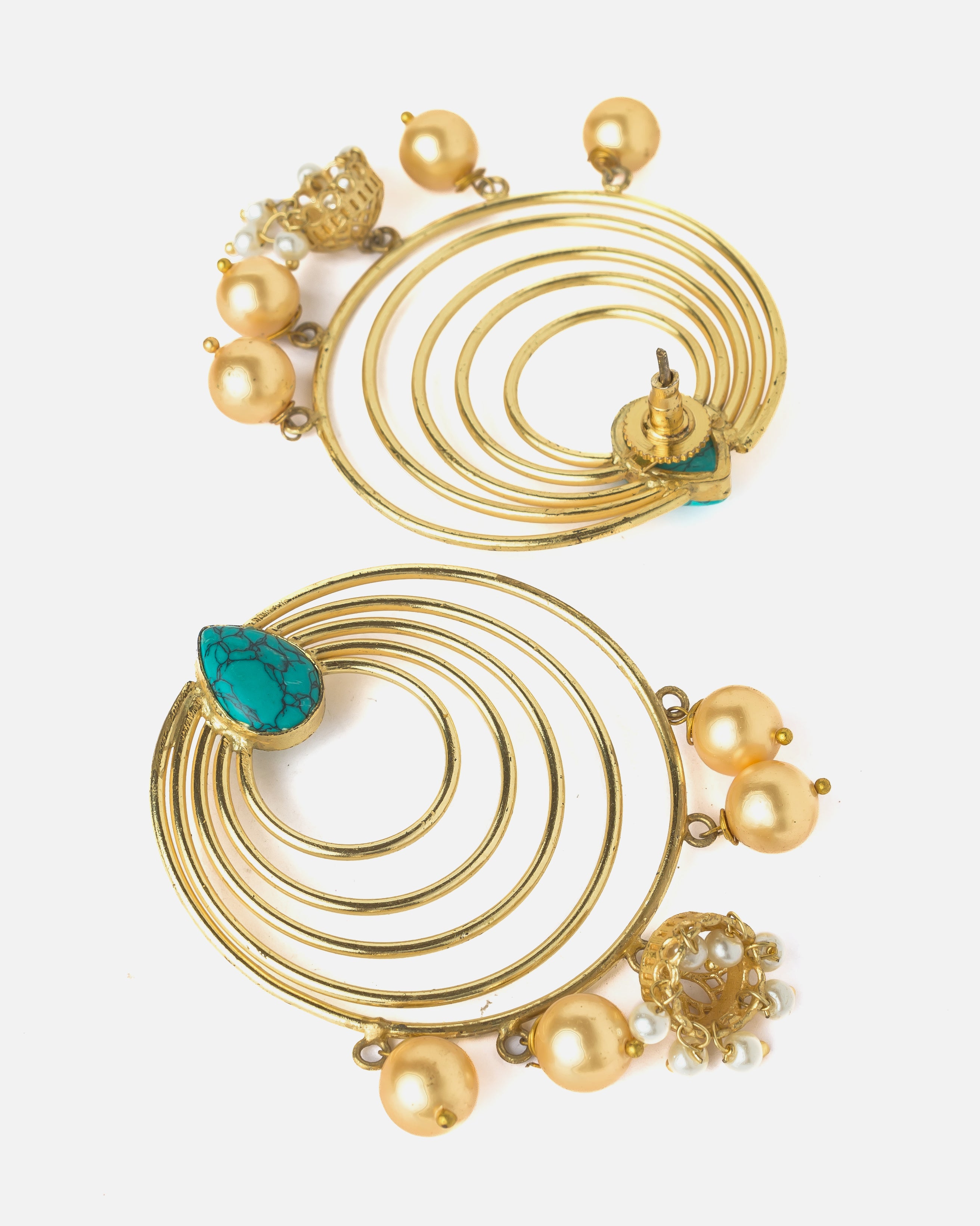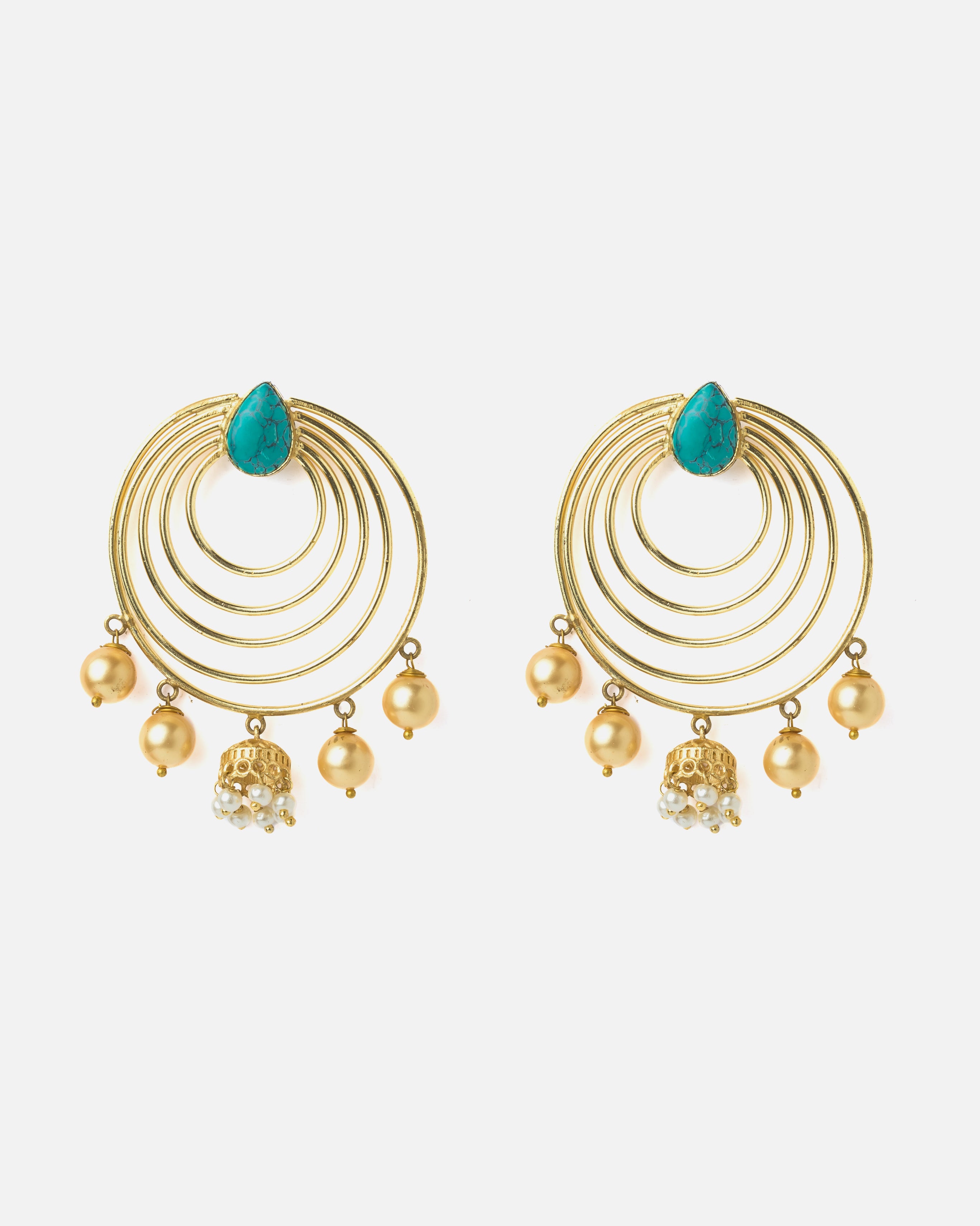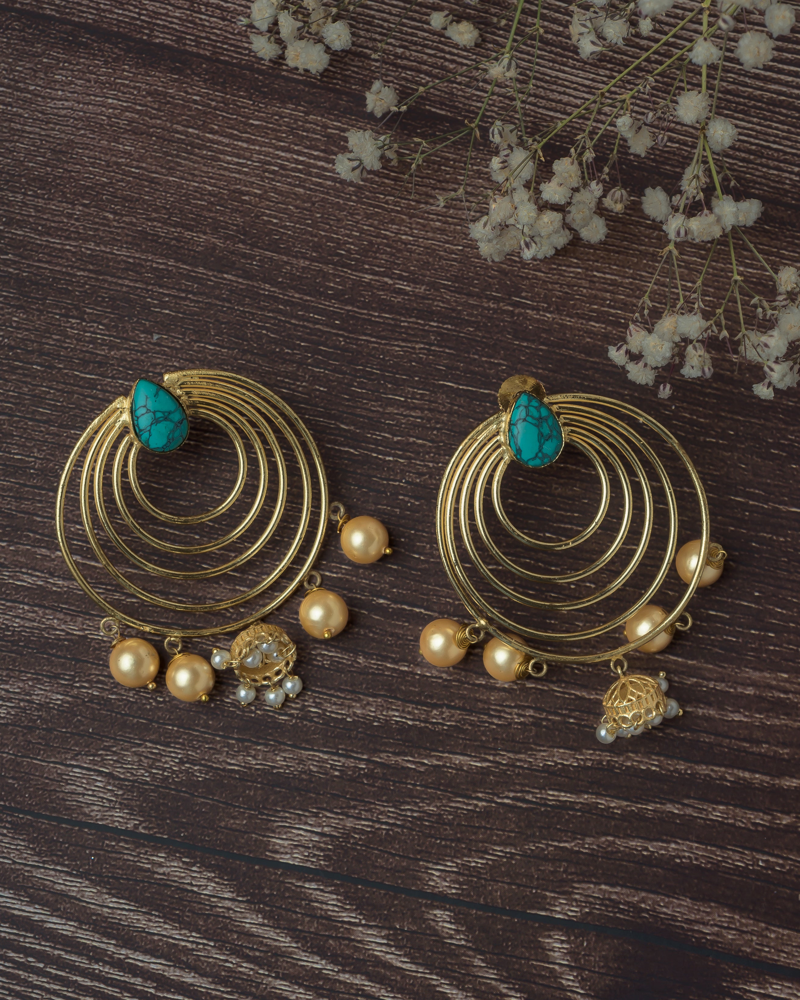 Grace your look with these traditional hoop-style earrings, featuring layered golden circles, pearl drops, and a striking turquoise accent—perfect for festive occasions and ethnic ensembles.