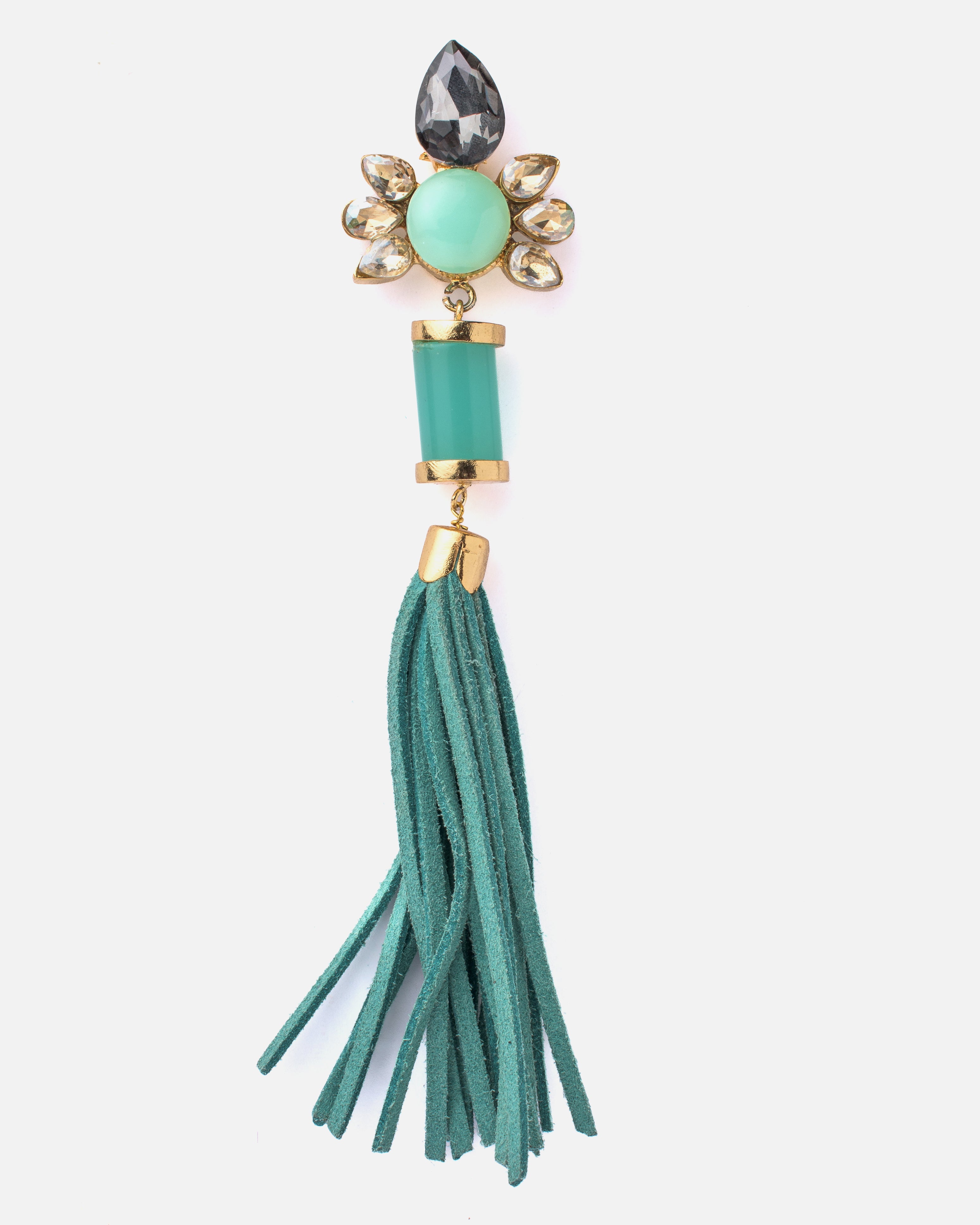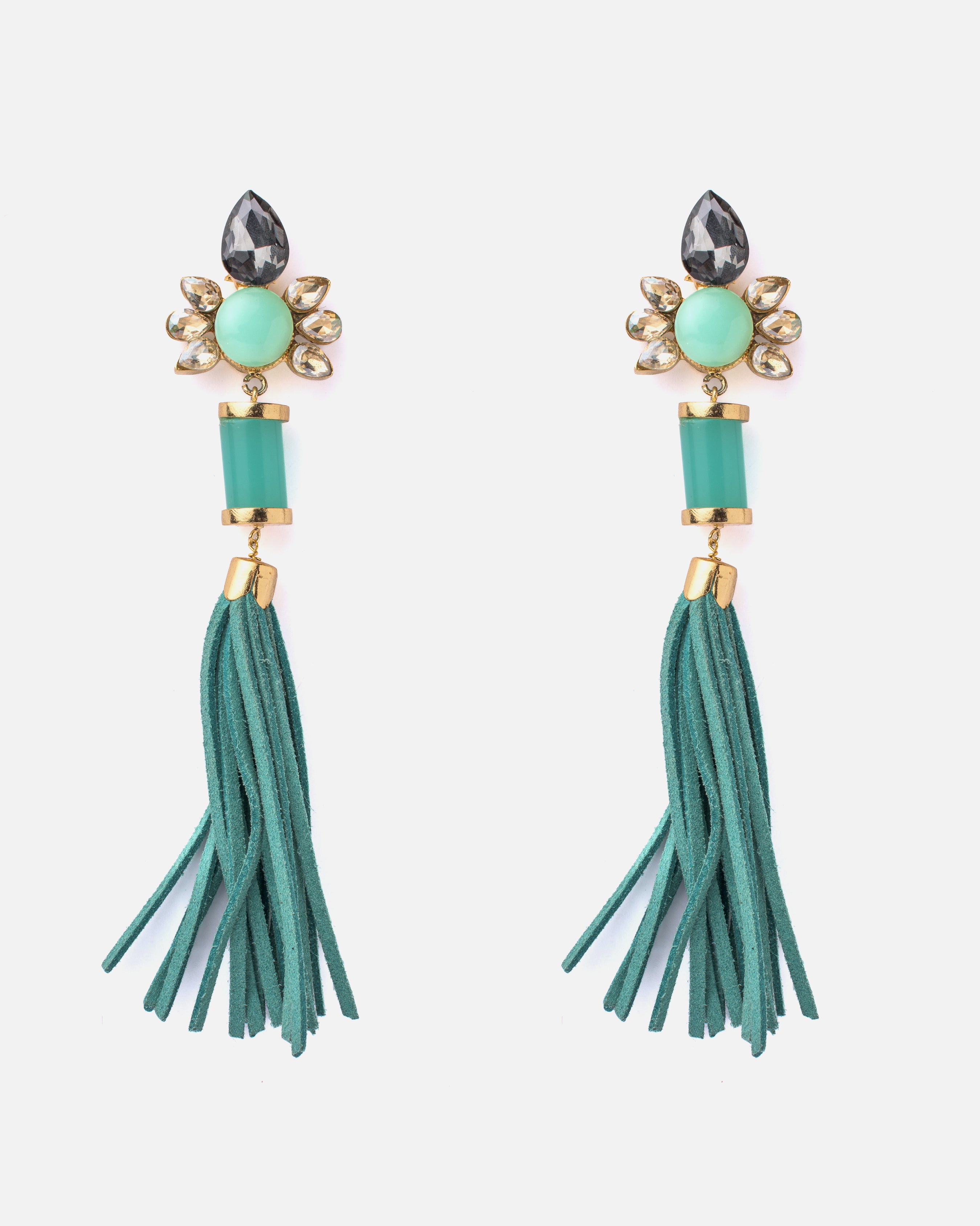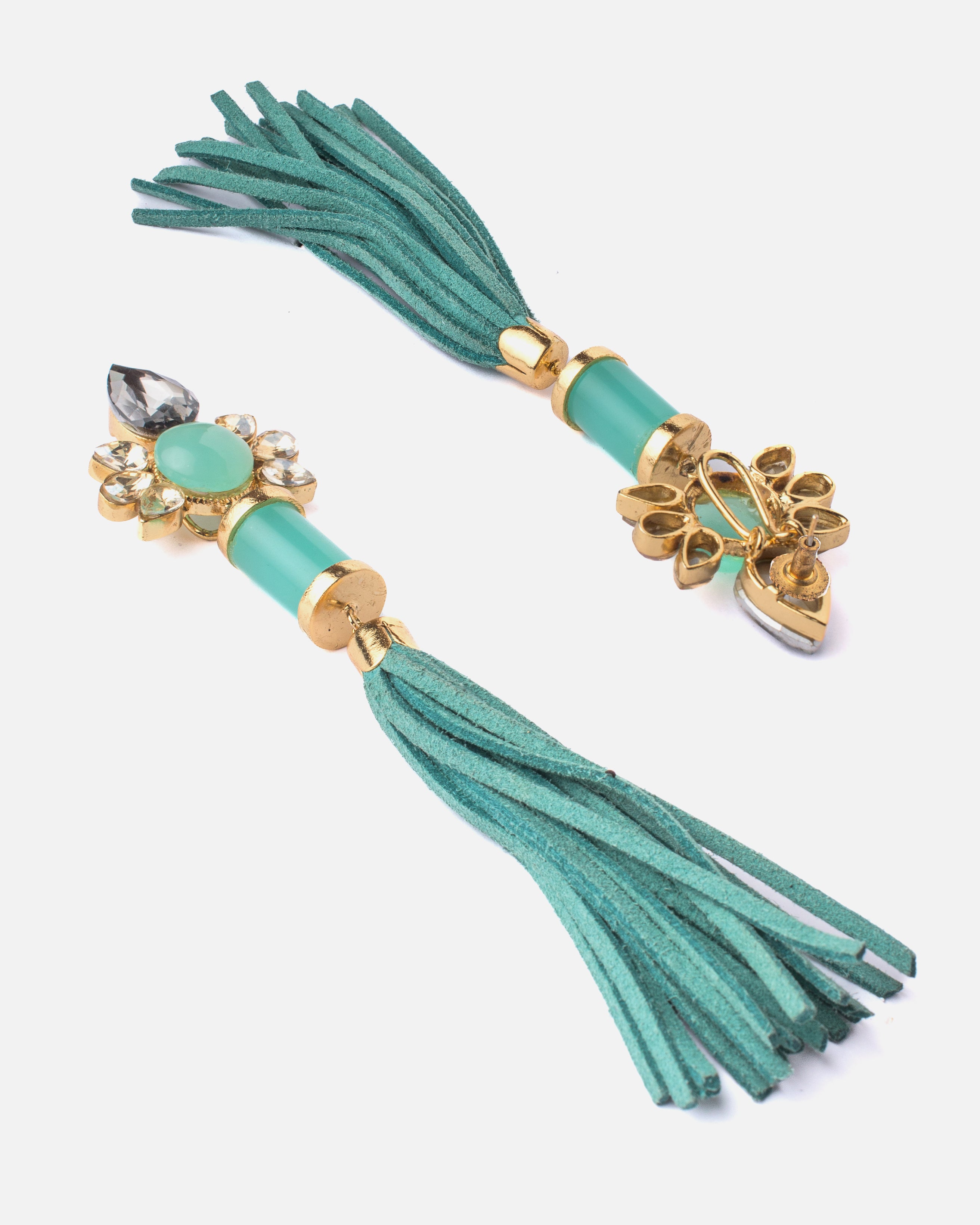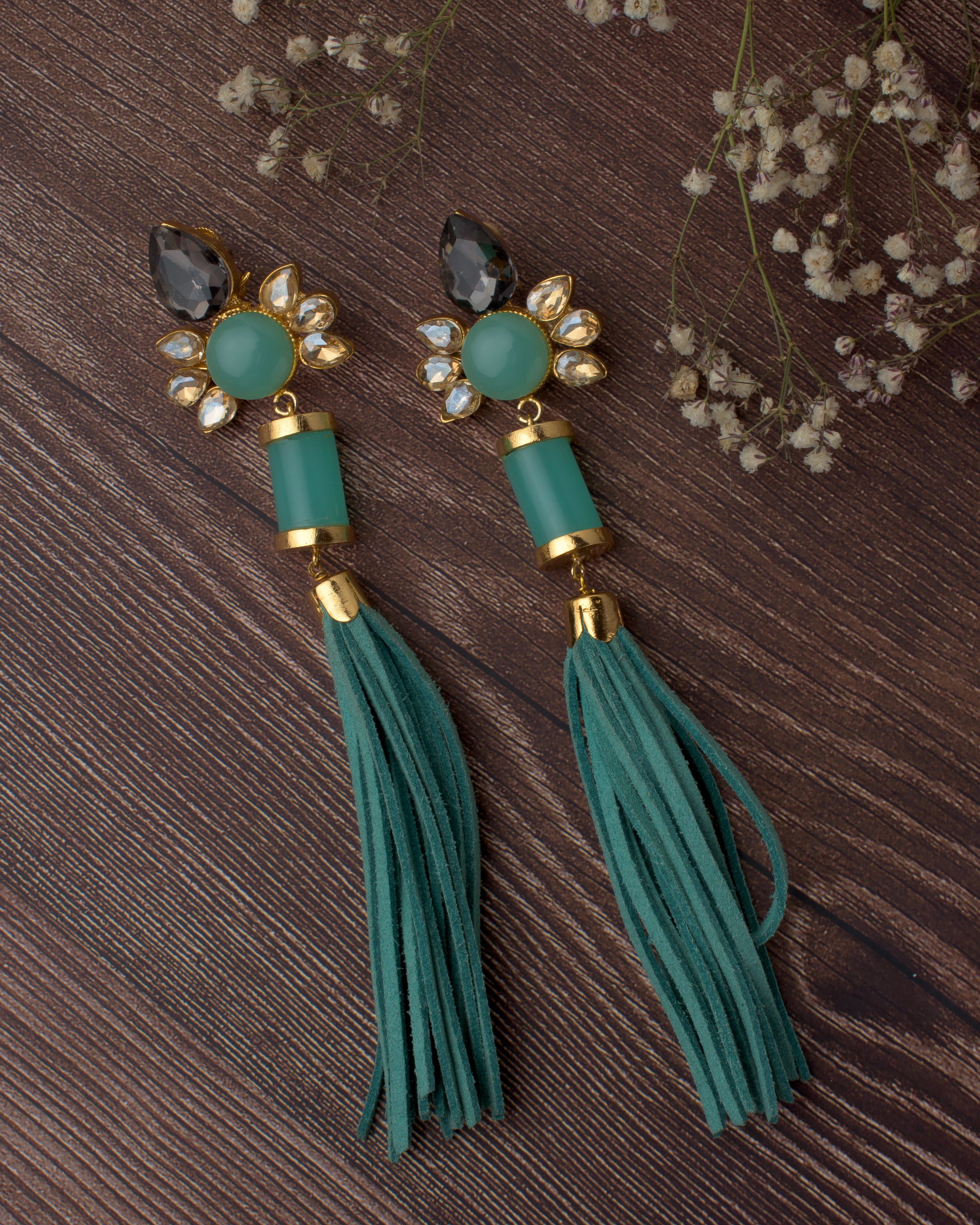 These elegant green tassel earrings blend fabric and stones for a chic, contemporary look. Perfect for casual and festive wear, they add a stylish flair to your outfit with lightweight comfort.