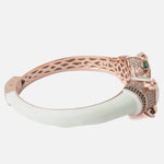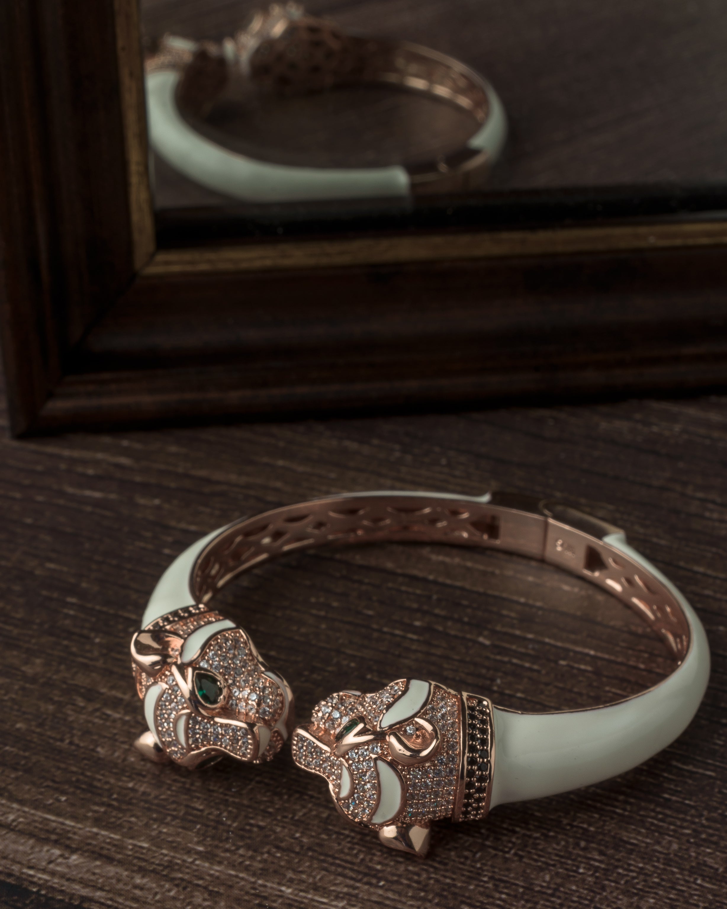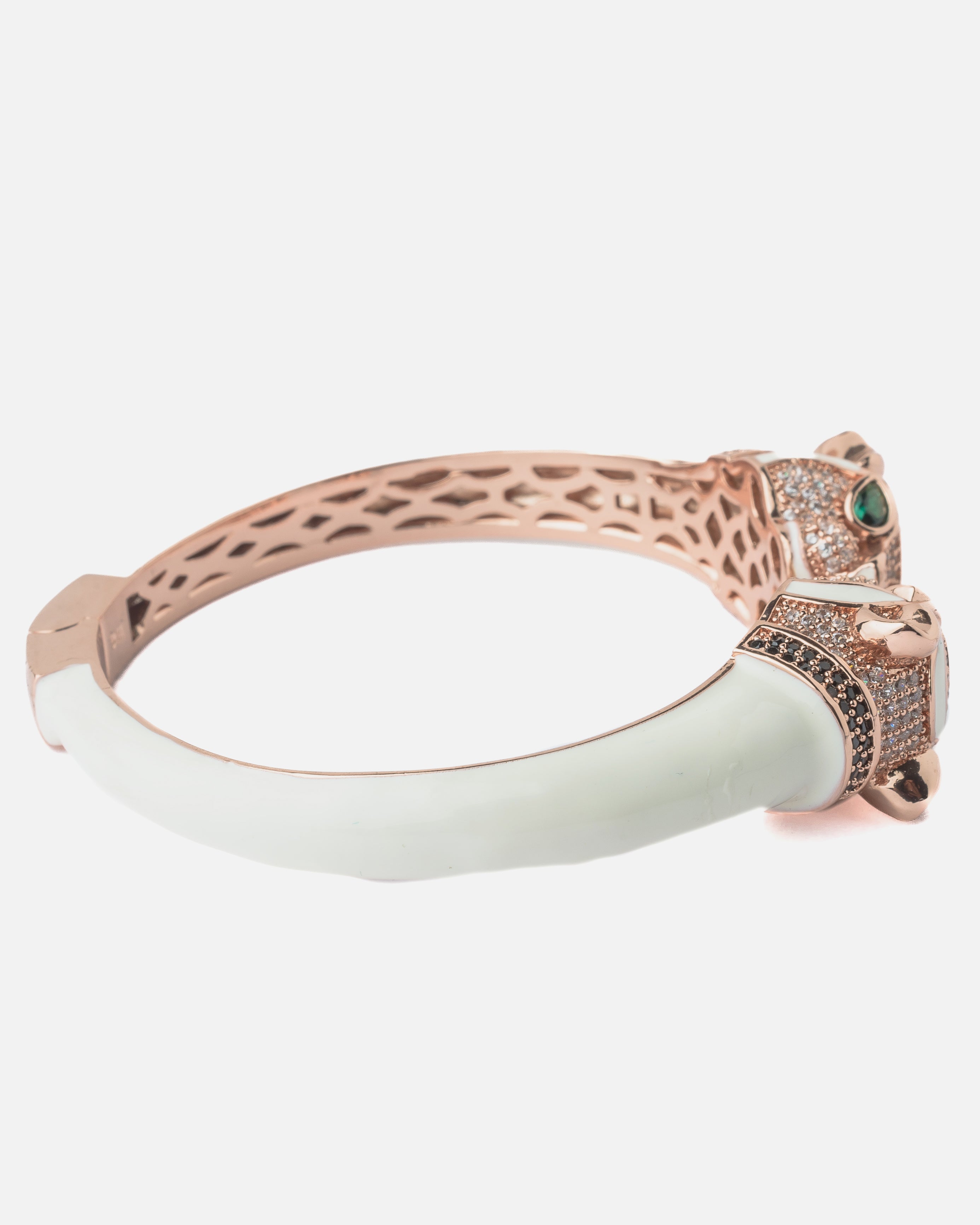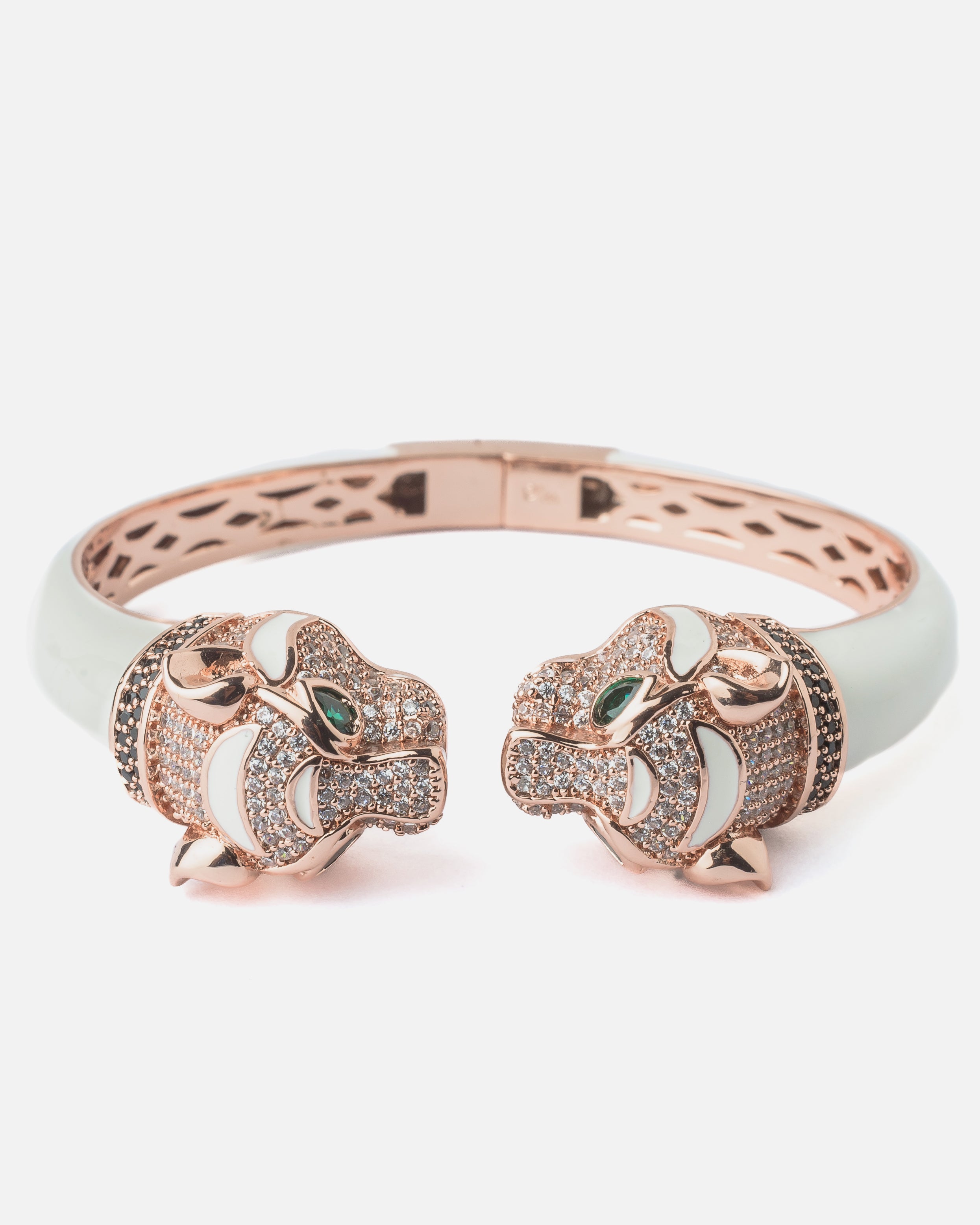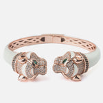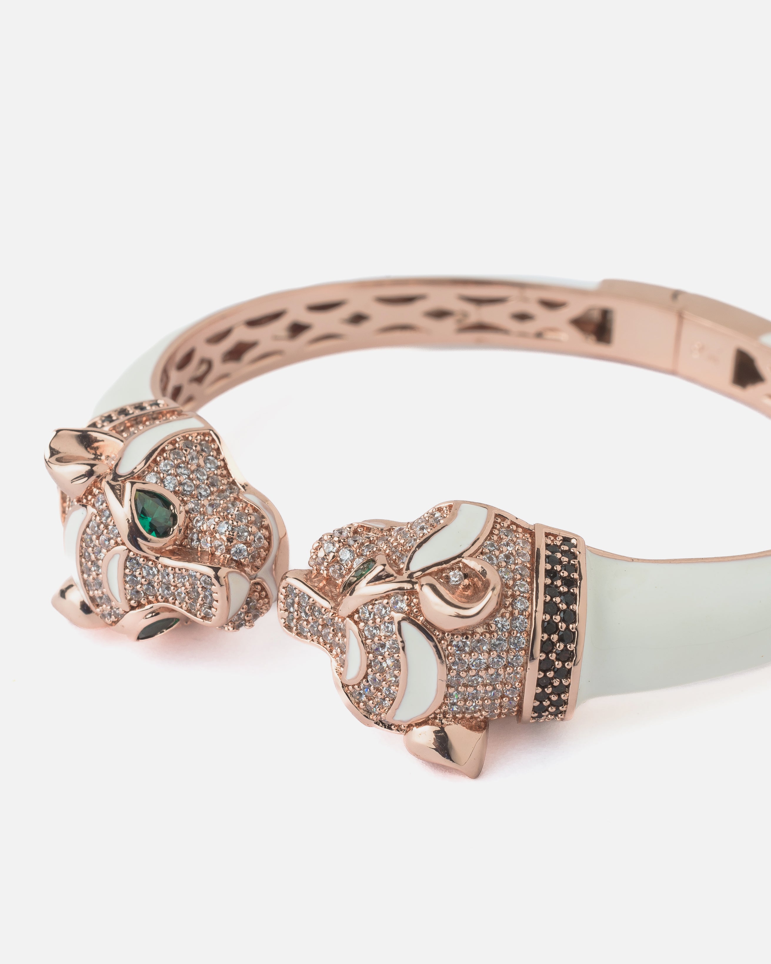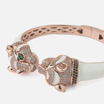 Elegant rose gold bangle featuring twin panther heads adorned with sparkling stones, green eyes, and white enamel accents. A bold, luxurious accessory perfect for special occasions or statement styling.