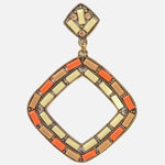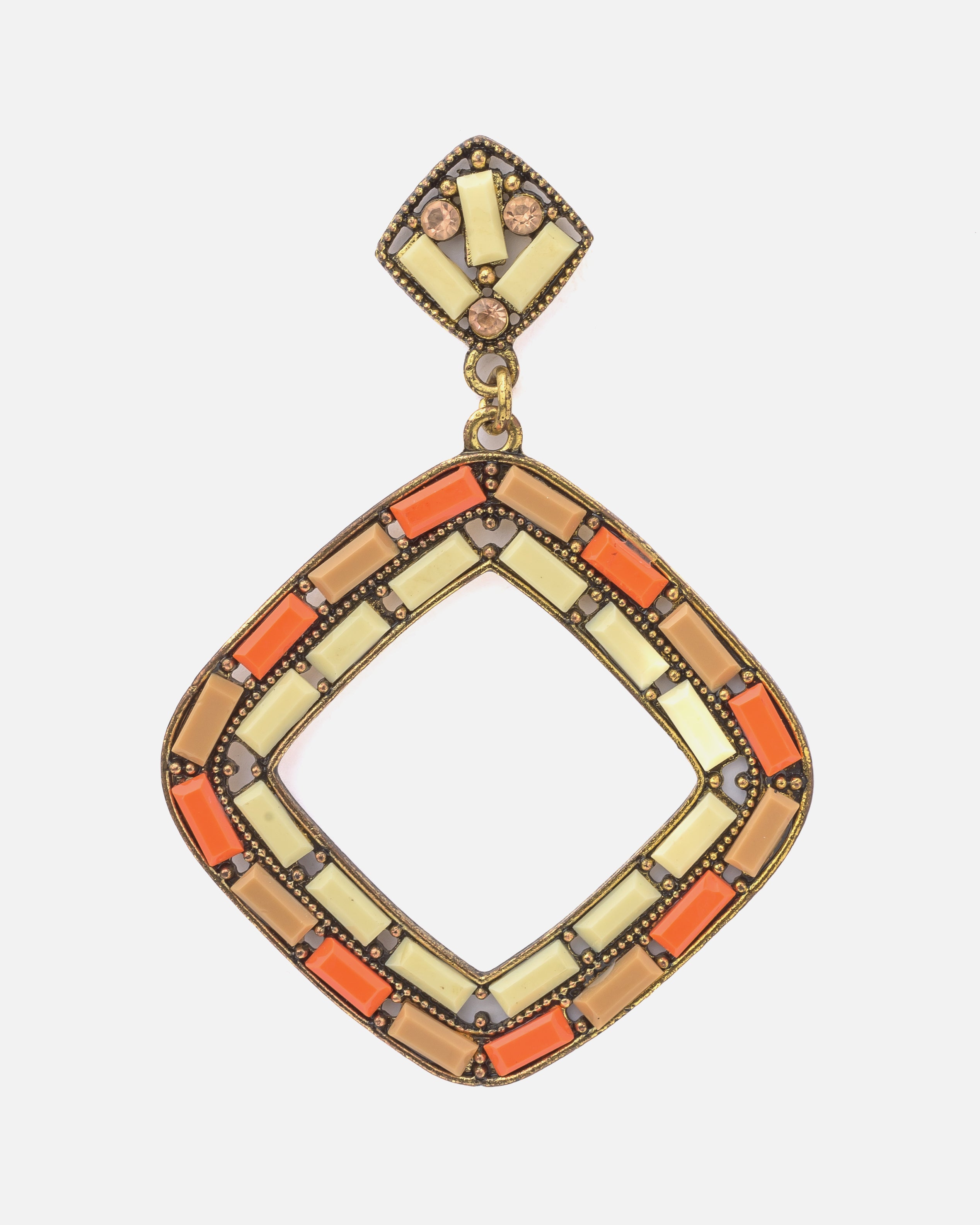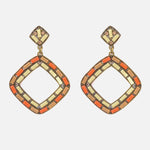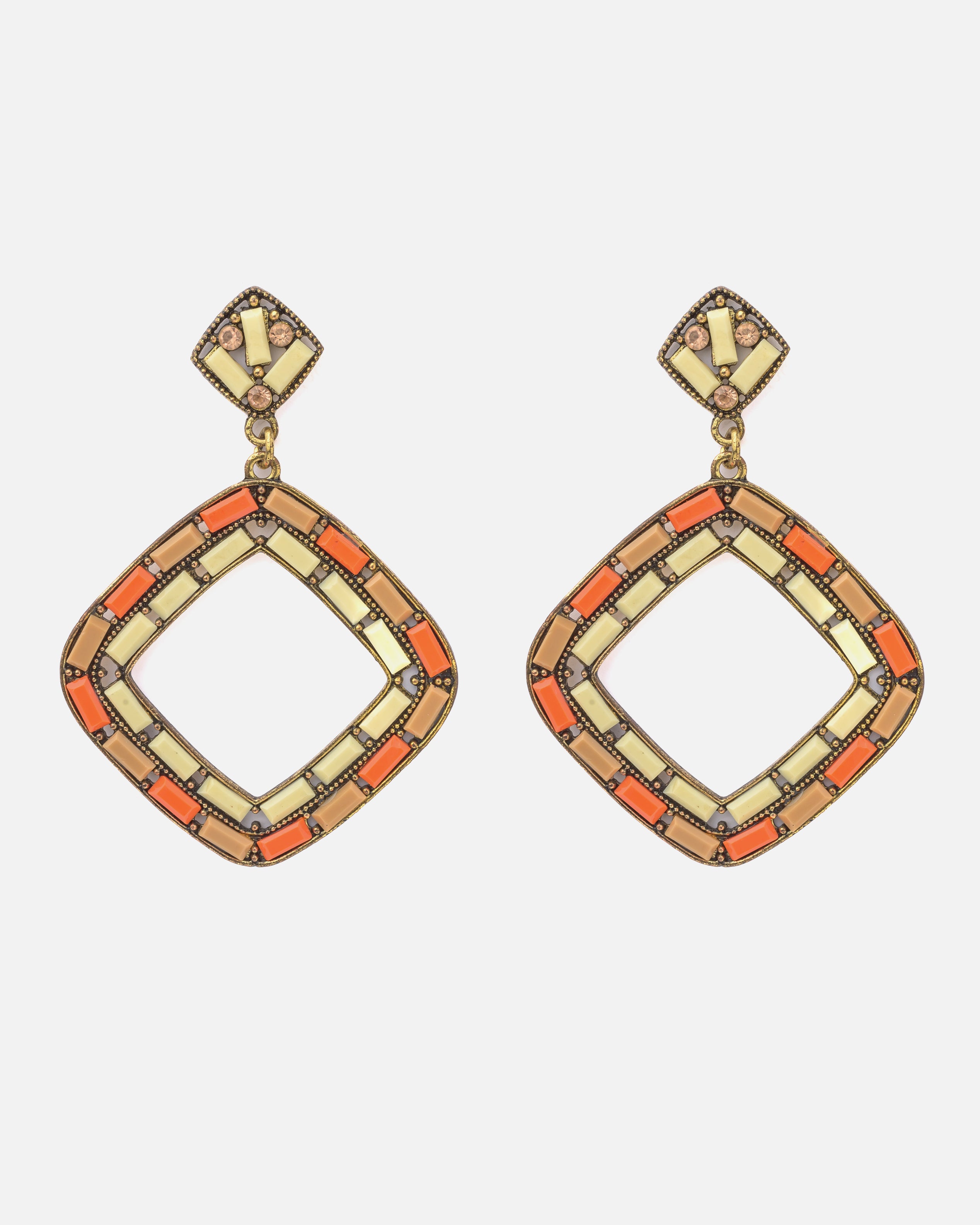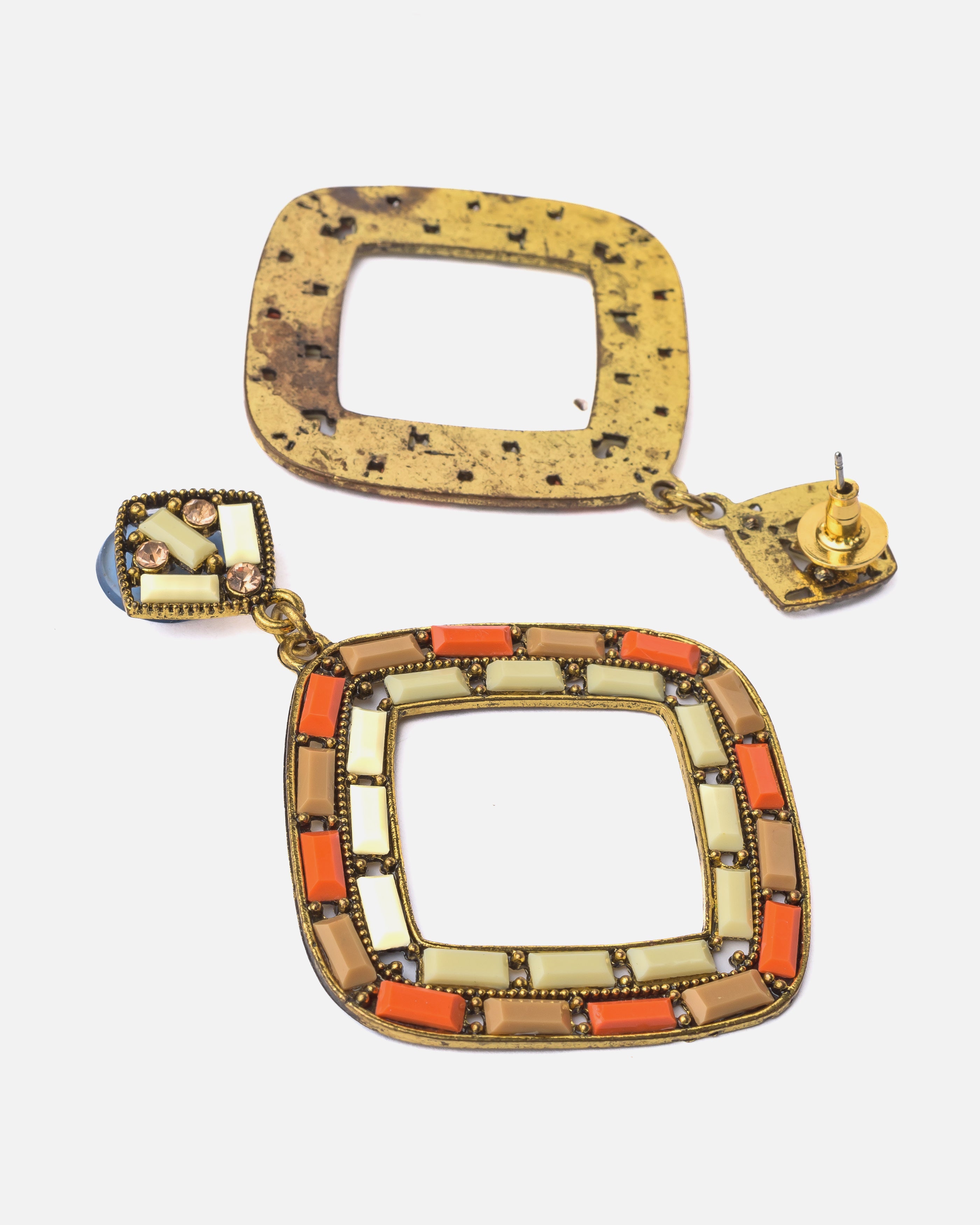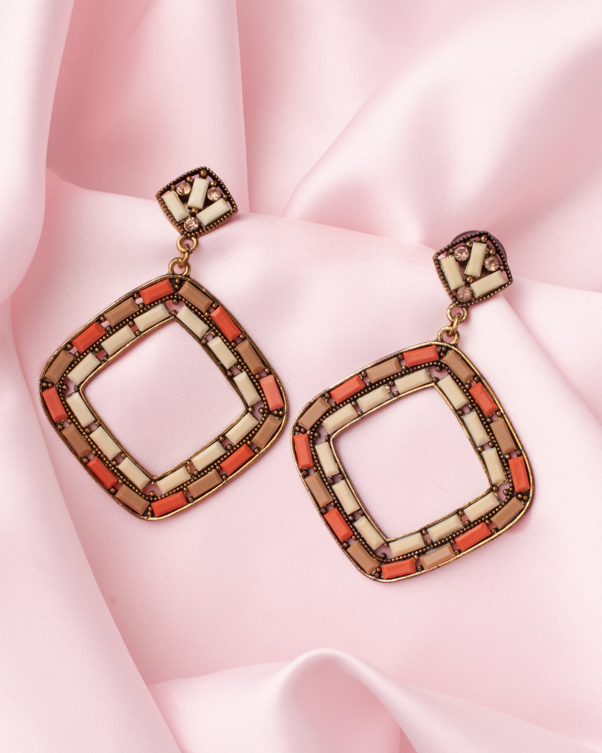 Stylish geometric dangle earrings with an antique gold-tone finish, accented with coral and cream enamel detailing. Lightweight and trendy, perfect for adding a chic, vintage-inspired touch to any outfit.