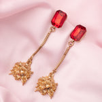 Elegant long-drop earrings featuring radiant red gemstones and intricate gold detailing. Perfect for special occasions, these lightweight earrings add a touch of glamour and sophistication to any outfit.