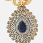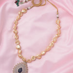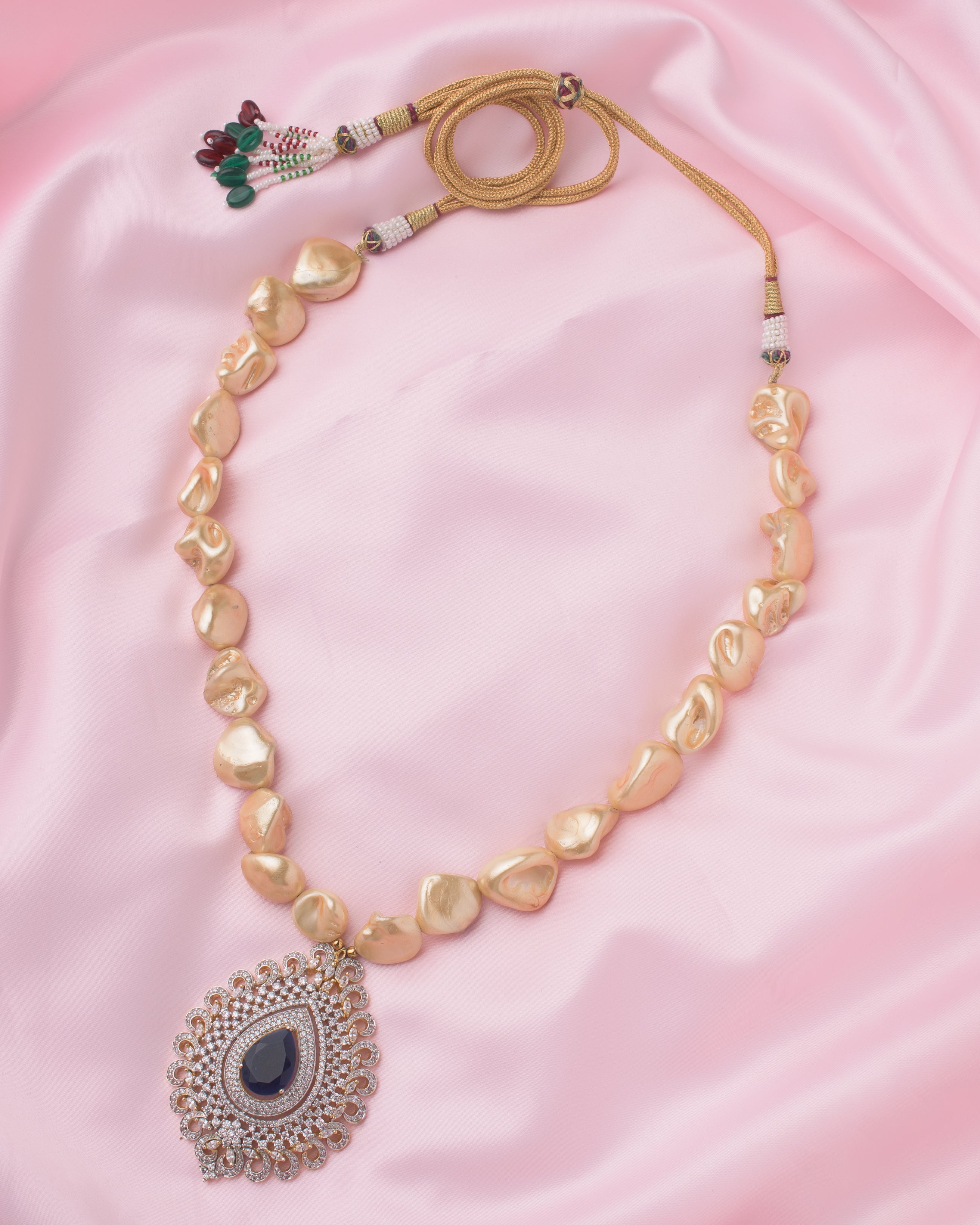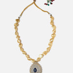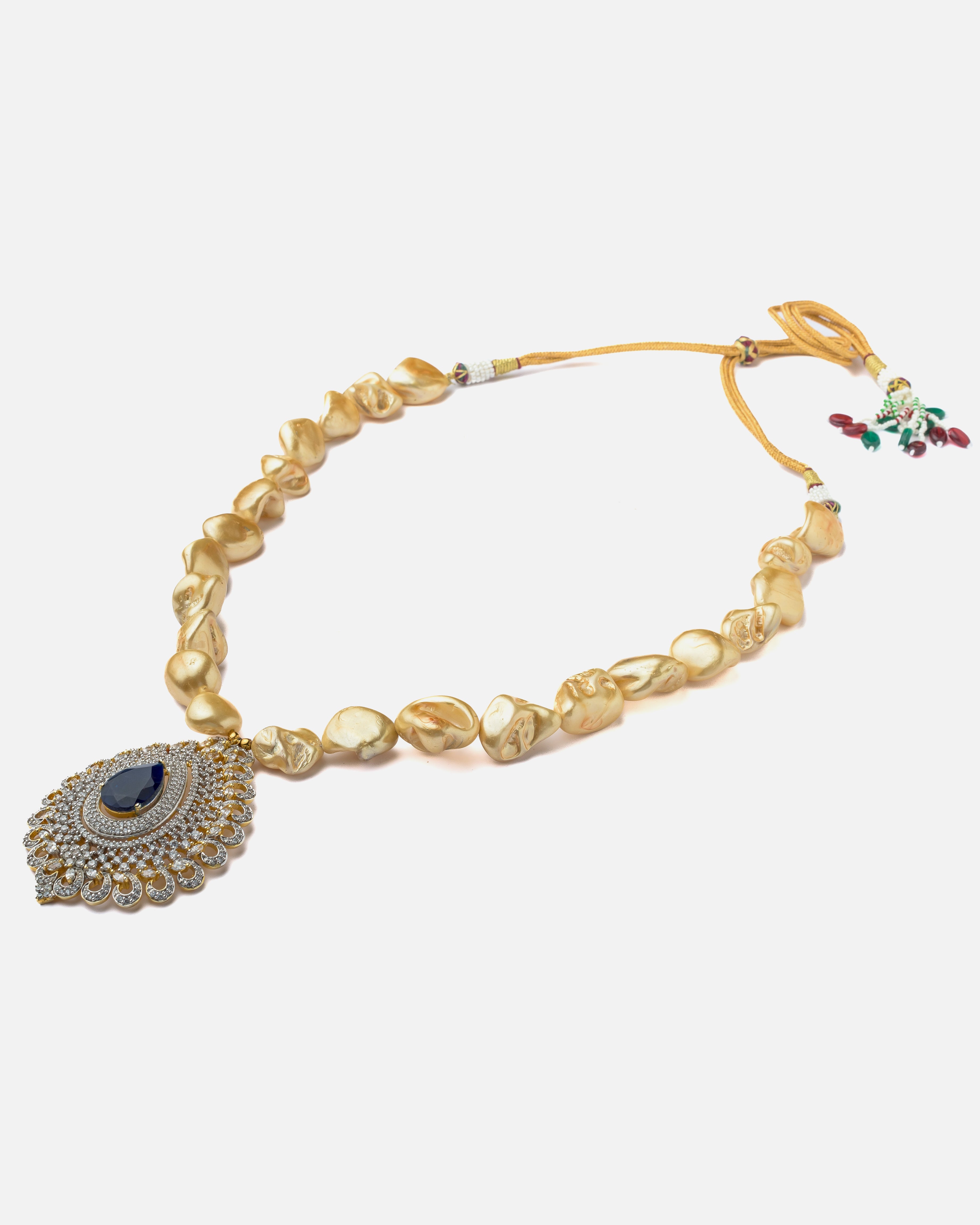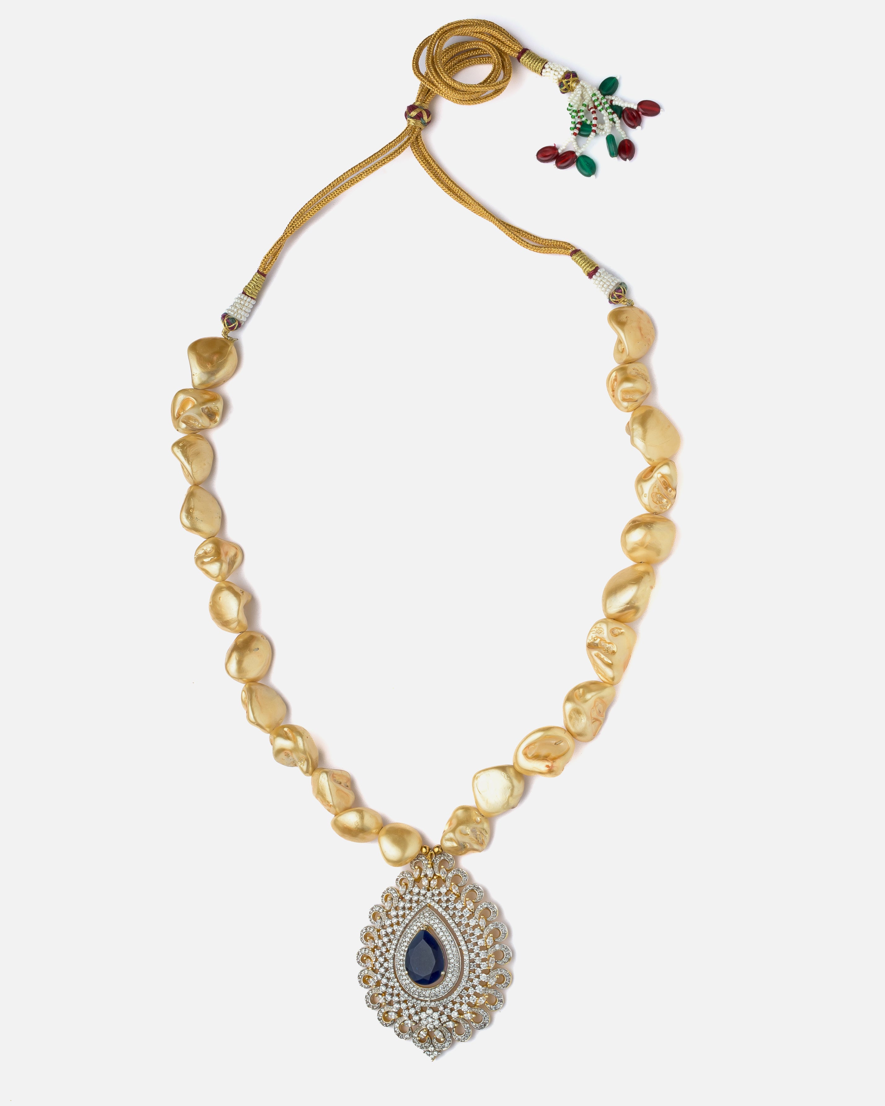 Elegant gold-toned necklace featuring textured nugget-style beads and a stunning statement pendant adorned with sparkling crystals and a deep blue gemstone. A perfect blend of tradition and luxury for special occasions.