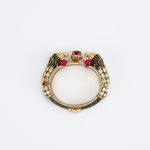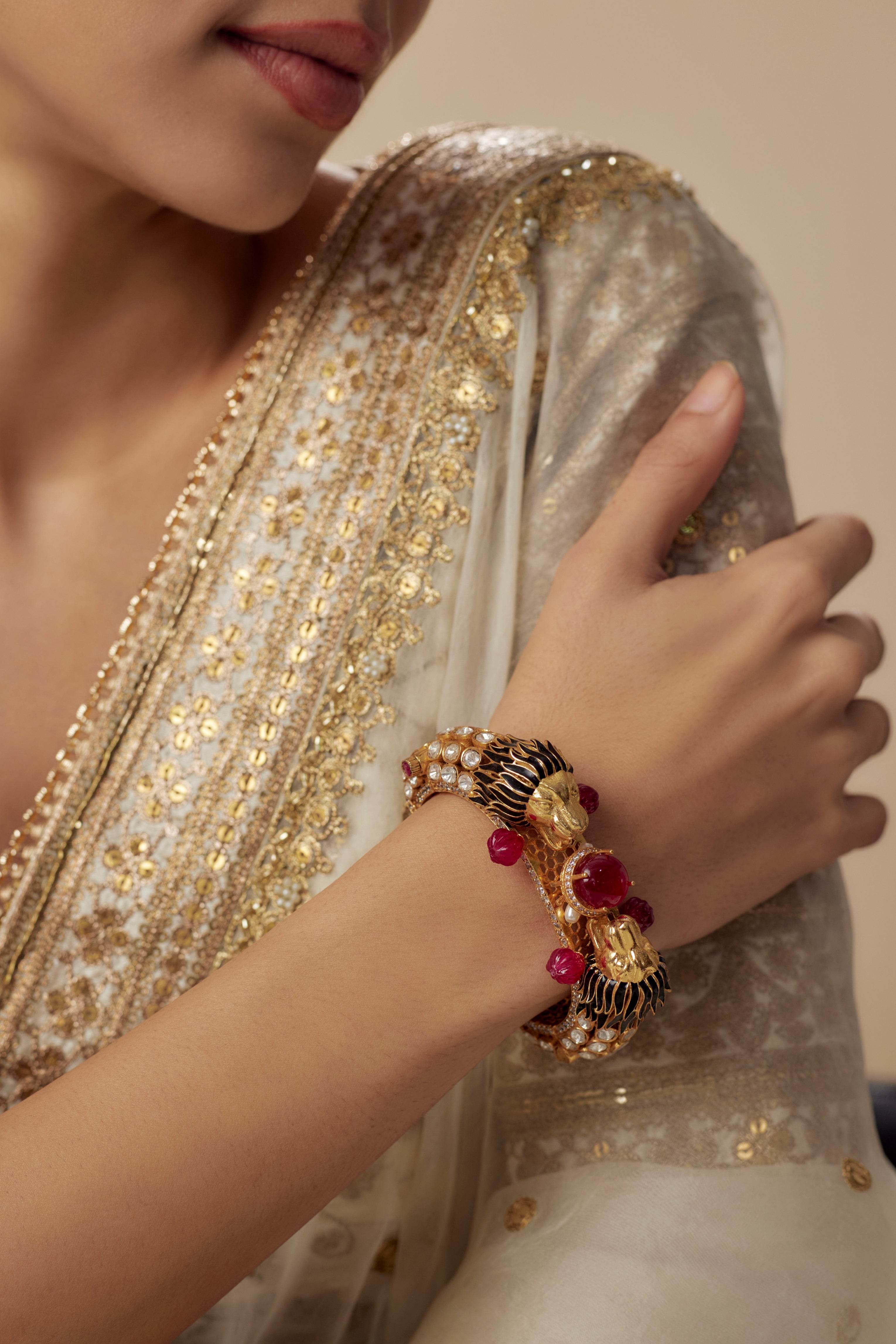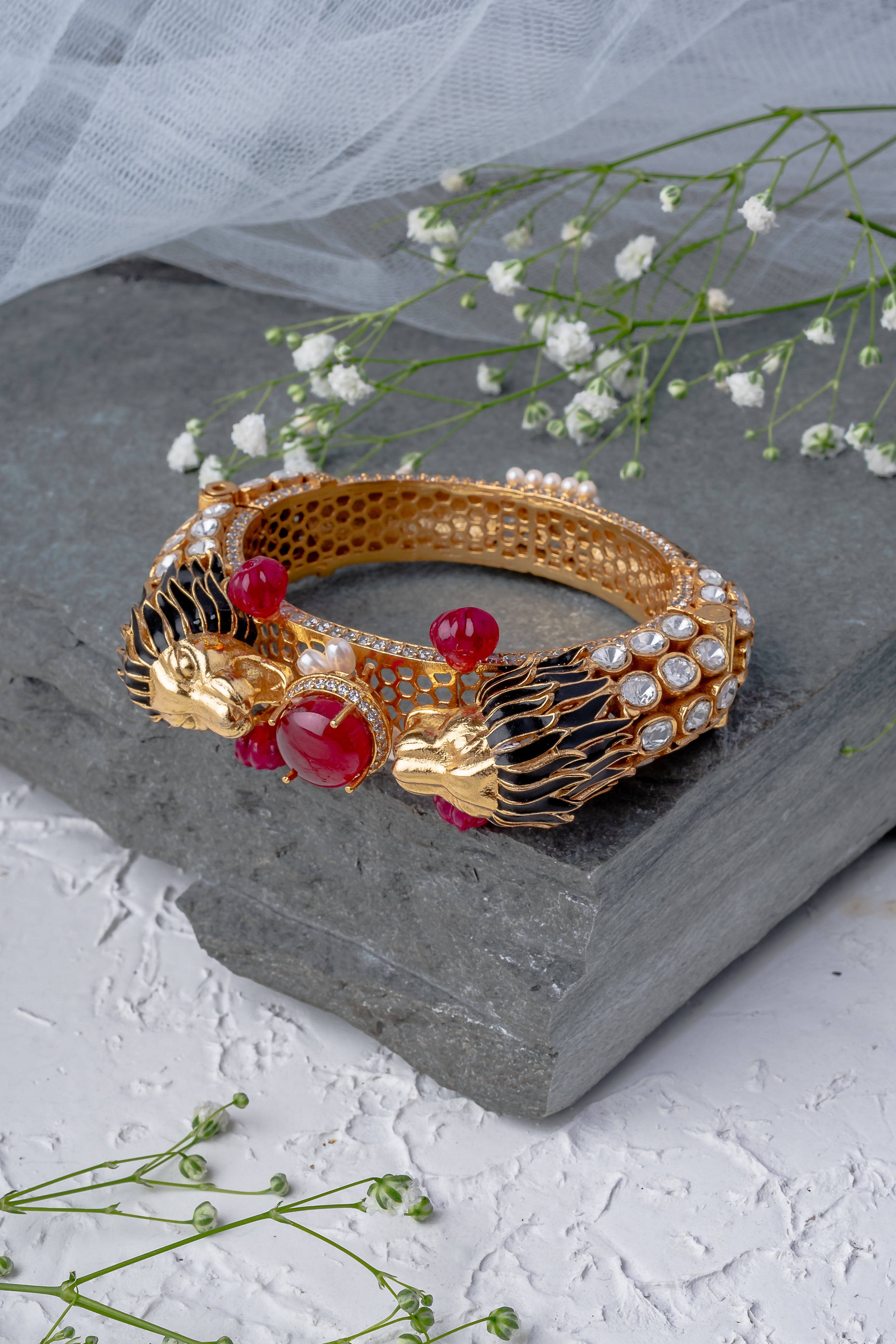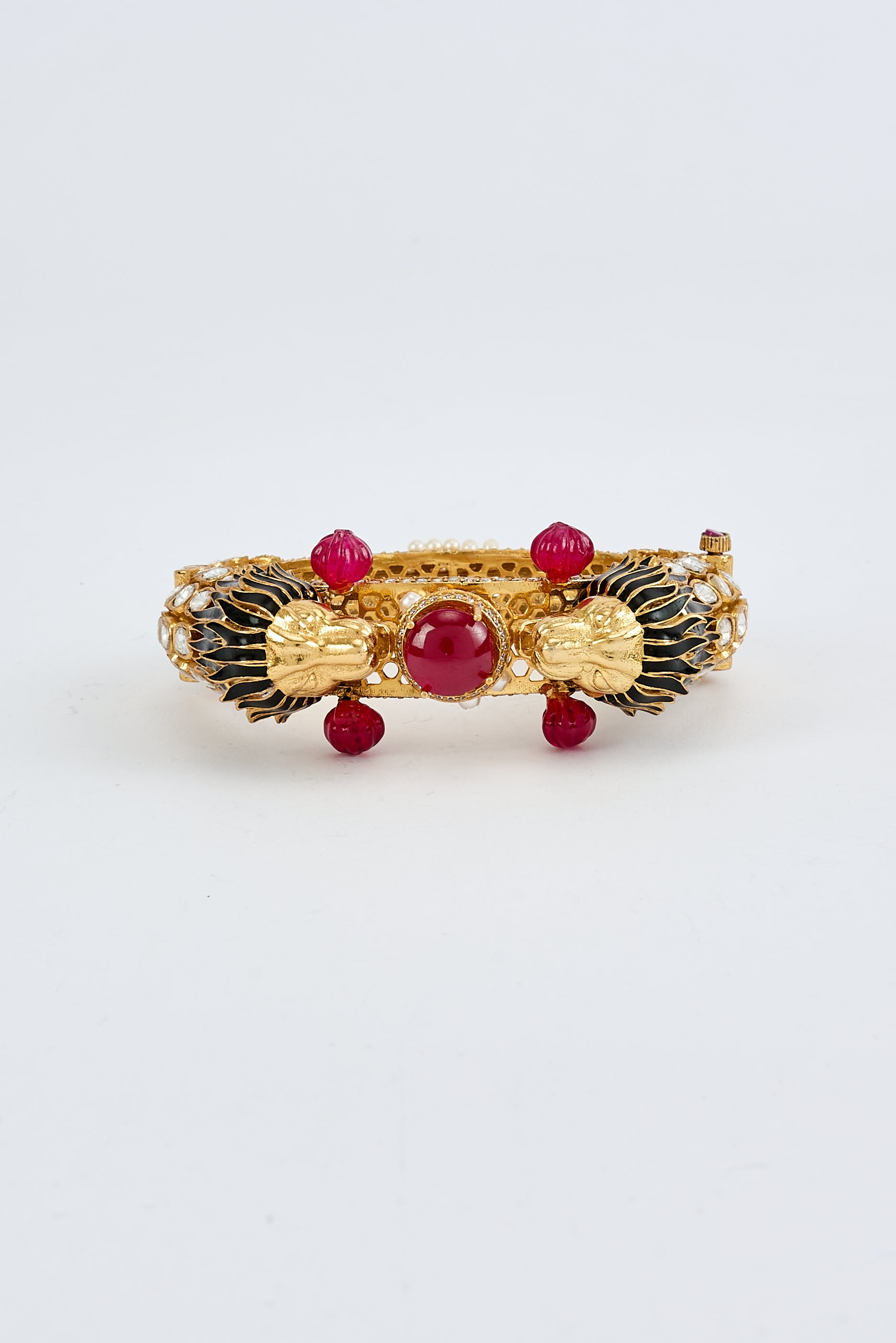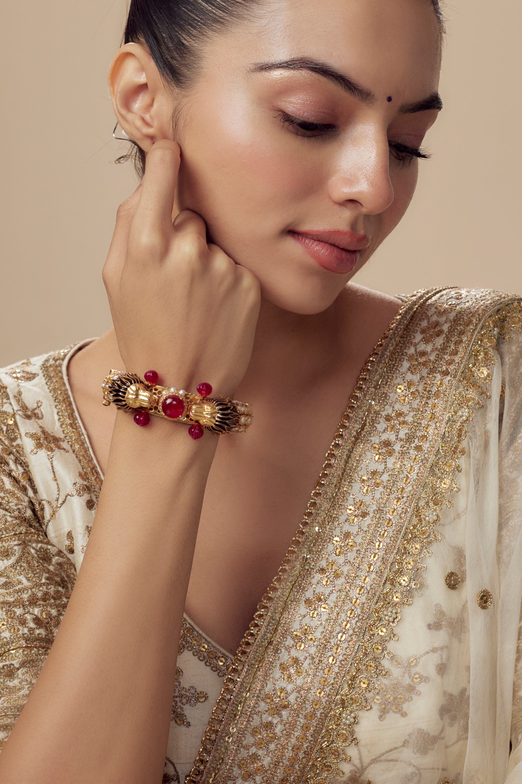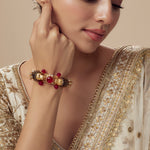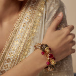 Elegant handcrafted bracelet adorned with vibrant red stones and intricate gold-tone detailing. A perfect blend of traditional charm and contemporary design, ideal for festive or special occasions.