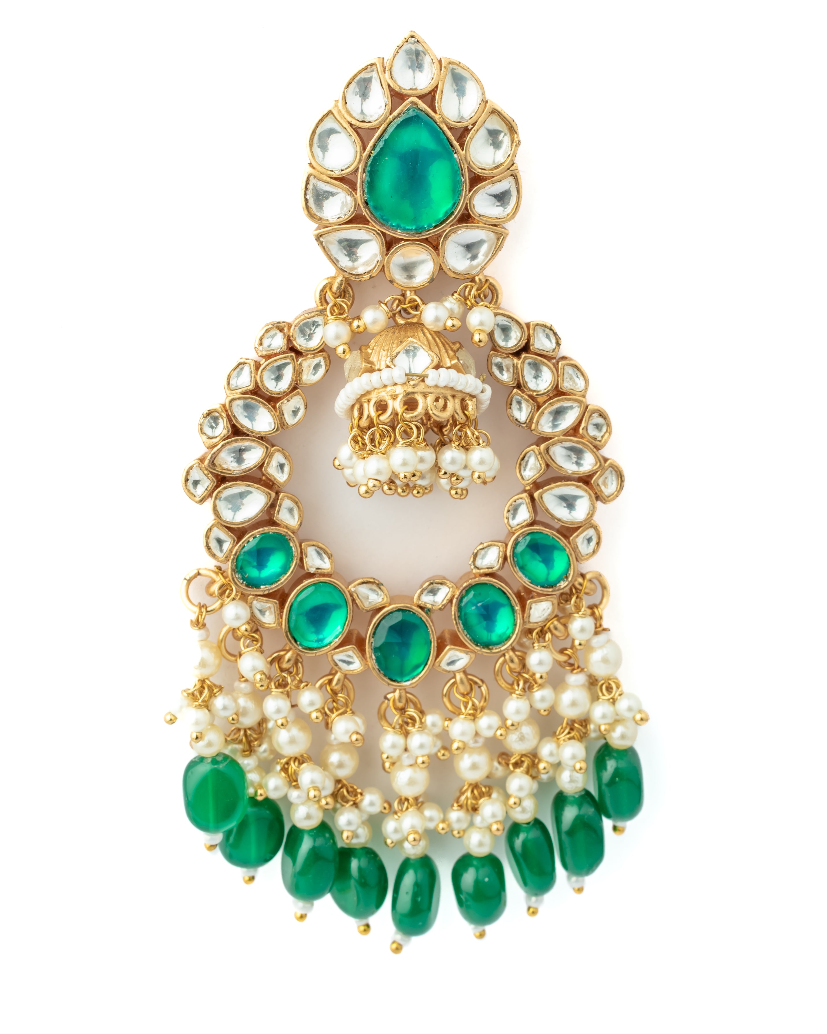 Elegant gold-plated chandelier earrings adorned with sparkling kundan, green gemstones, and pearl drops. A perfect blend of tradition and glamour for weddings & festive occasions.