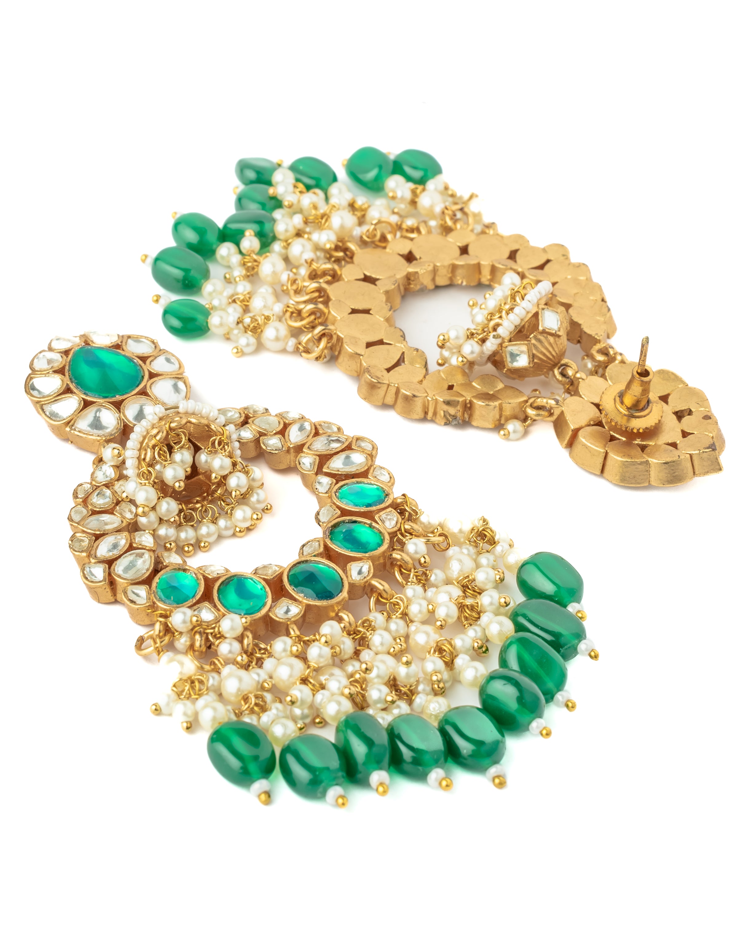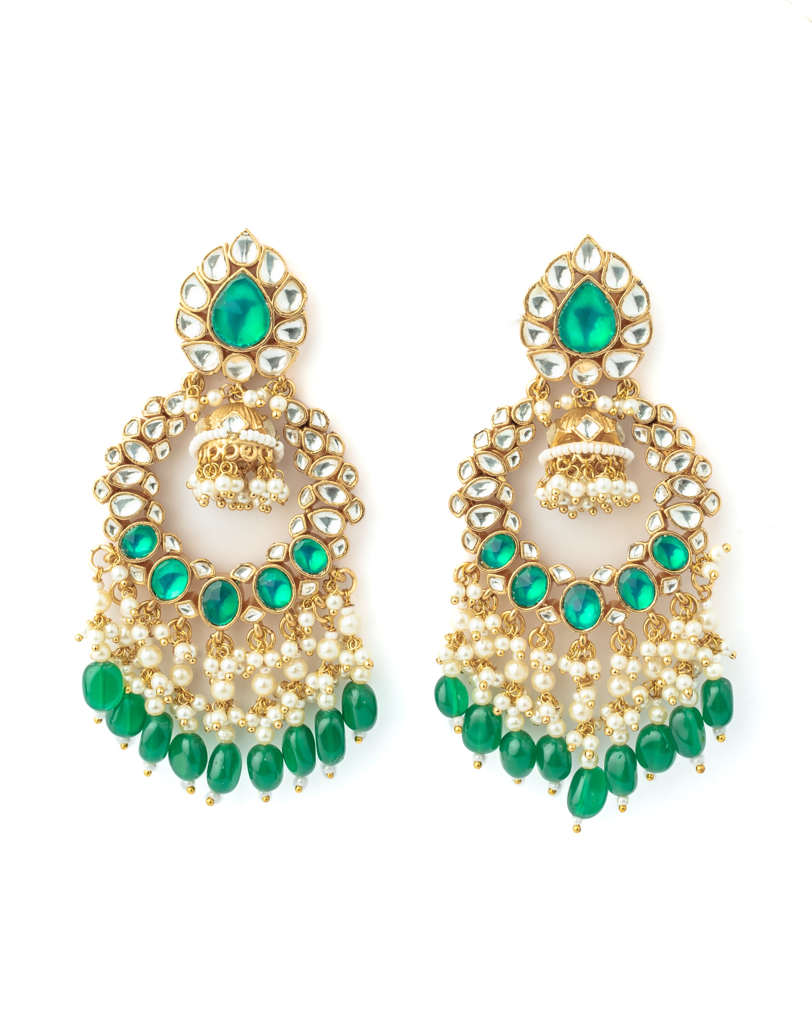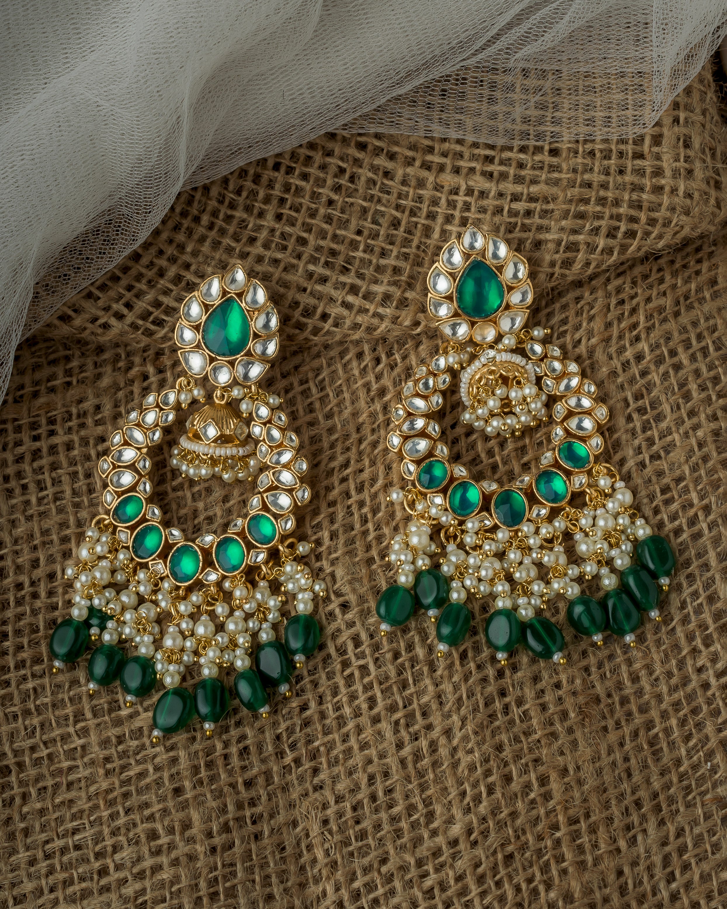 • Exquisite Design – Gold-plated chandelier earrings with intricate kundan work and green gemstone embellishments.